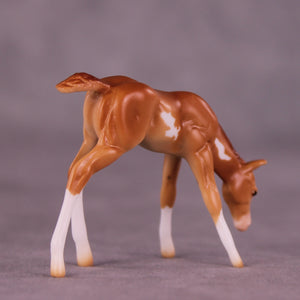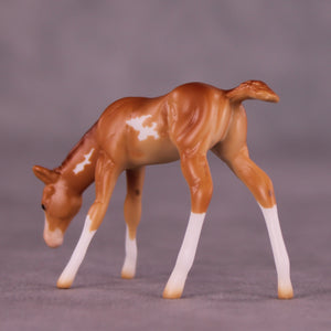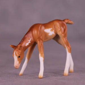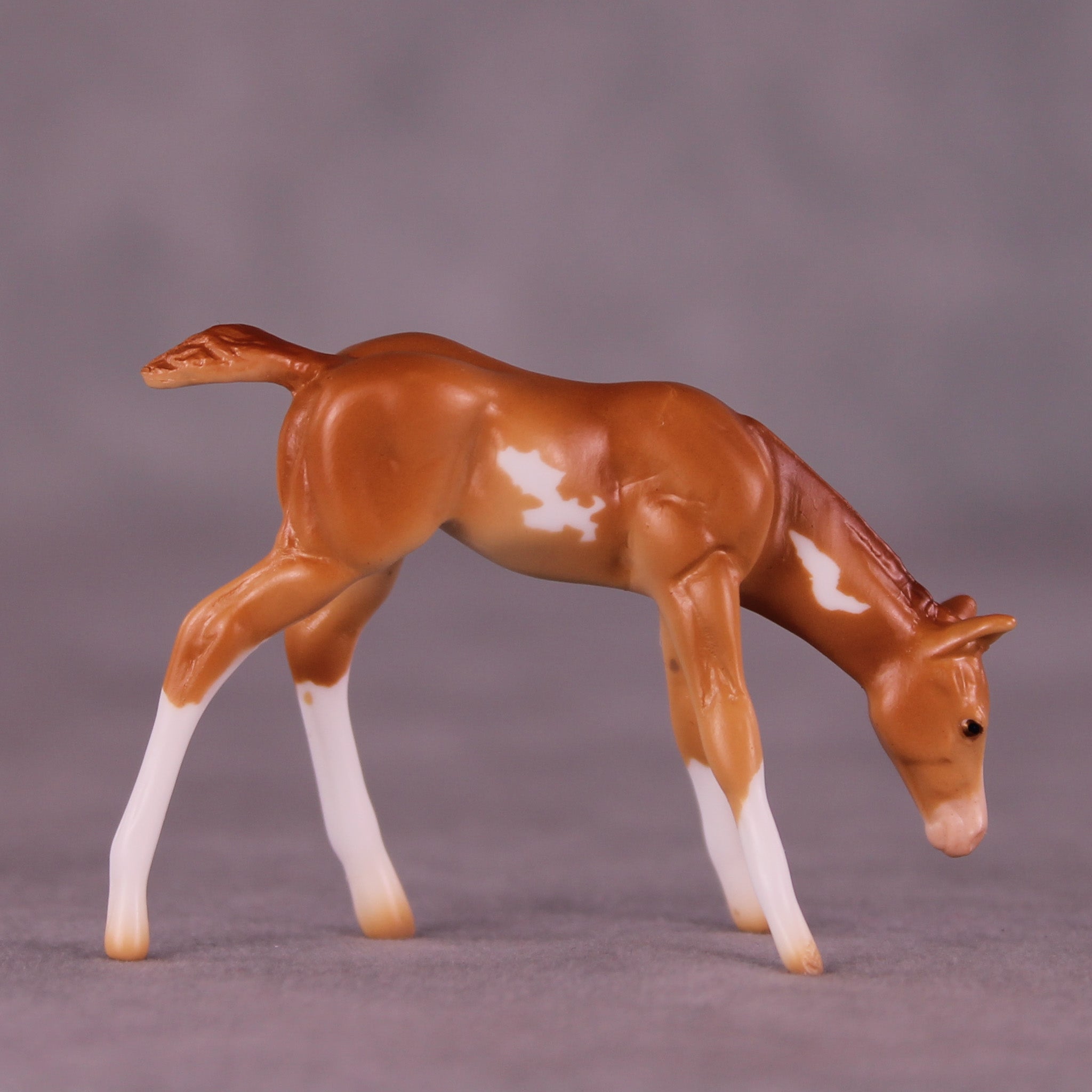 We’re not finished sharing Erika Isbell pieces with you! Meet Willow – our Chip Foal with a dramatic new look. Erika customized her to a fully head-down grazing position, and she has moved her front legs and redone her whole neck and shoulder anatomy accordingly. She is then painted to a lovely toasty baby chestnut overo with just the right amount of contrast and an adorably correct pinto pattern.