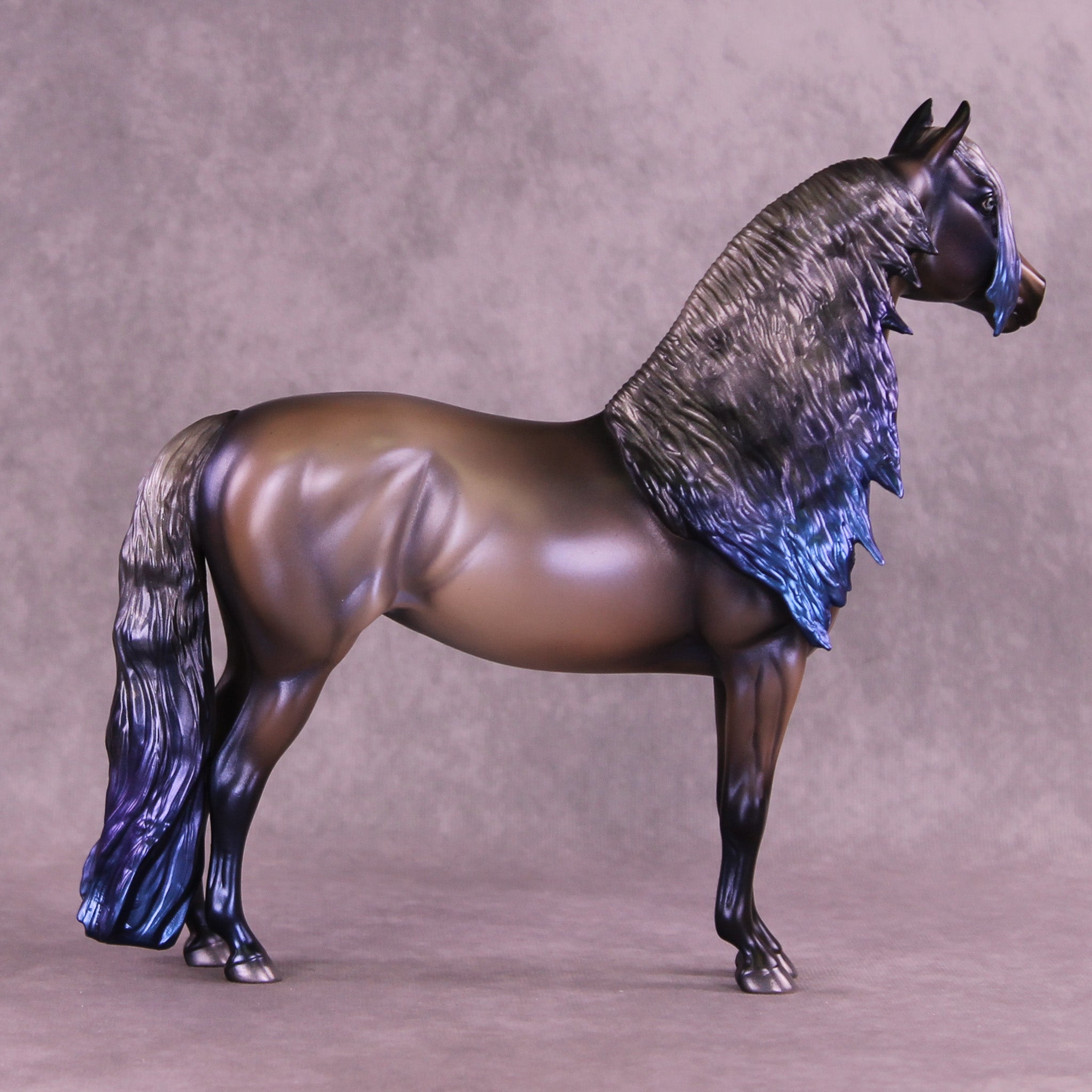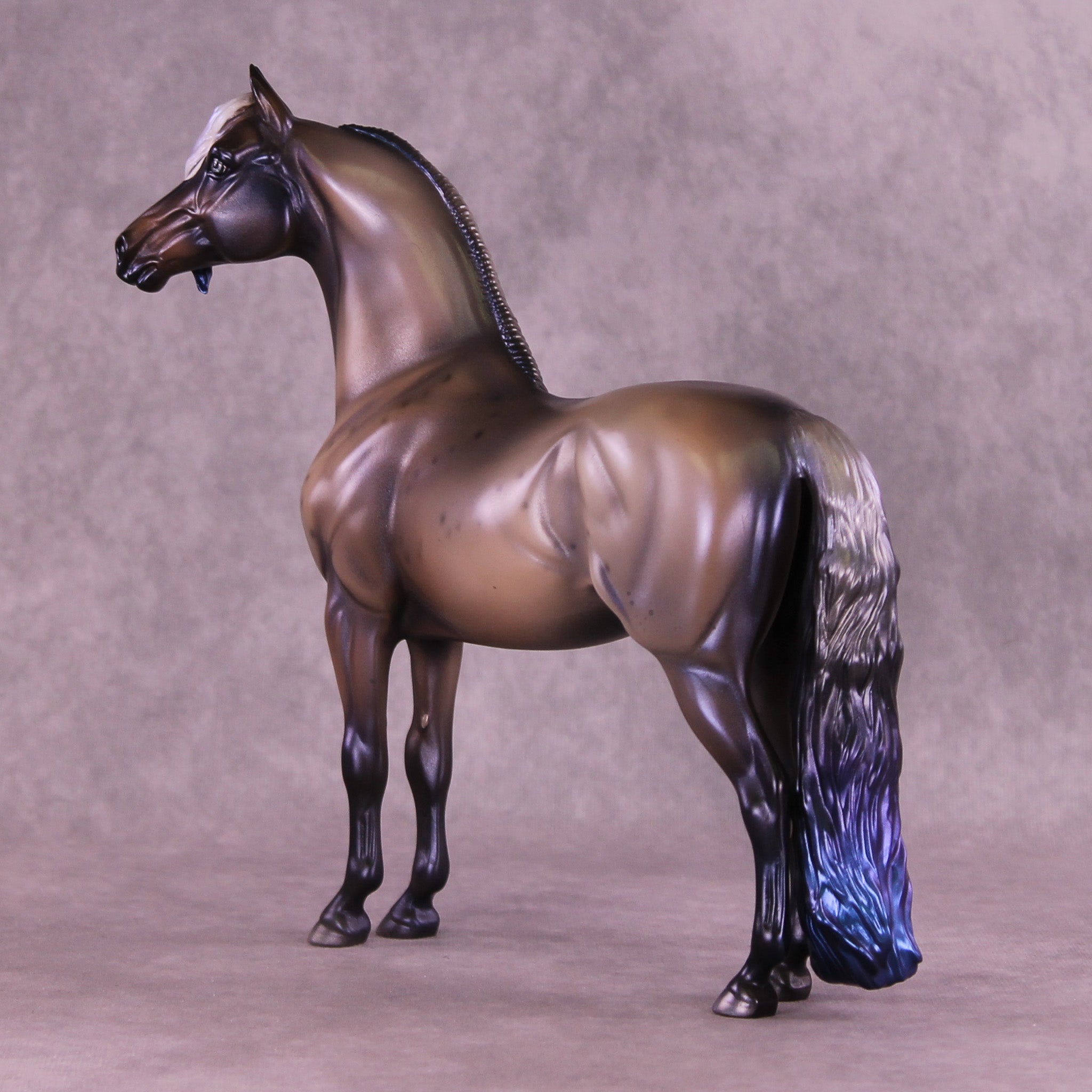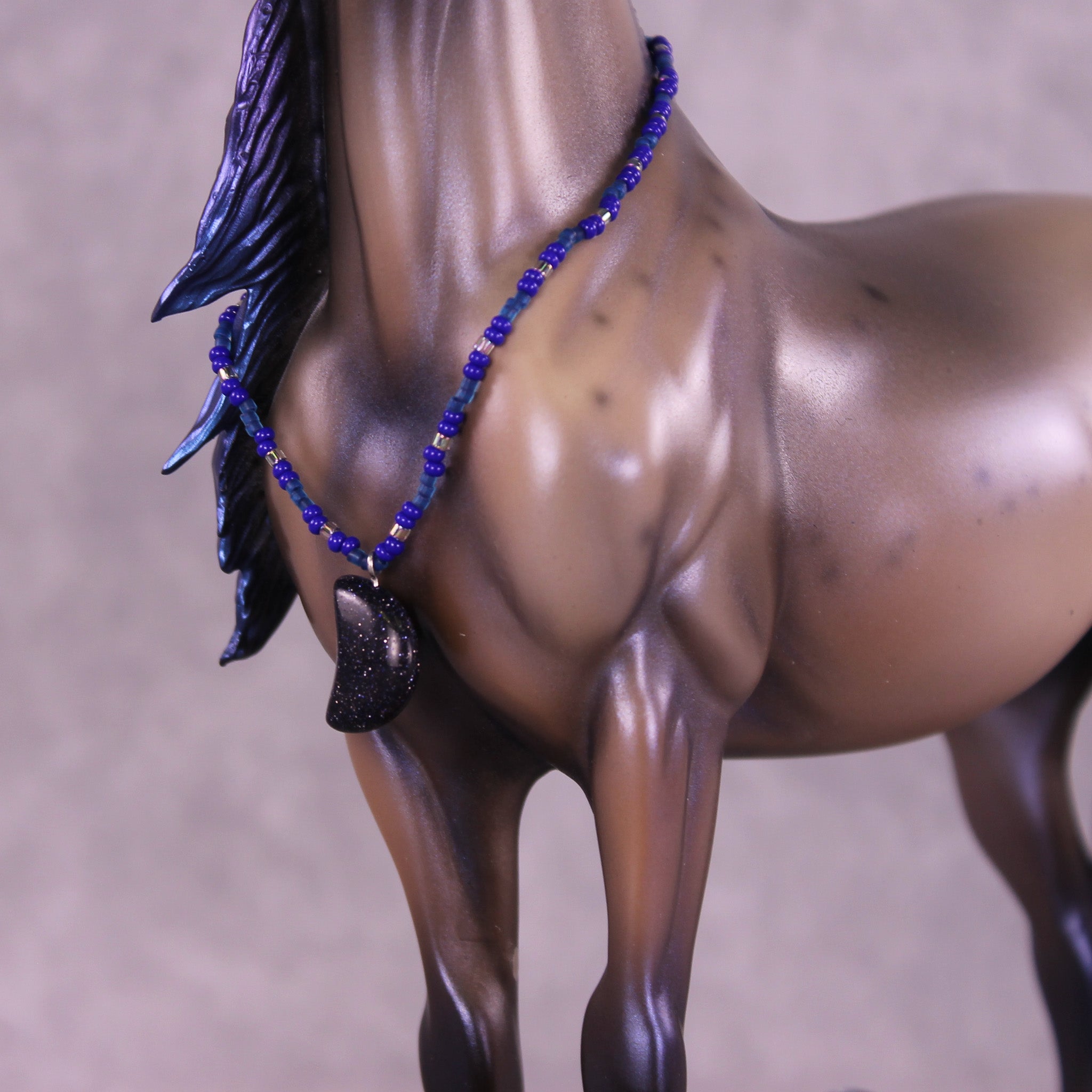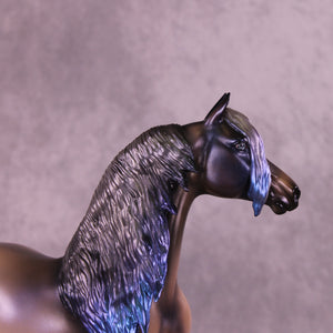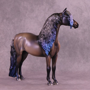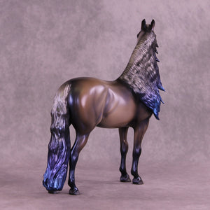 Witches Road is a morgan customized to a mare with an extra long customized mane and forelock and her wavy tail. Her character is made with inspiration from Marvels Agatha Harkness cartoon and TV series. She is painted into a magical bay-ish-blue roan with blue interference paint on body, and a moon shaped star. Her mane, tail and forelock have blue dyed tips, her forelock also features a white stripe as a reference to the cartoon version of her. Her mane, tail and forelock also have holographic silver shades as well. Her corn spots are in the pattern of the Eridanus star constellation, because The Witch Head Nebula is located approximately 900 light years away in that constellation.