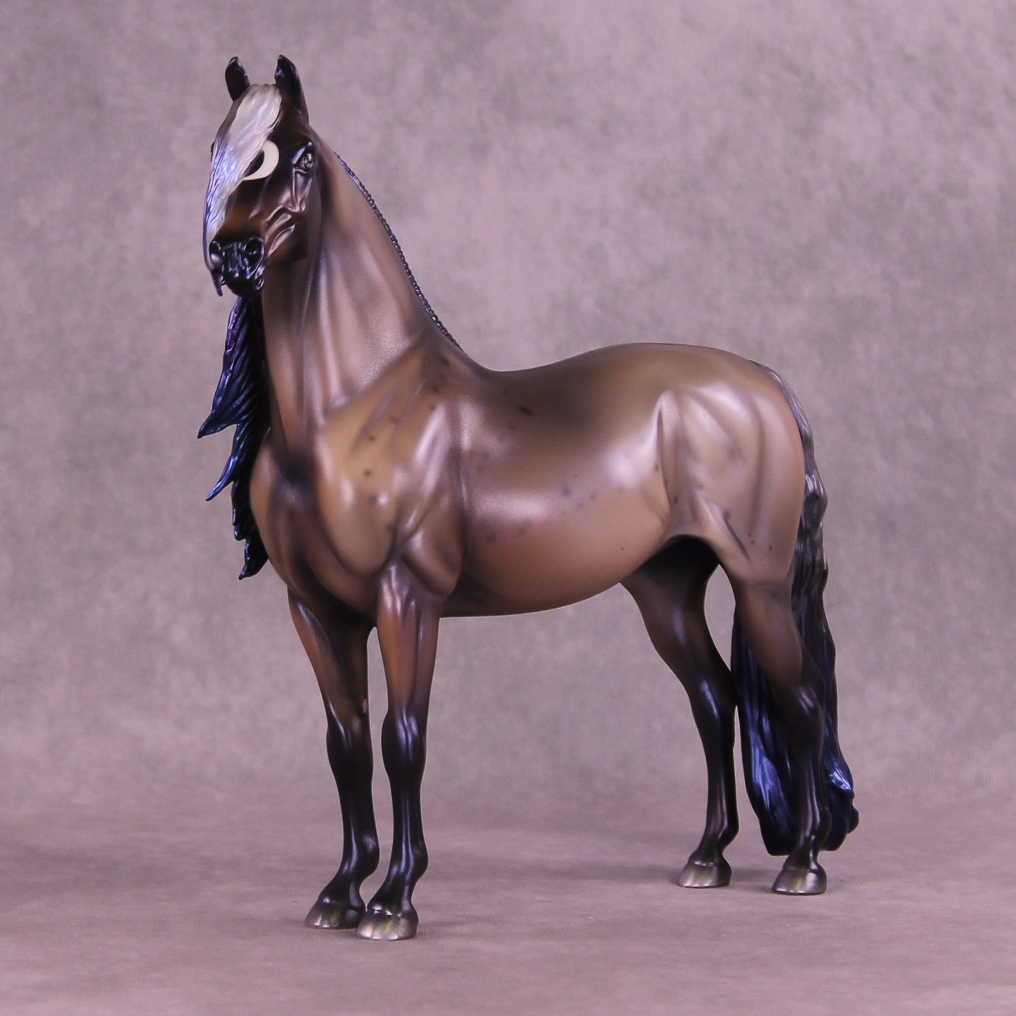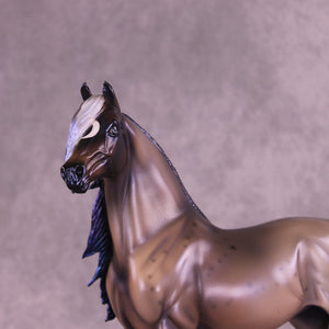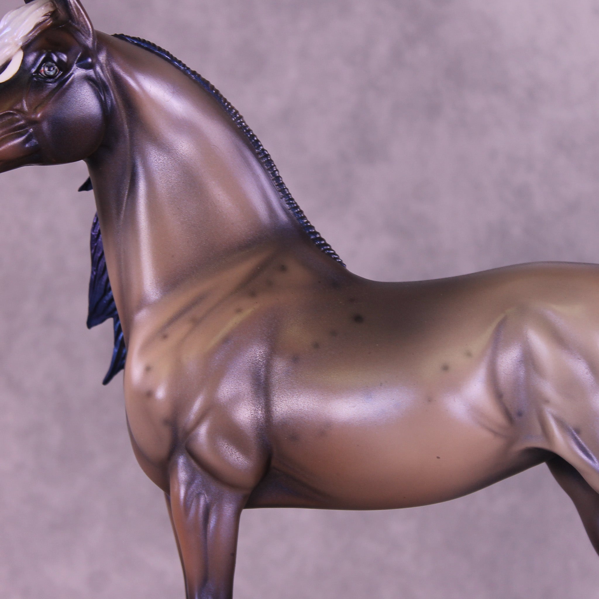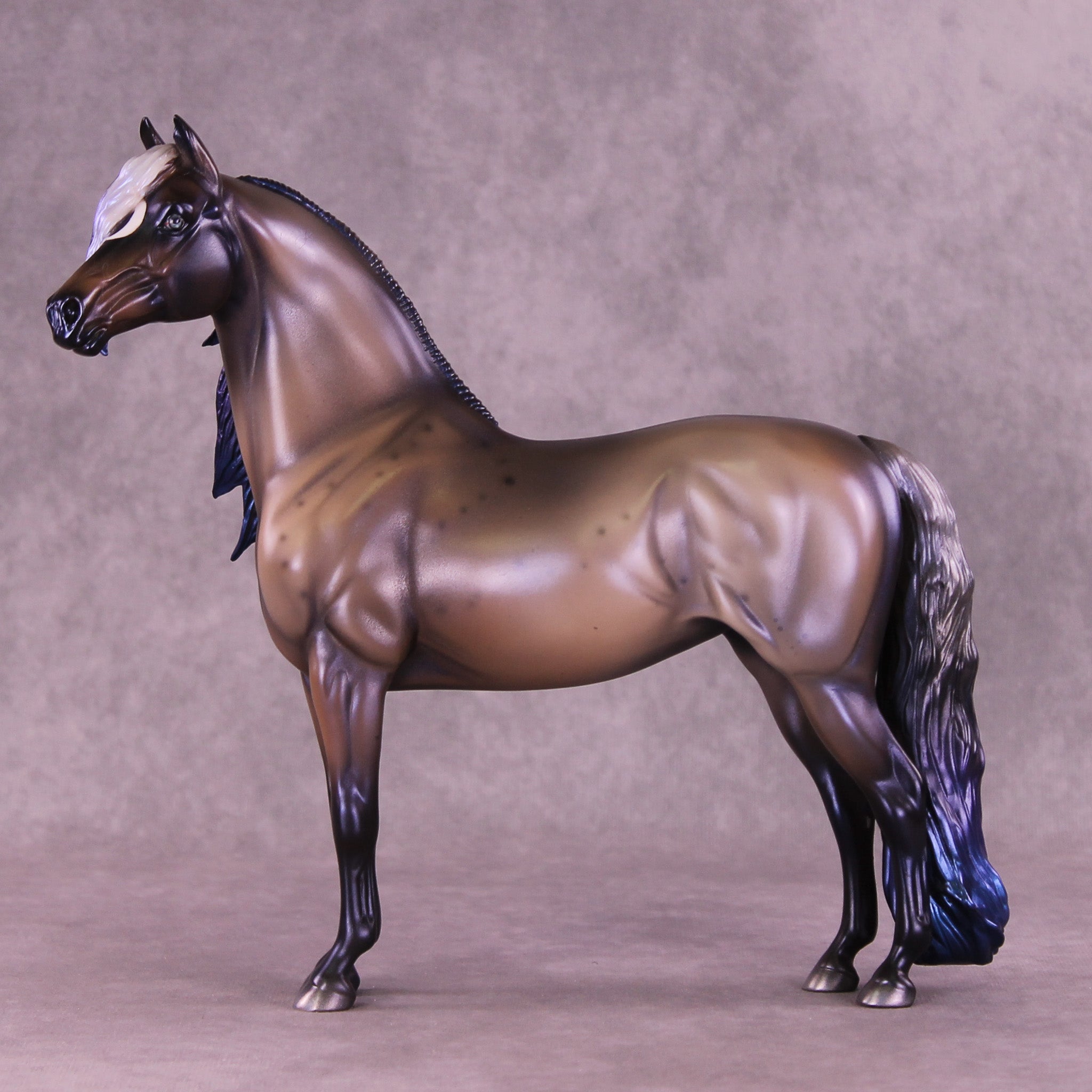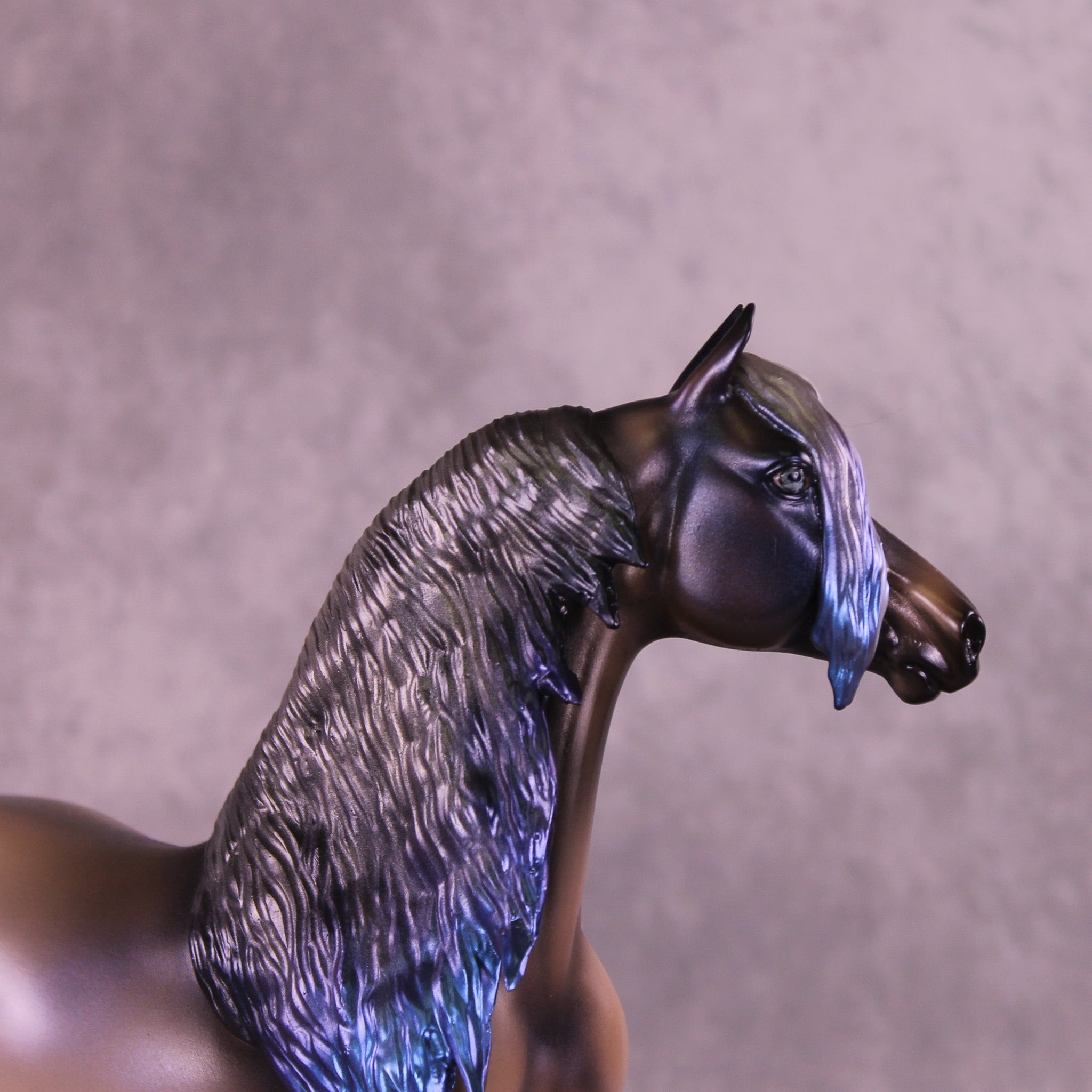Witches Road is a morgan customized to a mare with an extra long customized mane and forelock and her wavy tail. Her character is made with inspiration from Marvels Agatha Harkness cartoon and TV series. She is painted into a magical bay-ish-blue roan with blue interference paint on body, and a moon shaped star. Her mane, tail and forelock have blue dyed tips, her forelock also features a white stripe as a reference to the cartoon version of her. Her mane, tail and forelock also have holographic silver shades as well. Her corn spots are in the pattern of the Eridanus star constellation, because The Witch Head Nebula is located approximately 900 light years away in that constellation.