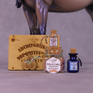 She comes with a trove of extras, as well. These include a customized witch hat with beaded hat band, beaded necklace with stone moon pendant, three tiny vials with custom holographic labels and cork closures (one full of tiny witch cakes!), and a custom laser etched wooden Ouija board. (If you would like to decline any part of her extras we respect that 100%, just shoot us an email after your purchase and we will adjust as requested!)