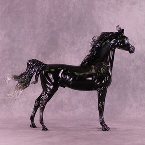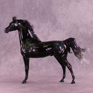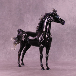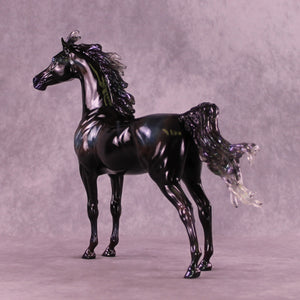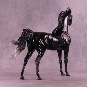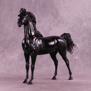 This is another of our brand new pieces featuring our new clear plastic! He has a stunning shimmery clear mane and wind tousled tail, and Ashley Palmer finished him in a gorgeous space pattern with a cat’s eye nebula, comets, other nebulas, and TONS of pearl to bring out the shimmer across his whole design. He is finished in gloss and no finish changes are available.