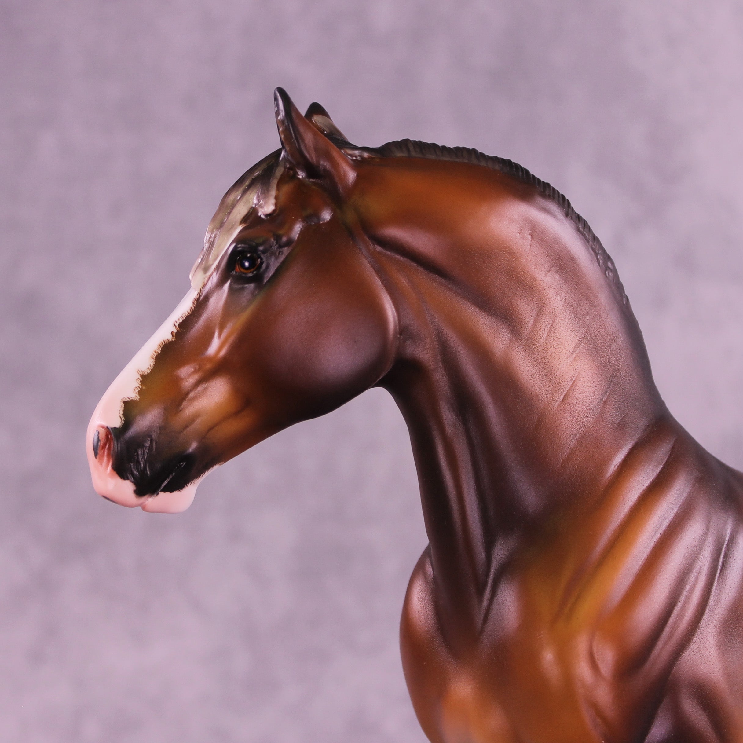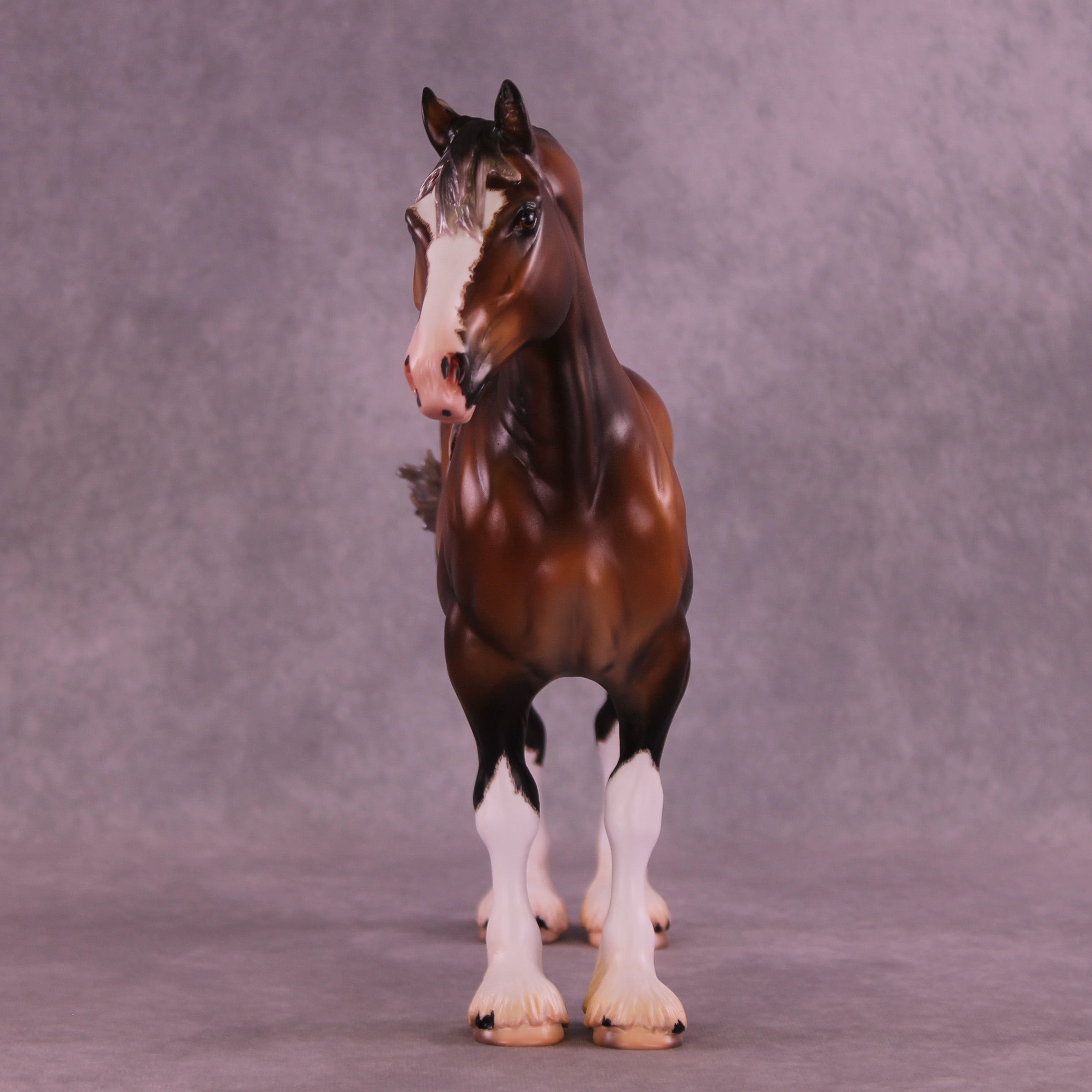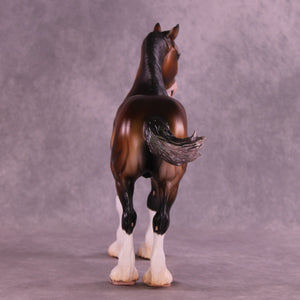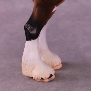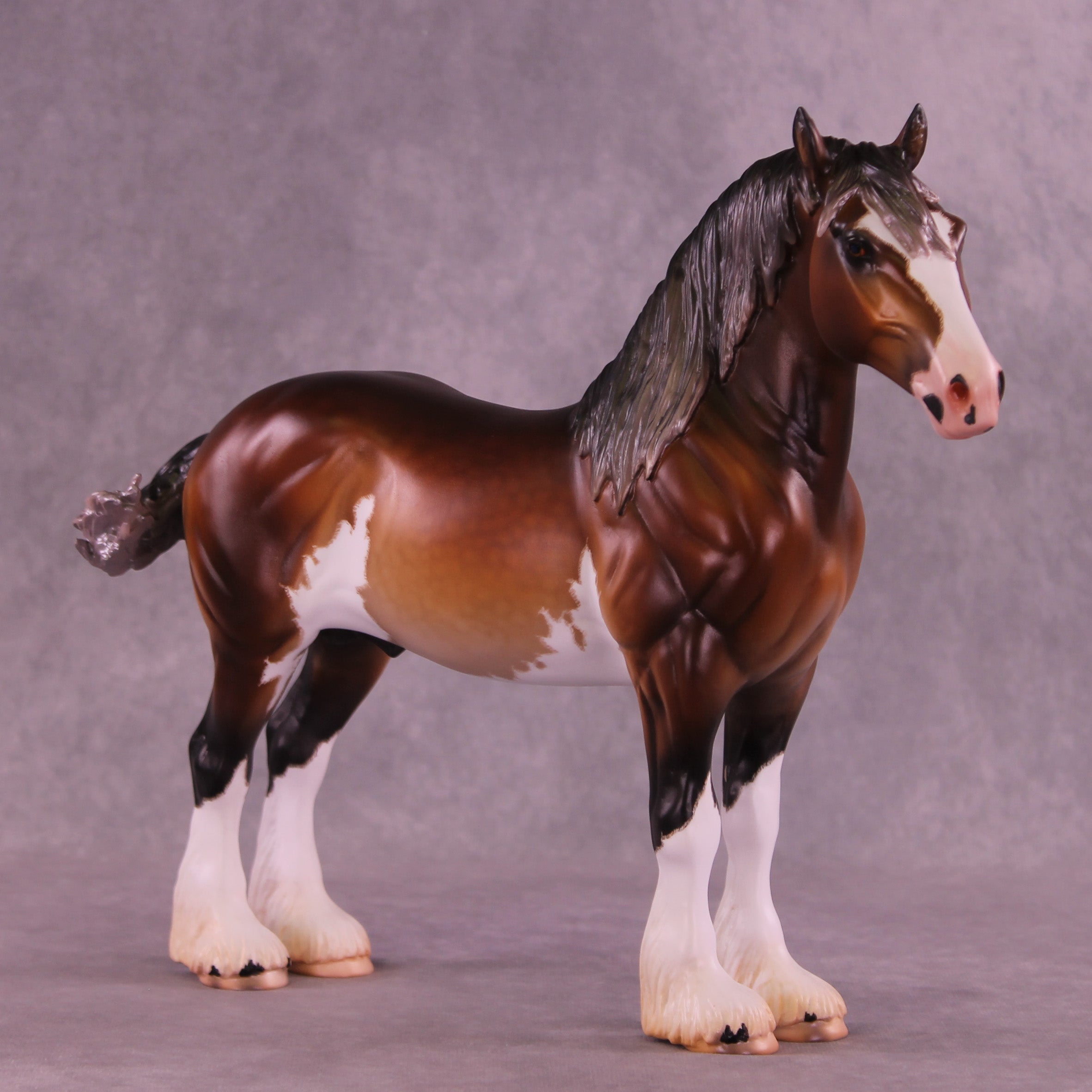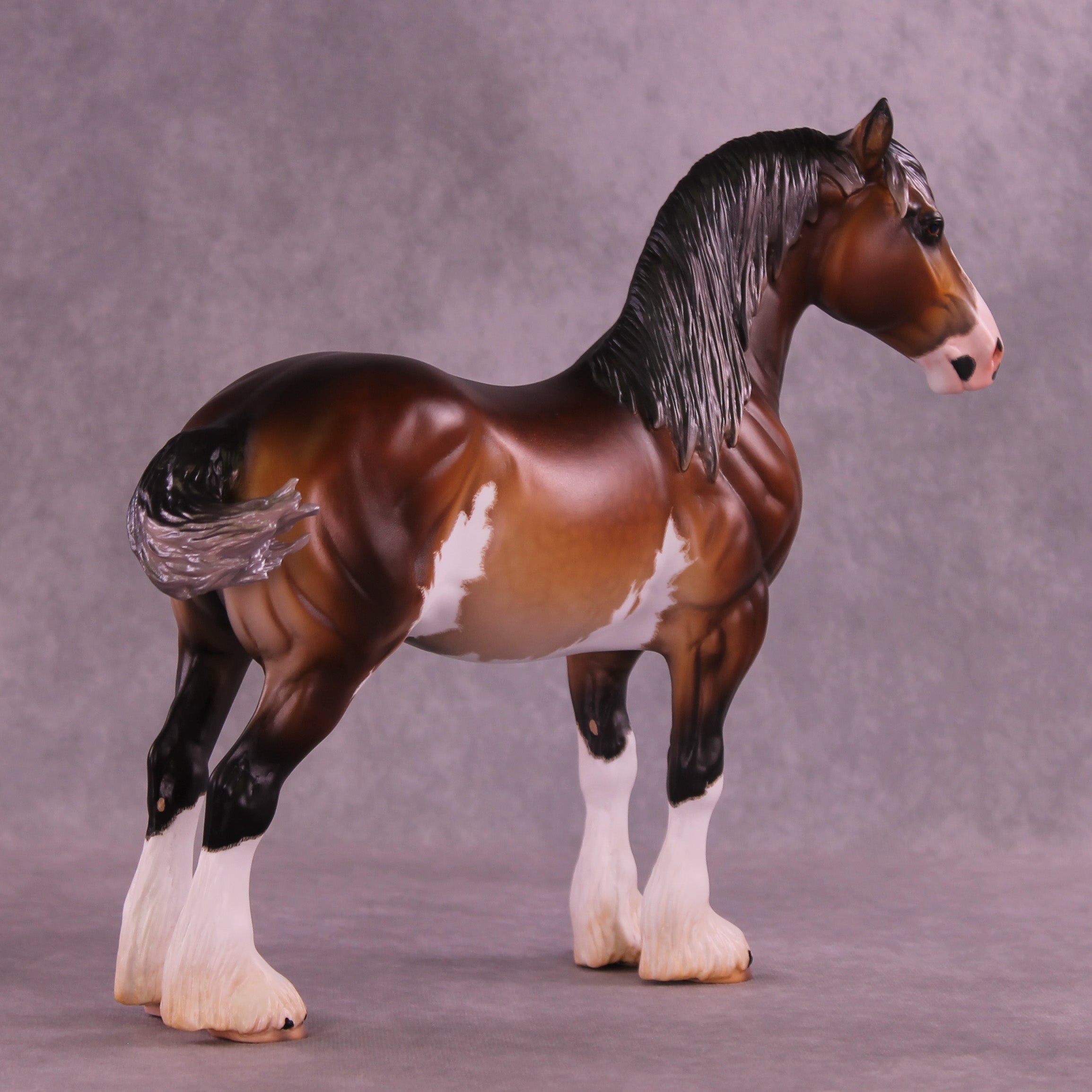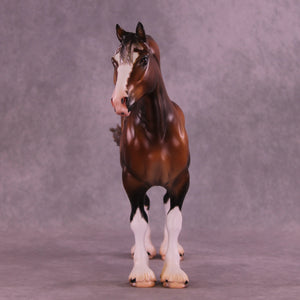 This piece is so cool!! Mel took our Standing Drafter sculpture and gave him a total makeover into a clydesdale. She repositioned his head and neck to a gentle turn, twitched an ear to listen back, added feather on all four legs, refined his hooves, and gave him a whole new extra detailed long mane, forelock, and contentedly swishing tail. Caroline painted him to – of course – a stunning warm dappled bay sabino with etched markings, hoof stripes, ermine spots, kissy spots, and more. Just a truly outstanding piece. He is available in all finish options.