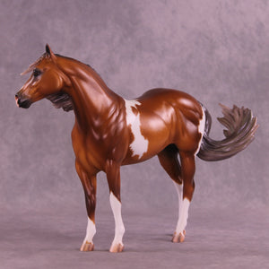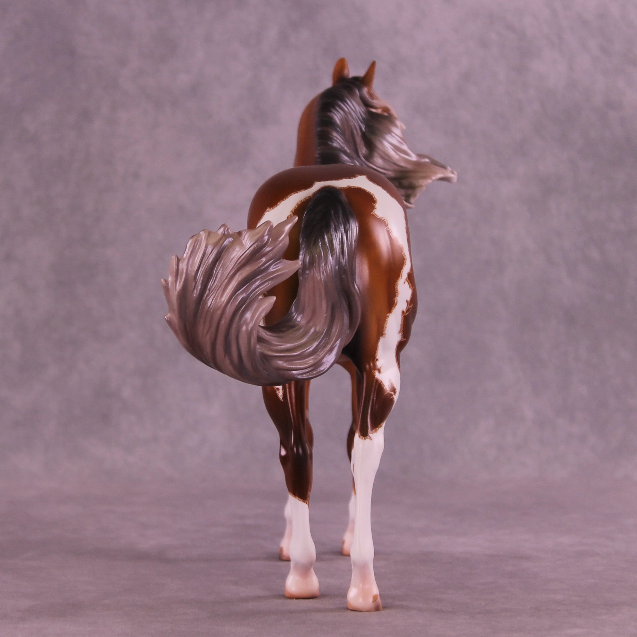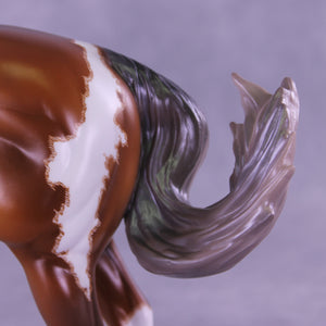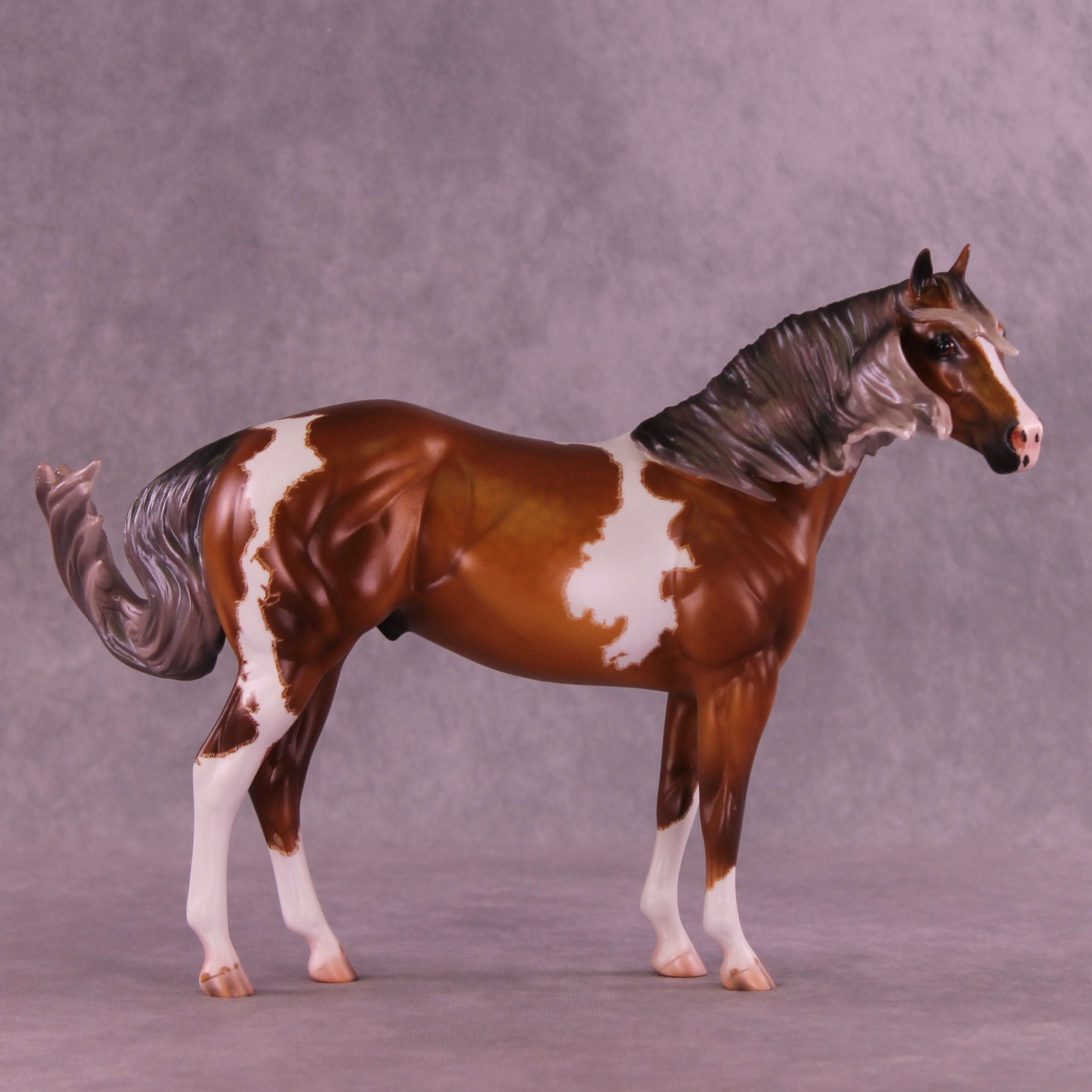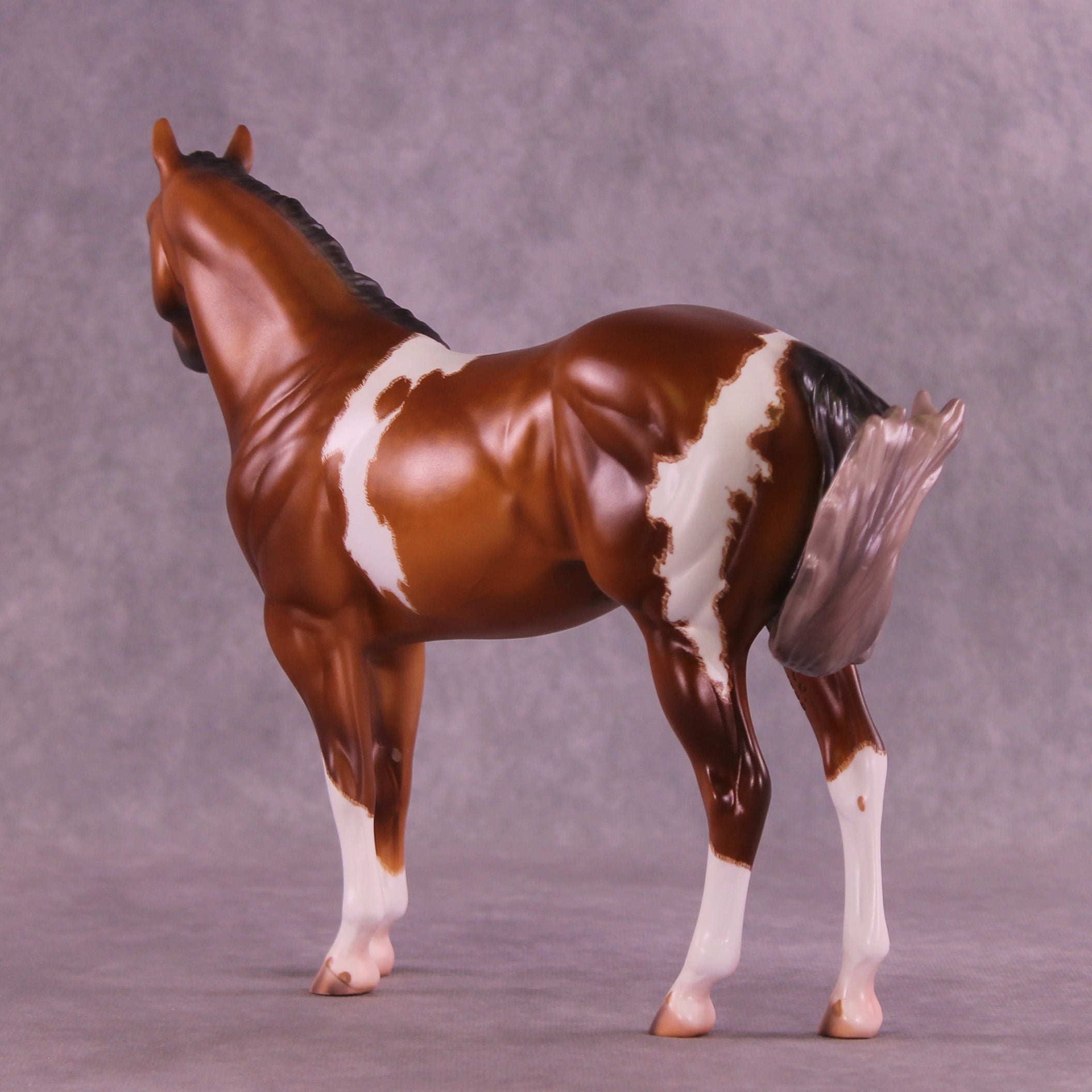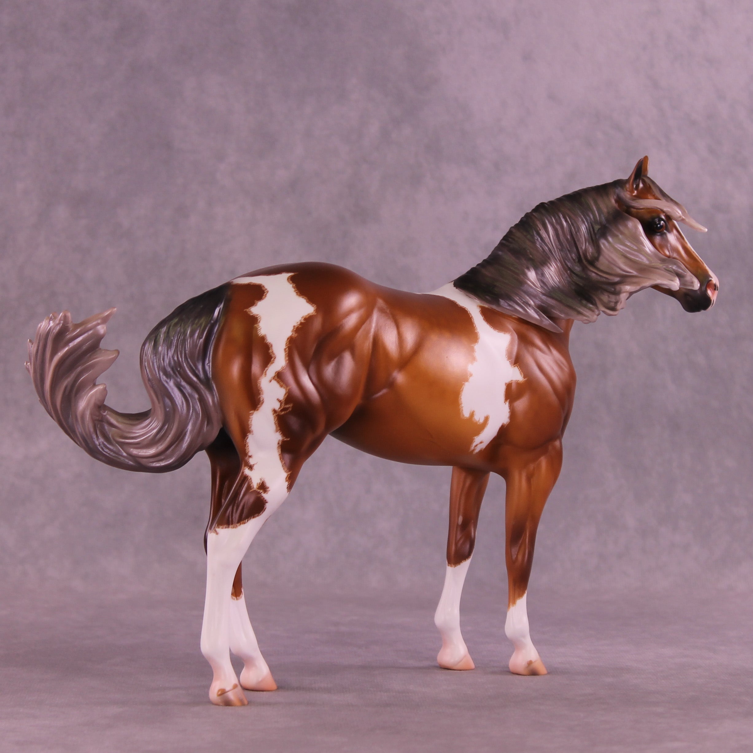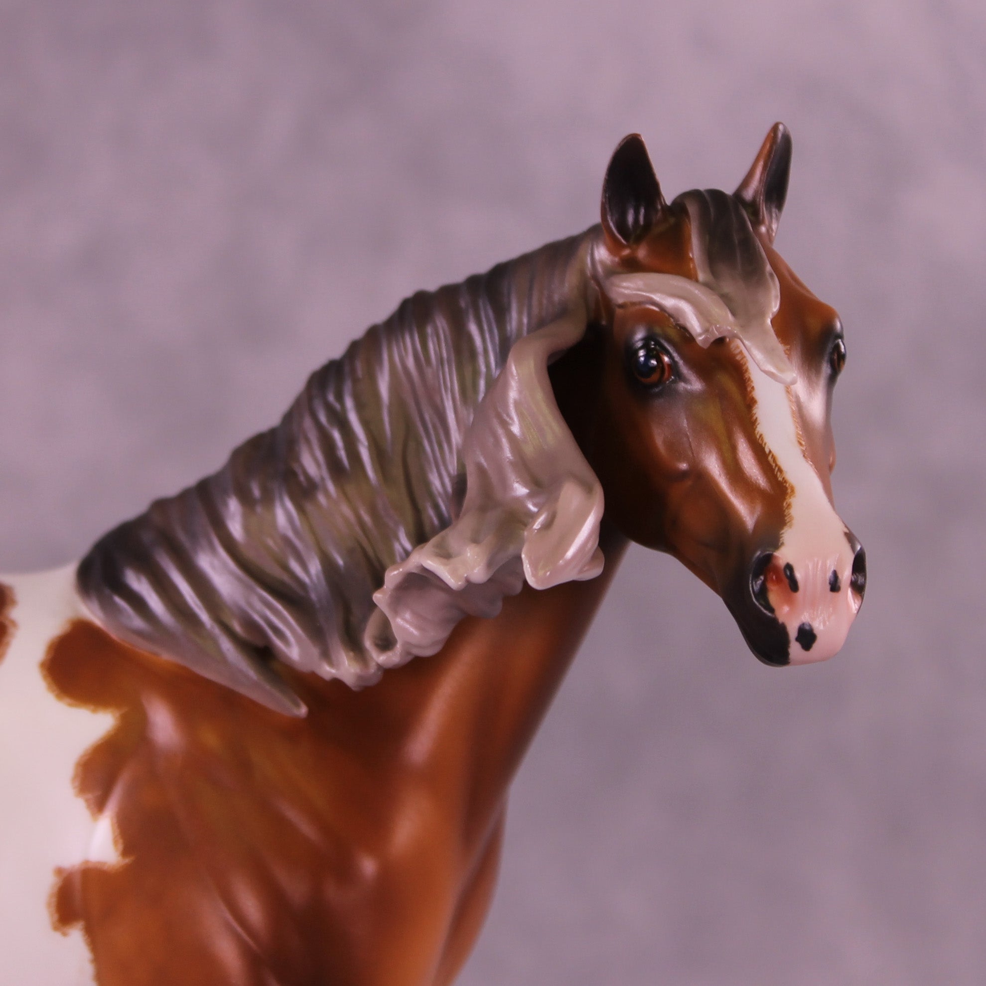 What a stunner. Mel worked with our Ideal Stock Horse sculpture and gave him a uniquely forward blowing mane and forelock, and our curling tail. Caroline painted him to the toastiest palomino pinto you’ve ever seen, with tons of soft dappling and full etching around his pinto pattern edges. He also has hoof stripes, gorgeously soft nose pinking, and all the details Caroline’s work is known for! He is available in all finish options.