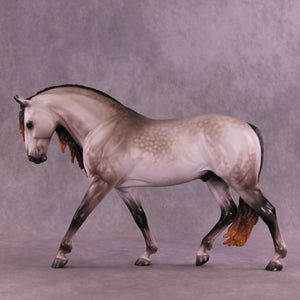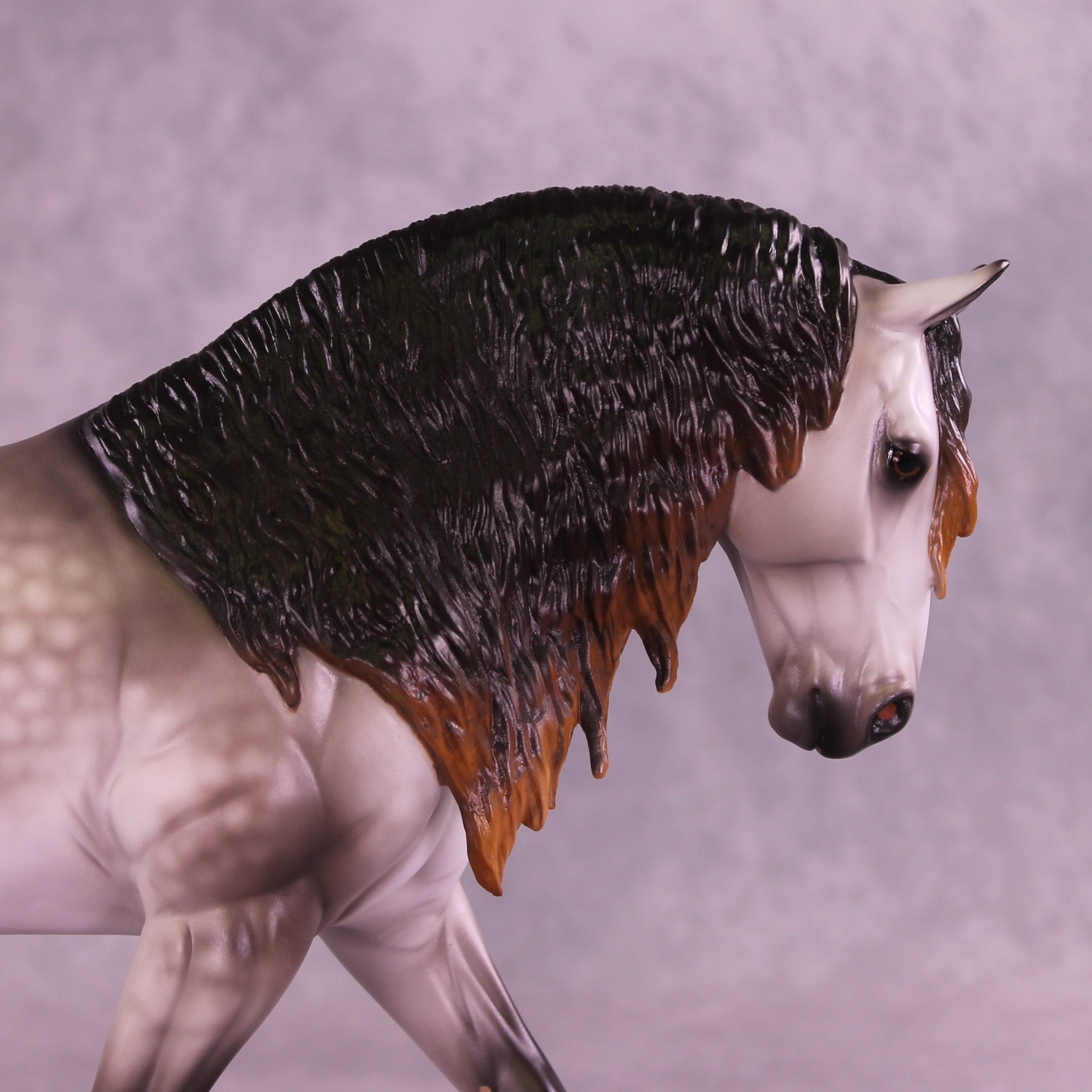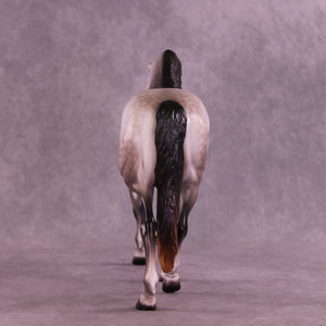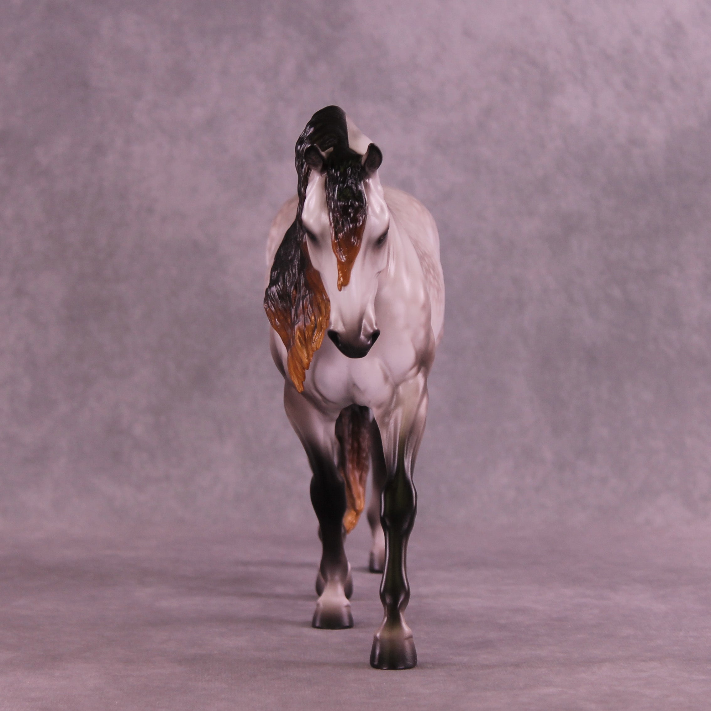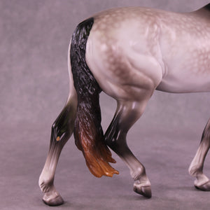 If you are looking for a horse with presence, Cragar is your man! Mel gave him a long wavy mane and forelock, plus a wavy tail slightly blowing forward in the wind to match the movement of his mane. Caroline then painted him to a stunning detailed dappled rose grey. He features soft dapples throughout his coat, subtle grey shading on his face, and sunburnt brown ends on his mane and tail. He comes in a satin finish and his new owner can elect to have him glossed if they choose.