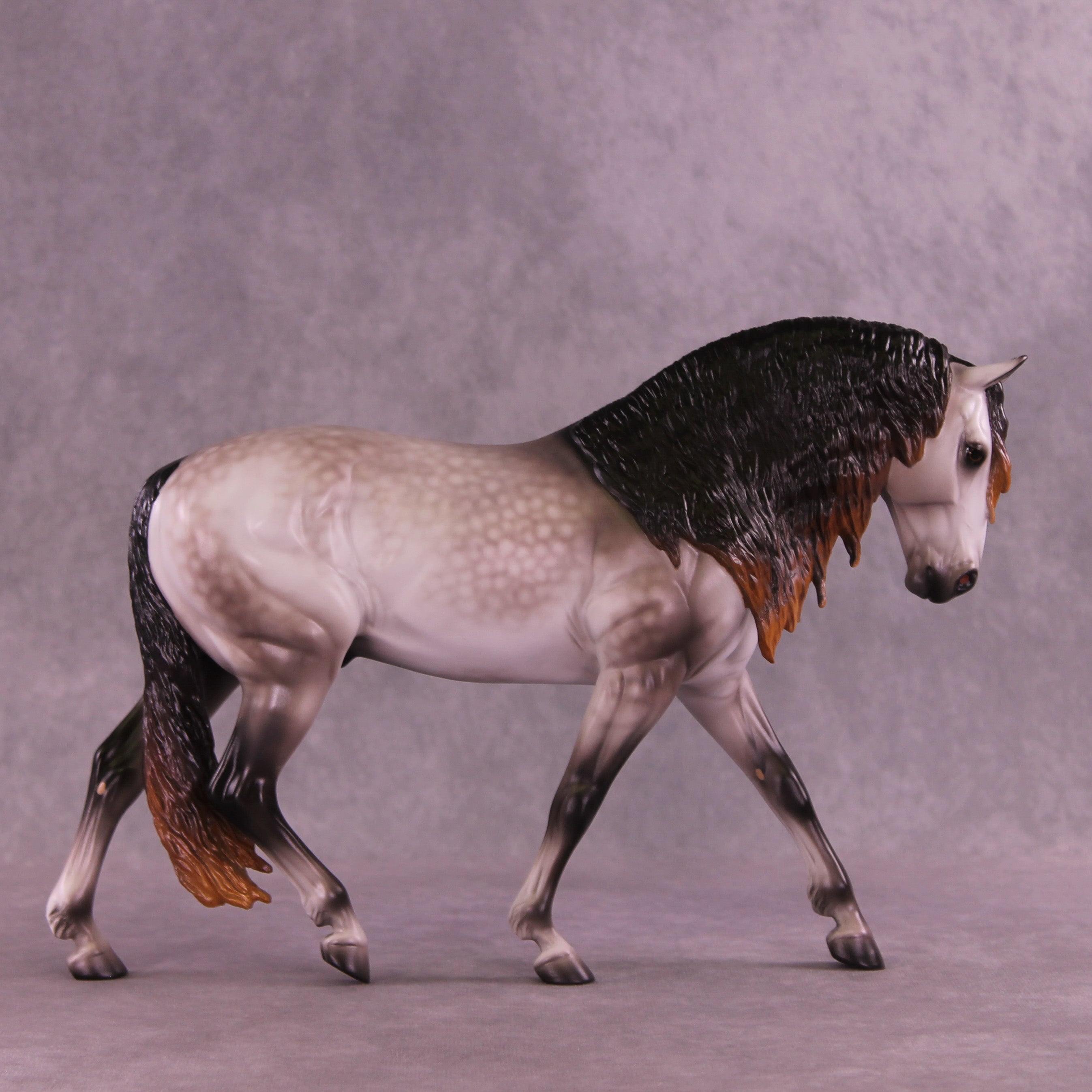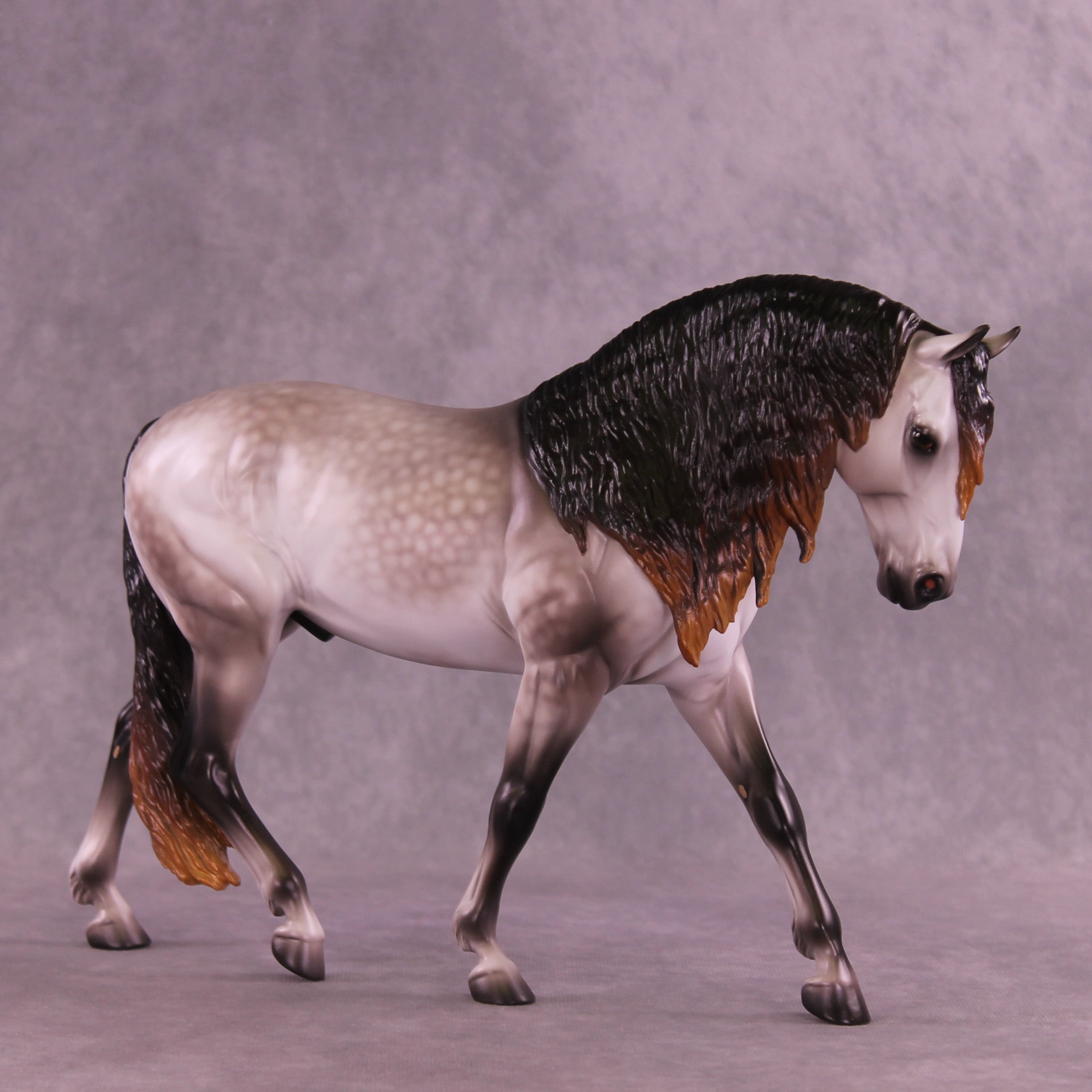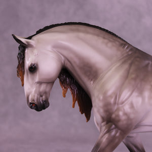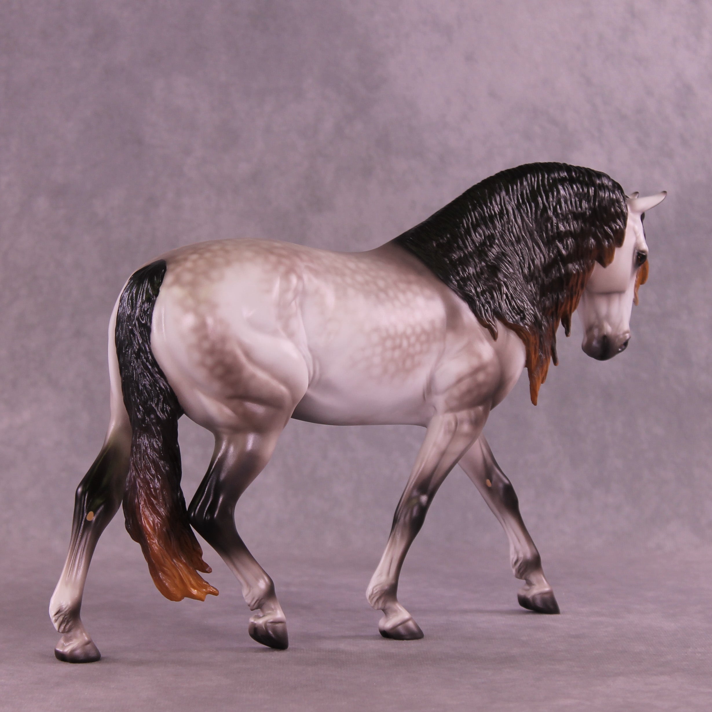 If you are looking for a horse with presence, Cragar is your man! Mel gave him a long wavy mane and forelock, plus a wavy tail slightly blowing forward in the wind to match the movement of his mane. Caroline then painted him to a stunning detailed dappled rose grey. He features soft dapples throughout his coat, subtle grey shading on his face, and sunburnt brown ends on his mane and tail. He comes in a satin finish and his new owner can elect to have him glossed if they choose.