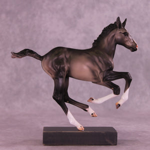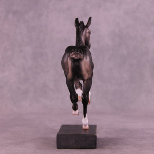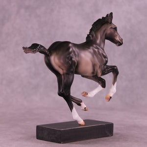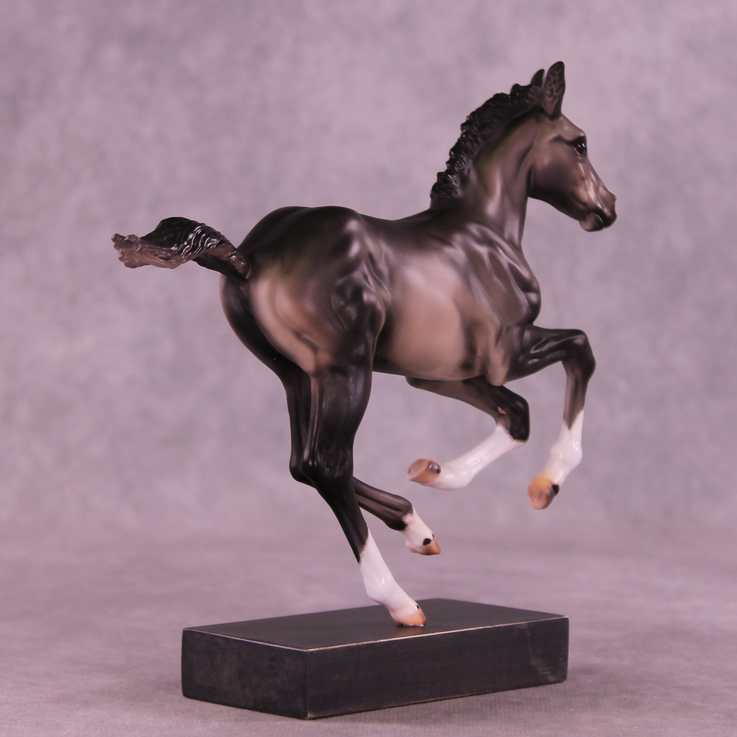 It doesn’t get cuter than this little runaway! Mel added extra flair to the Pimento sculpture with a flicked back ear and a sassy turned and tucked head, with extra detailing added to her mane and tail Caroline finished her in a softly shaded baby black with lots of etched chrome. Her wide blaze also features an adorable pink nose with kissy spots. She comes in a satin finish but can be glossed at the winner’s request.