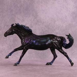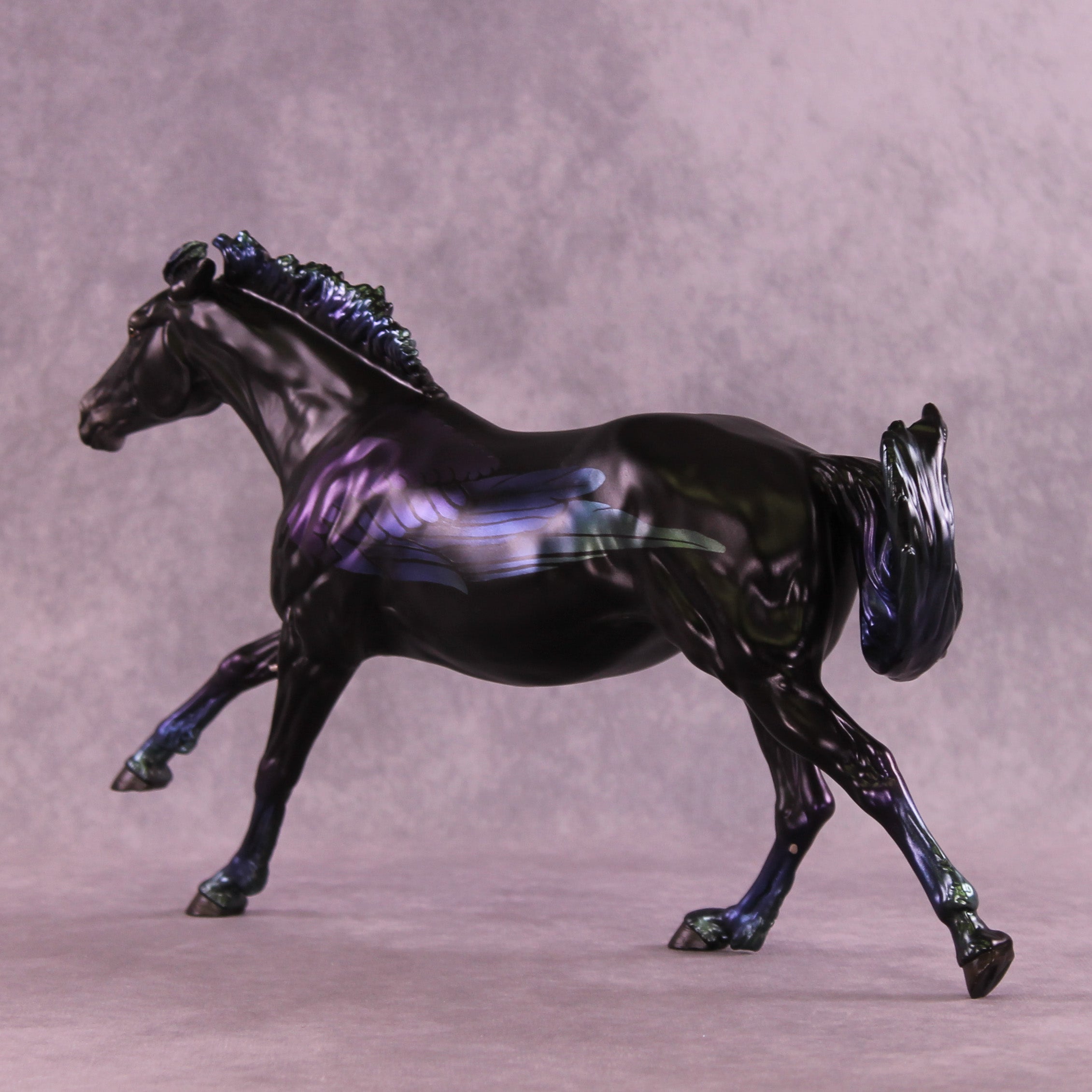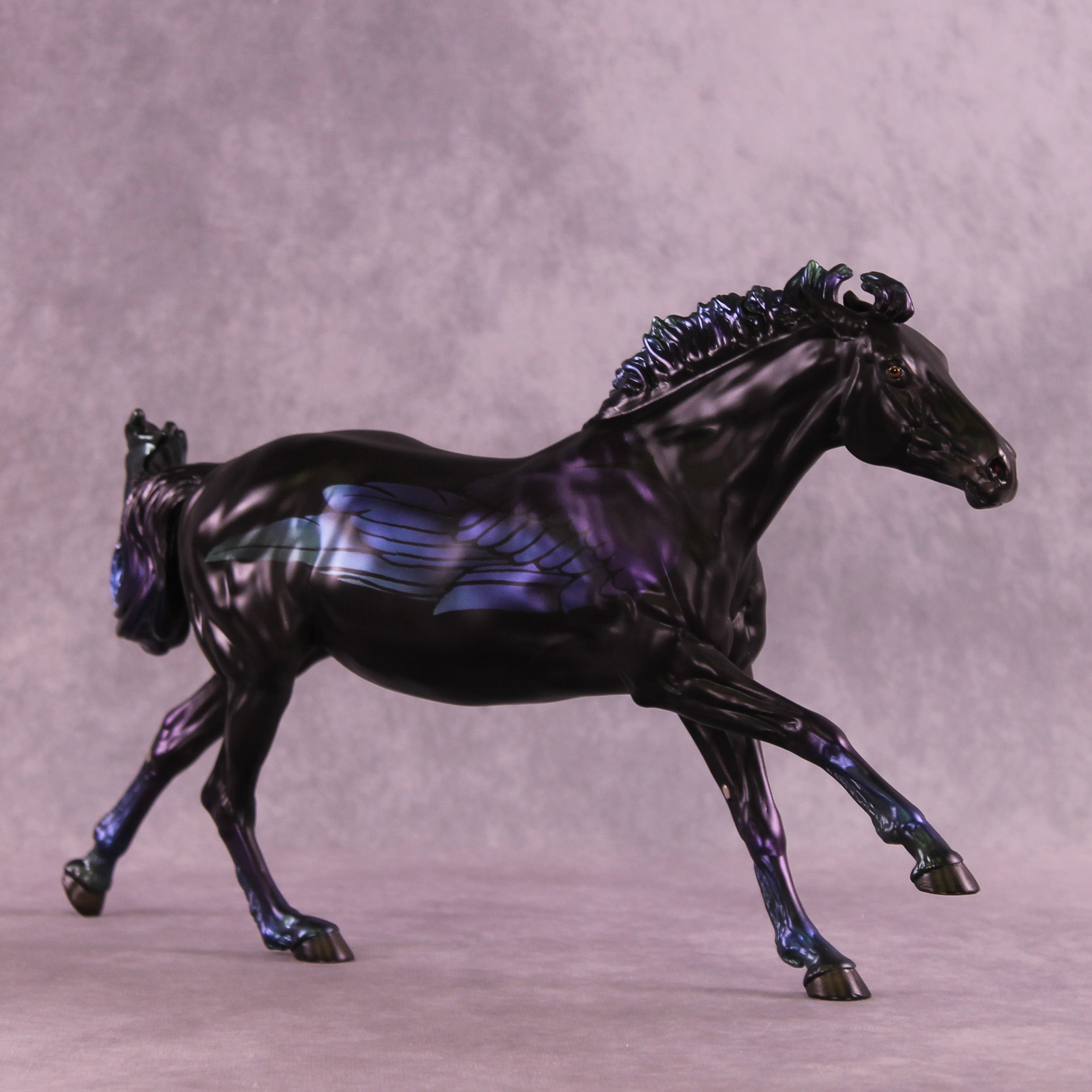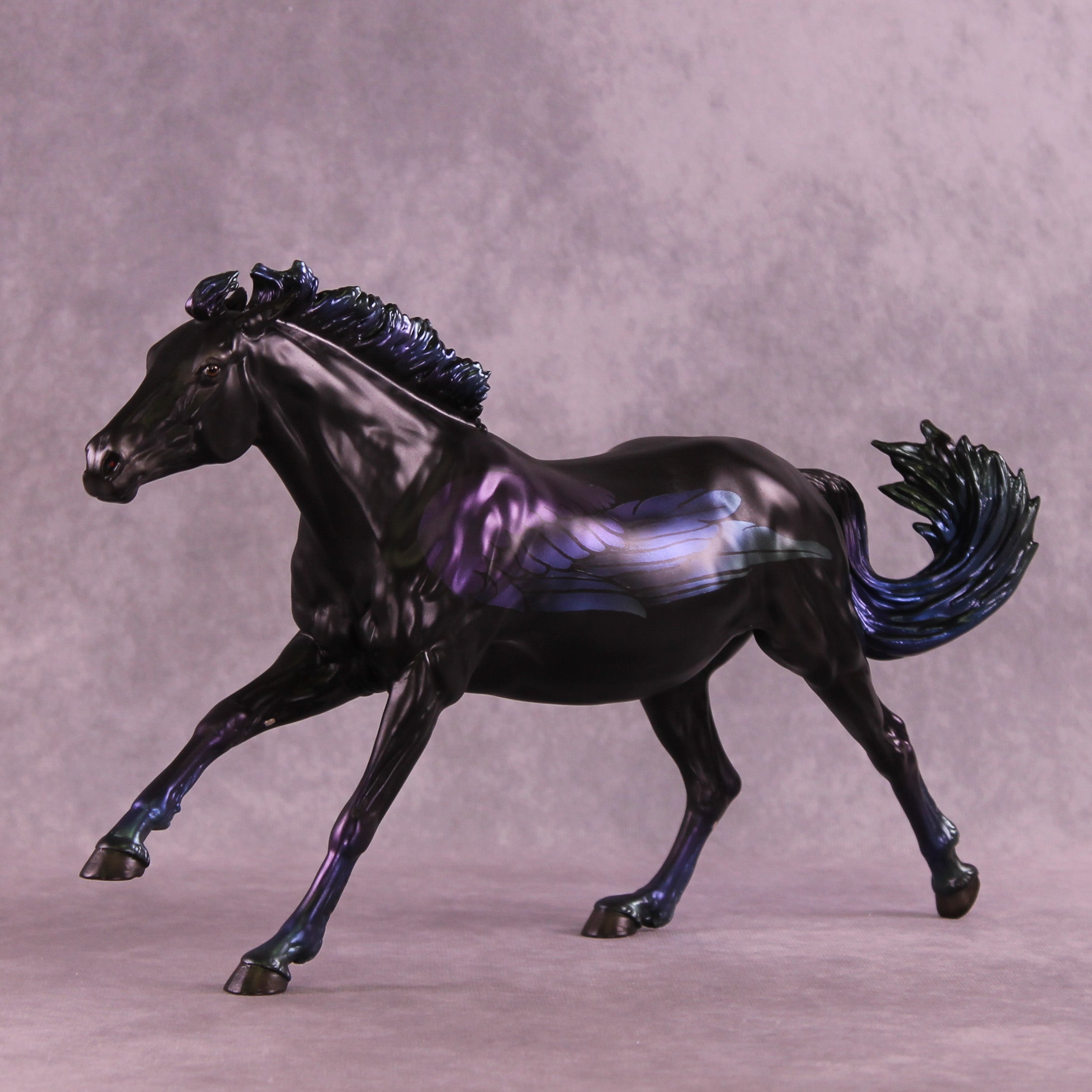 Nevermore is our Volo mustang mare customized with pinned back ears, a short loose mane and forelock, and her loose curling tail. Ellen has painted her to a stunning shaded raven black, with intricately painted raven’s wings on her sides in tones of shimmering green, blue, and purple, plus raven shading in similar tones in her wild horse feathering, mane, tail, and forelock.