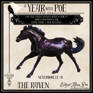 Welcome to the world of Edgar Allan Poe, as retold by Ellen Robbins. For our first month we are not holding back – introducing The Raven. Two beautifully customized Volo mustang mares, and two runs of customized mini versions split 50/50 matte and glossy for you to choose from!