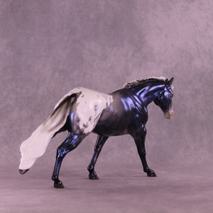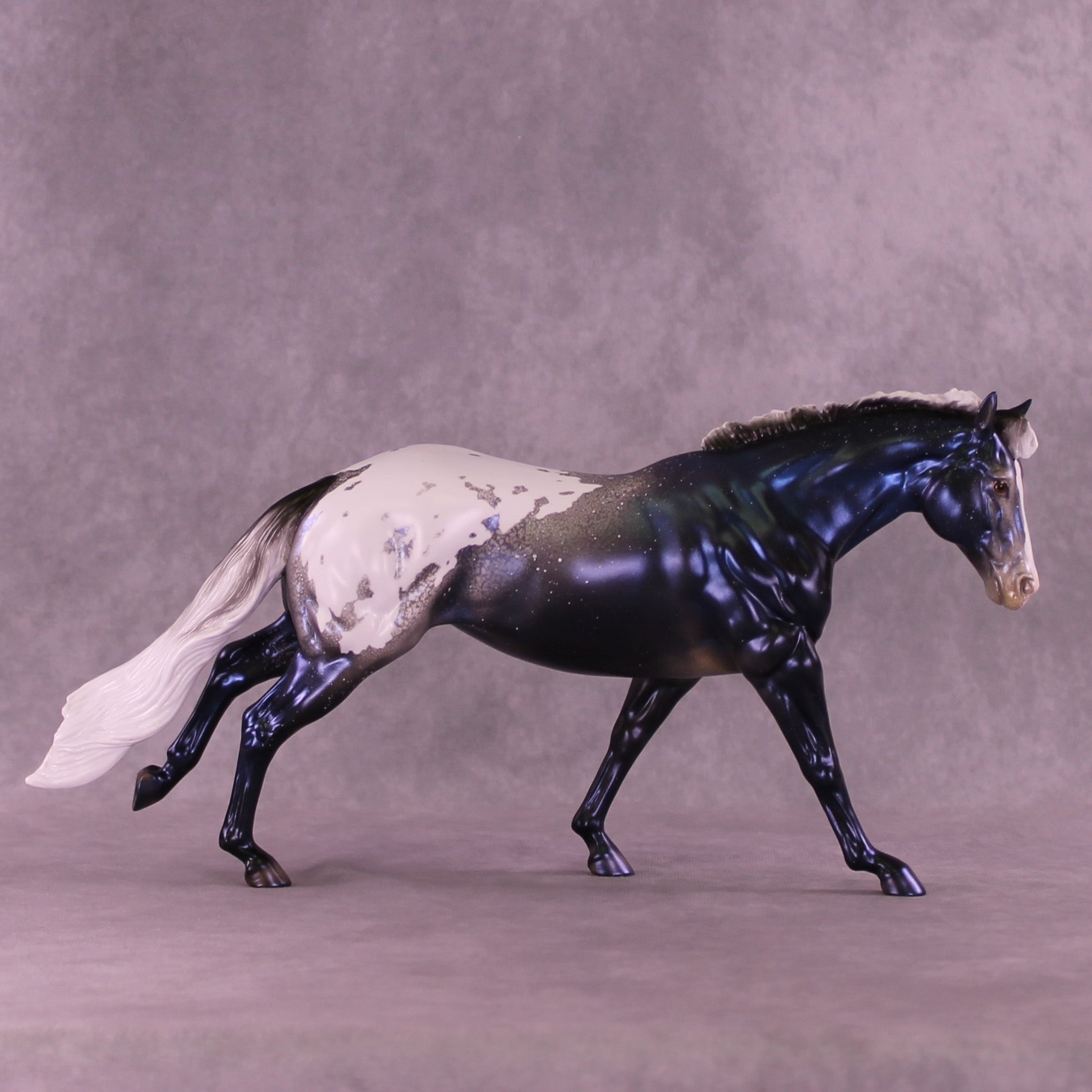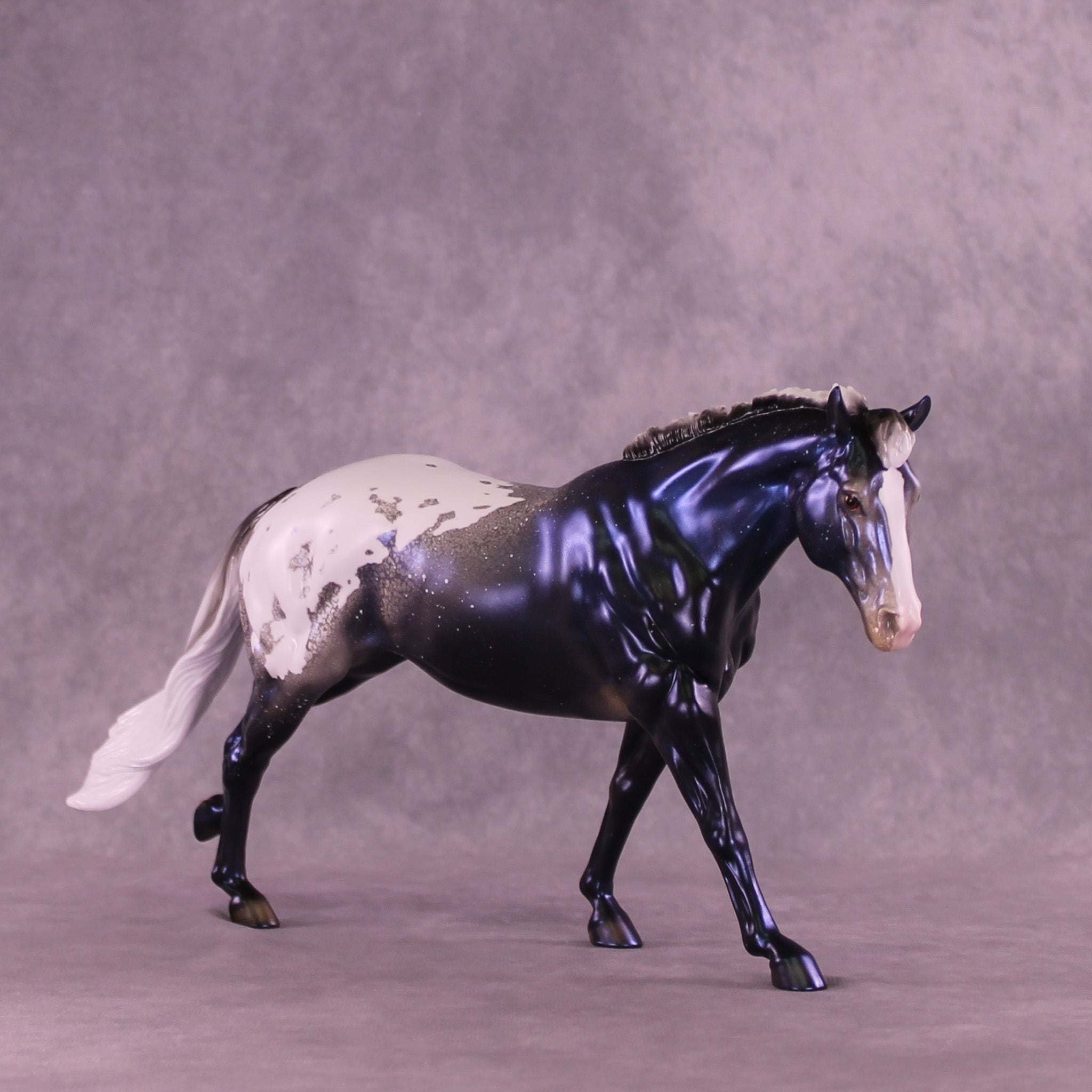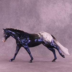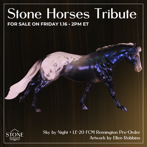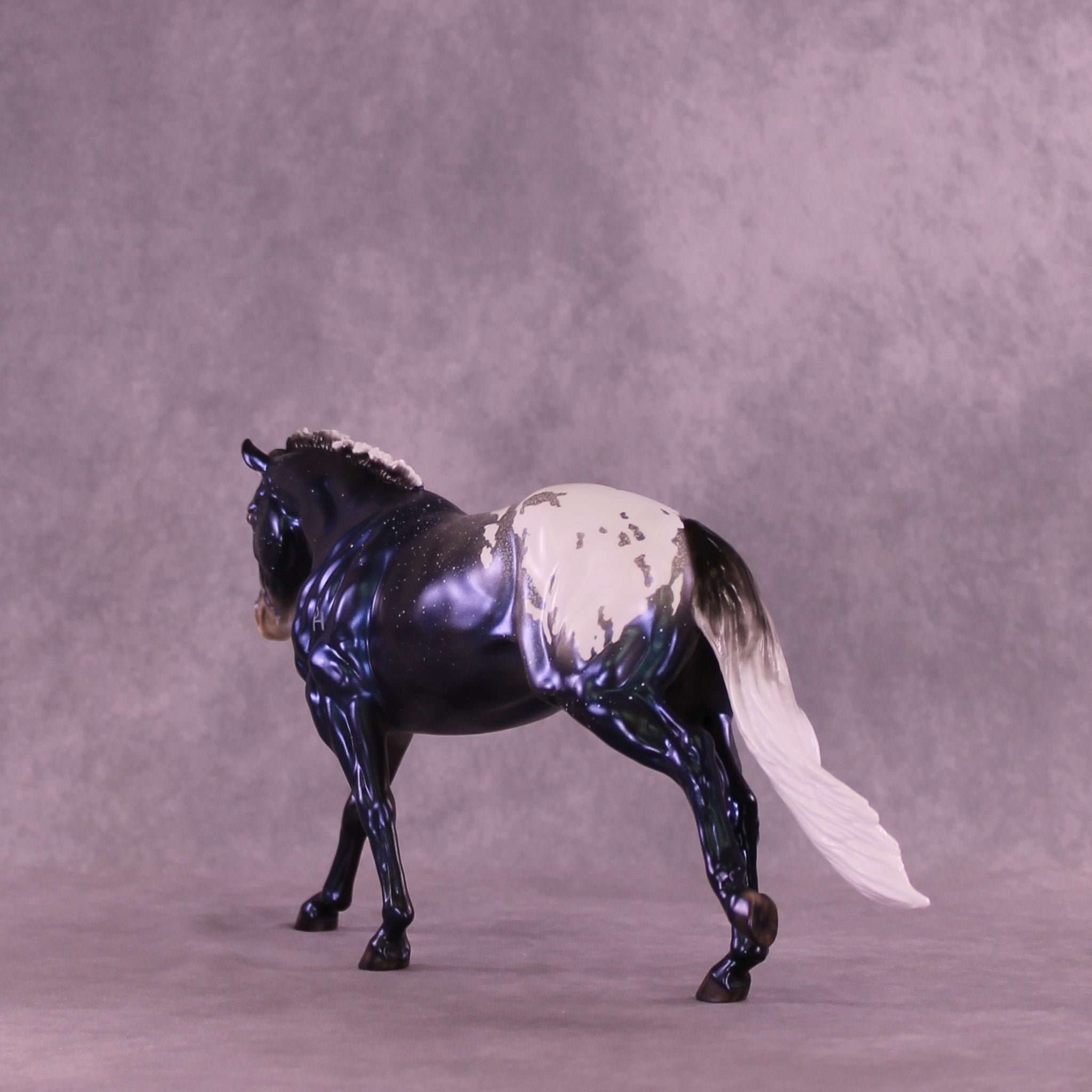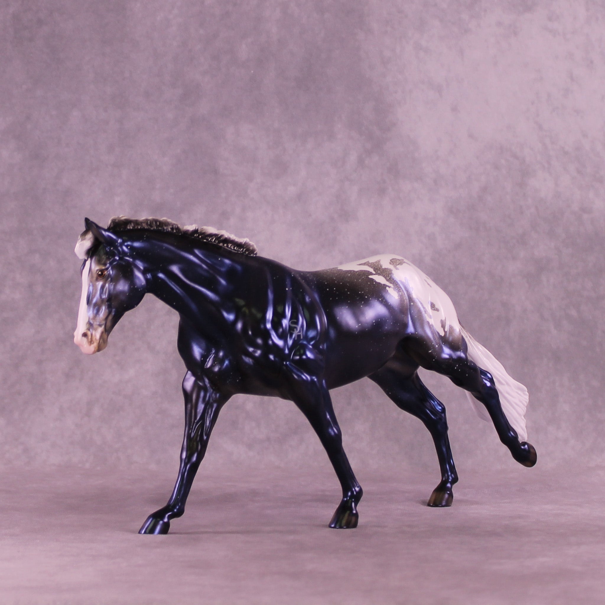 Sky By Night features the same pattern and general design elements, but in a stunning night sky decorator design! He also has soft mottling and pinking, plus shaded hoof stripes and more. He is pictured in what will be matte finish for this run, and all finish options are available. As a nod to the 2026 version, we have replaced the Circle A brand on the original with our new SH brand which is optional.