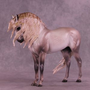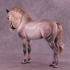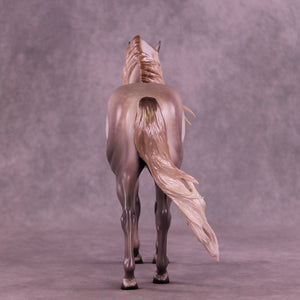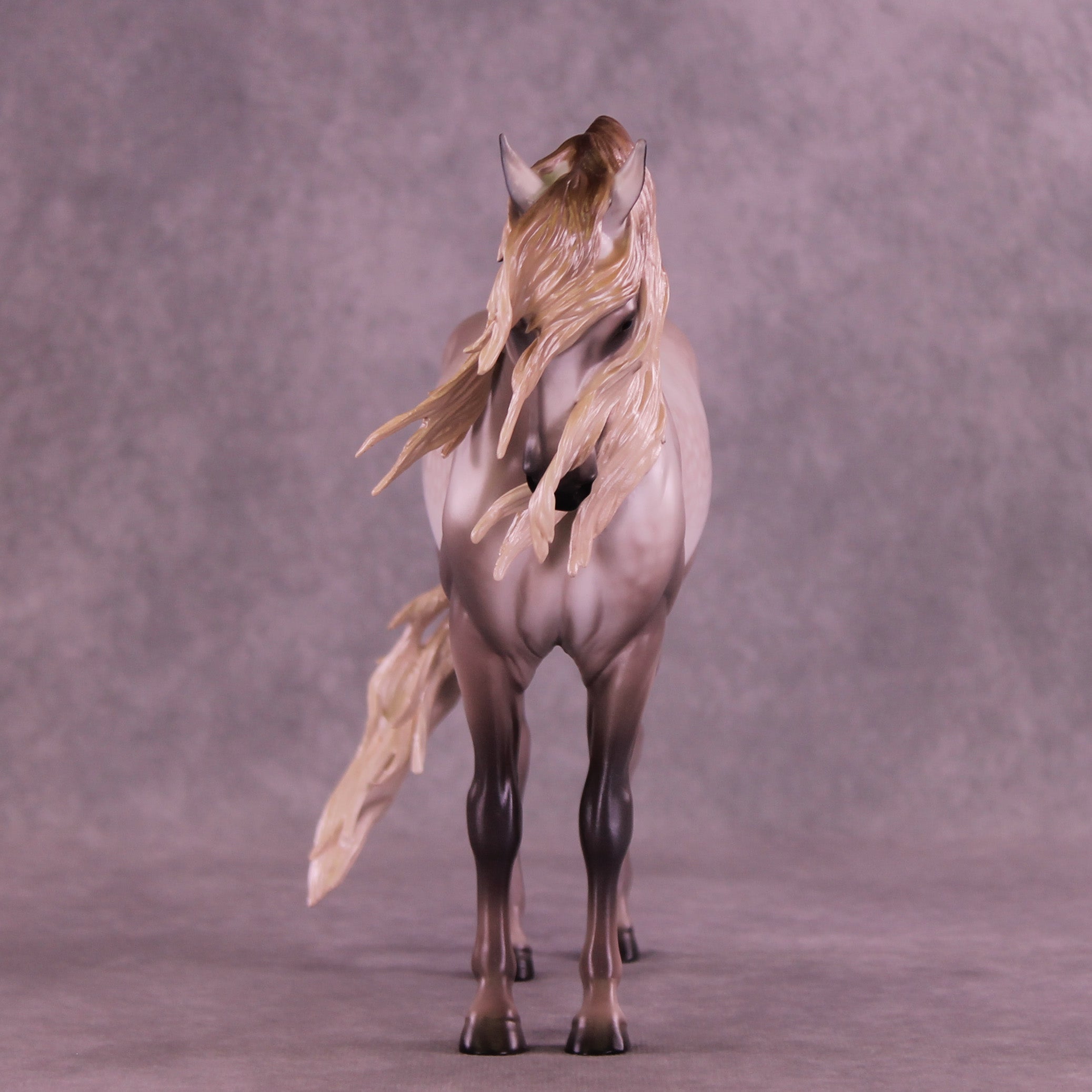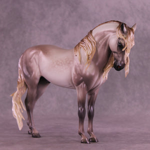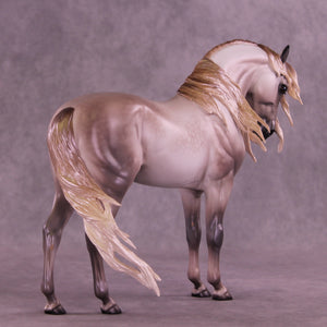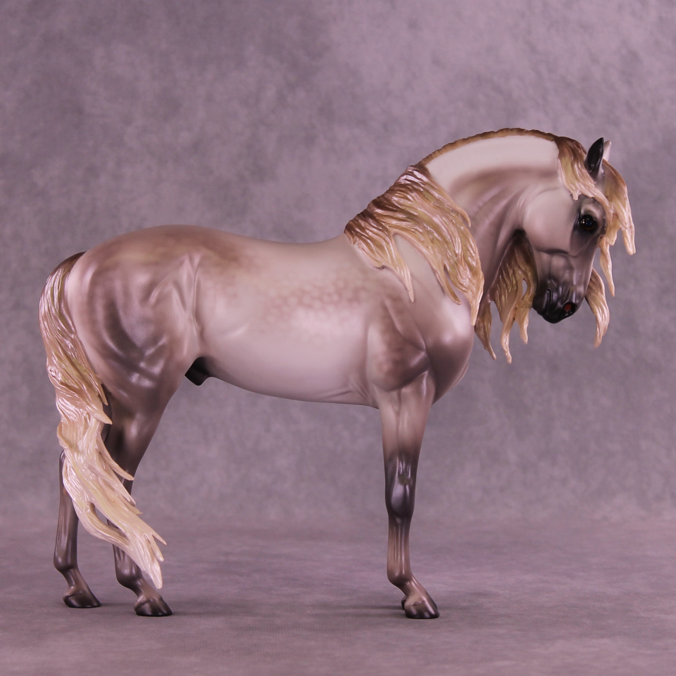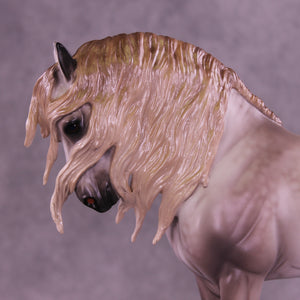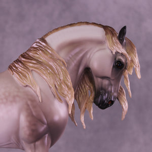 This stunning piece begins on our Andalusian sculpture, and Mel gave him a dramatically tucked head with a contrasting forward blowing mane, tail, and forelock with loads of extra tendril detailing, and mane pieces on both sides of his neck. Caroline painted him to a gorgeous dappled rose grey with all the bells and whistles, his mane shading is especially outstanding and this piece is going to be a cornerstone of any collection. He is available in all finish options.