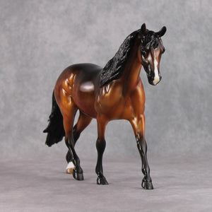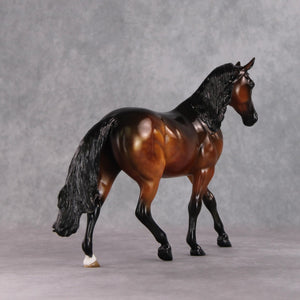 "A Moment of Zen" is just a classically beautiful gentleman. Kristen straightened his head, gave him a listening ear twitch, and added customized detailing to his tail, and fully customized his mane and forelock. She then painted him to a deeply glowing dappled bay, with an etched face marking. He is already glossed and no extra finish is available on this piece.