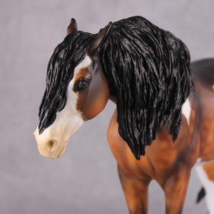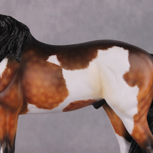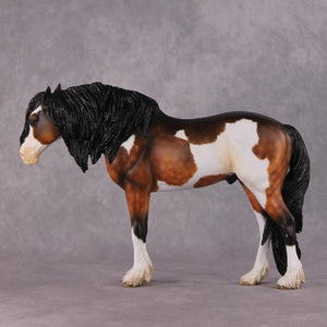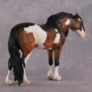 “Alba” is a whole new man. Kristen gave him a dramatic lowered head and cresty neck with a heavy customized mane, tail, and forelock, plus feathering all the way around. She then painted him to a glowing dappled bay pinto with shading in his whites, loads of etched mapping, and dramatic shading through his whole paint job.