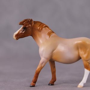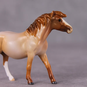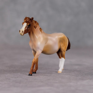 “Ambiguous Pie” is brought to you by one of our favorite restaurants here in Shipshewana. There’s a whole wall of pie slices… what kind are they? Don’t ask questions, just pick a pie. Pick two! It’s ambiguous but delicious – much like this red roan lady. Kristen gave her a haughty head lift, and swished her tail with added details to the tendrils and tail base. She then painted her to a delicious shaded red roan with two white socks and wide blaze. She is currently matte and extra finish is available on this piece.