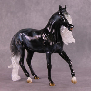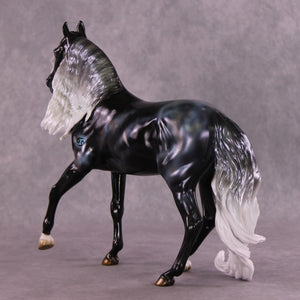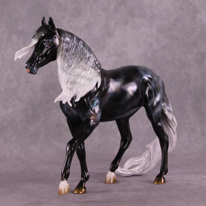 Both colors are extreme factory customs, featuring a dramatically lifted and straightened head and neck position with an extra long customized blowing forward wavy mane, tail, and forelock.