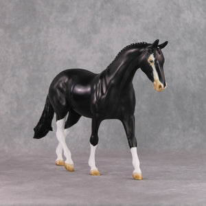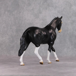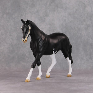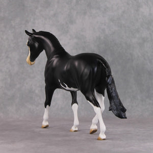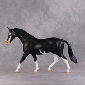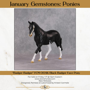 "Badger Badger" features the braided version of our pony mold, and Kristen painted him to a gorgeous shaded softly dappled black with the most eye-catching badger face marking, with intricately painted eyes – one is all blue and one is half brown half blue! He also has belly spots and contrasty white braids. He is currently matte and can have gloss or satin added if the buyer so chooses.