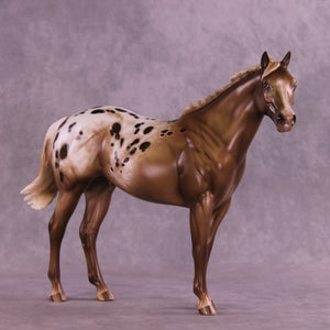 Beat Blast begins on our Ideal Stock Horse mold, customized to have a short standing up mane and forelock, plus extra short customized tail twisting in the breeze. Sheryl painted him to a glorious sorrel appaloosa with flaxen mane and tail, with just the right balance between hair level detail and softness that her work is so well known for. This piece is available in all finish options.
