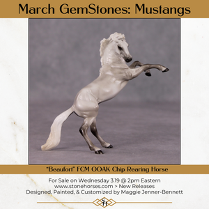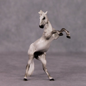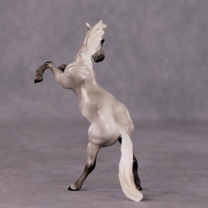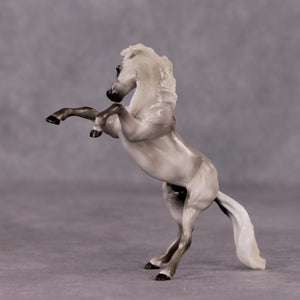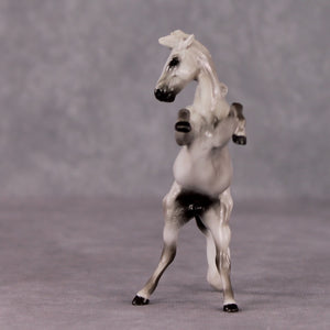 “Beaufort” is a mini of Ambrose Light, and features a similarly shaded and detailed grey paint job with no white markings, lovely detailed hooves, and a dramatically turned and tucked head customization with neck resculpting. He comes glossy and finish changes are not offered on this piece.