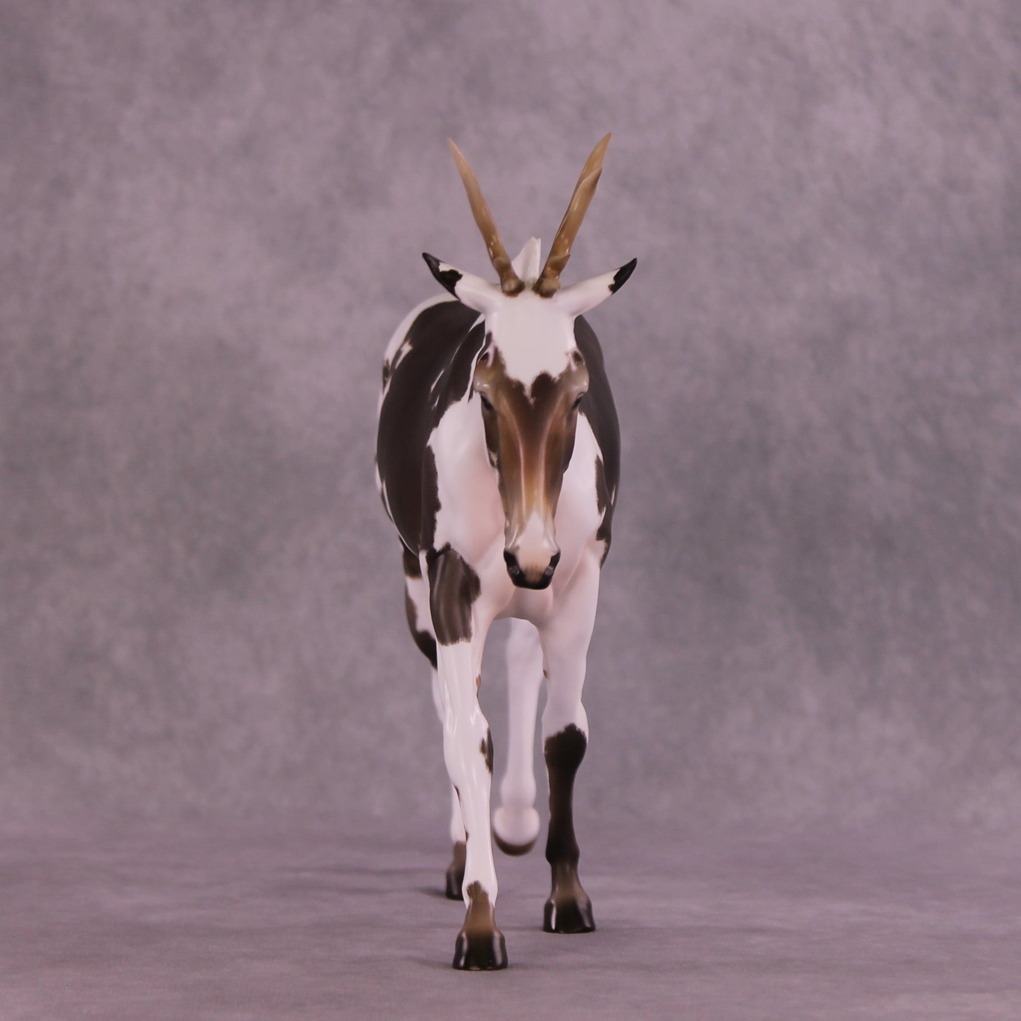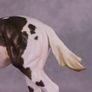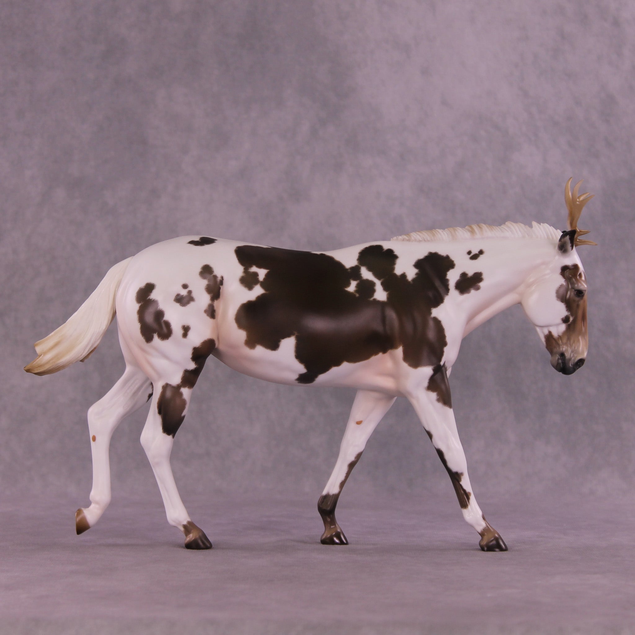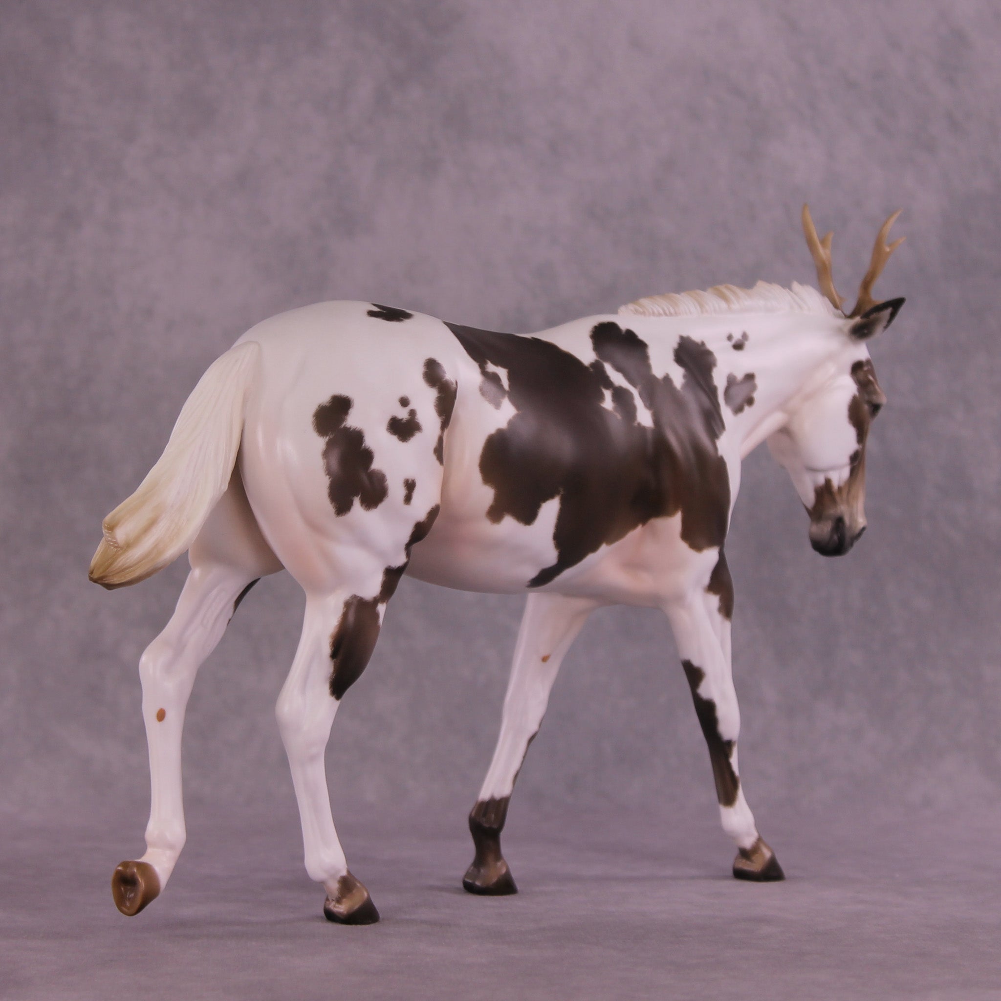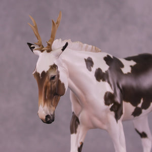 Translating to "Rabbit-Deer" in Spanish, this piece by Jess Hamill and Matt draws inspiration from many places - specifically, from a piebald white-tailed deer and arctic hare, shedding its winter coat into it's spring color. Matt gave her all new airplane ears and hand-carved antlers, plus a customized short mane and shortened tail. Jess finished her in a gorgeous soft brown piebald pinto with incredible soft shading, detail, and etching throughout! You may recall this piece from Moonlight Madness 2024, and it’s true – she is back up for auction, now with a slightly more satin finish than the first time around.