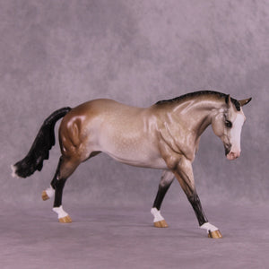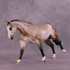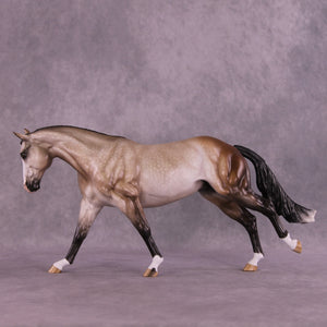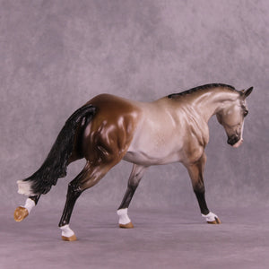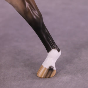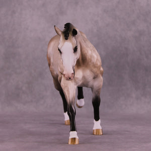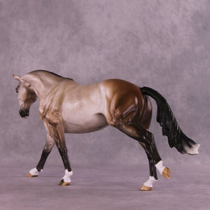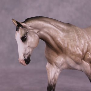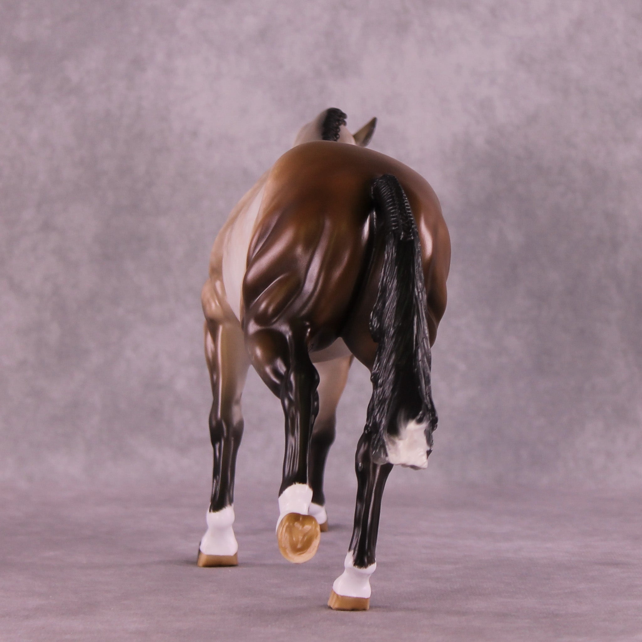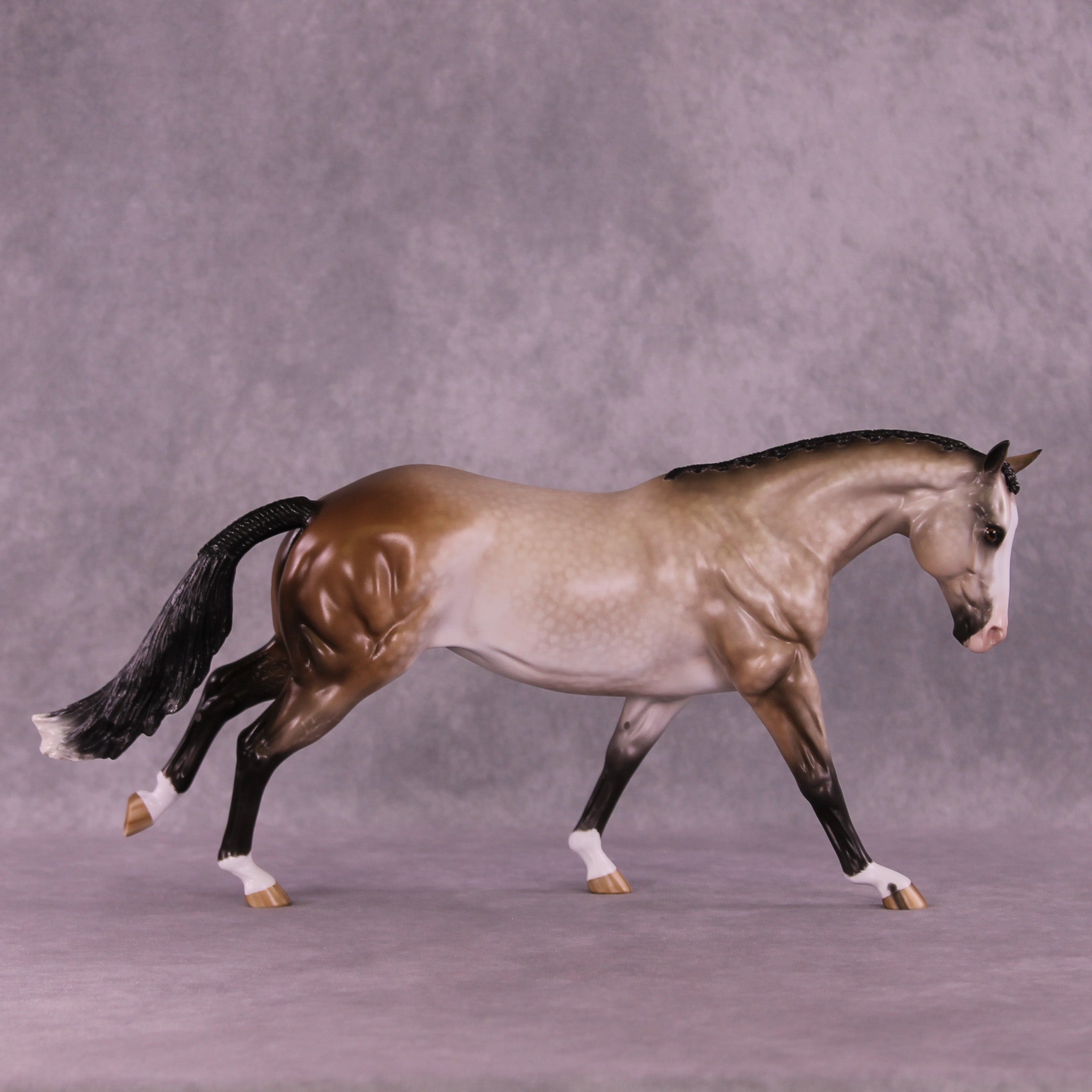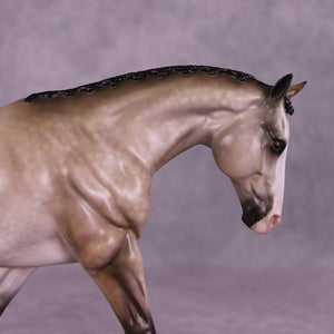 What can we say, we are enamored by Remington in braids lately! Melanie gave this guy a sweet little head tuck and a gorgeously detailed braided mane and show braided tail, and then Sheryl finished him to an iconic and unique bay going grey with heavy dappling, shading, hoof striping, and full detailing through the whole piece. If you are on the hunt for your next combination performance and halter competitor, here’s your winner!