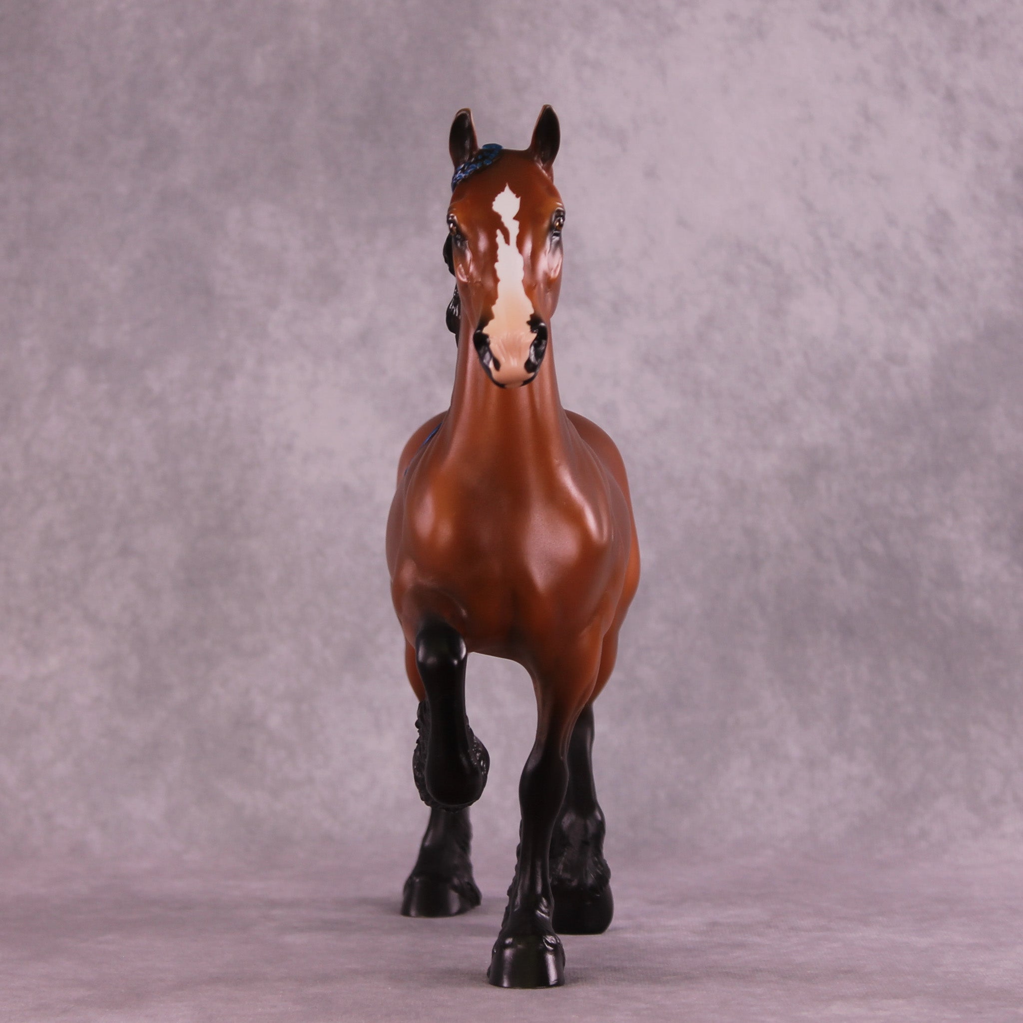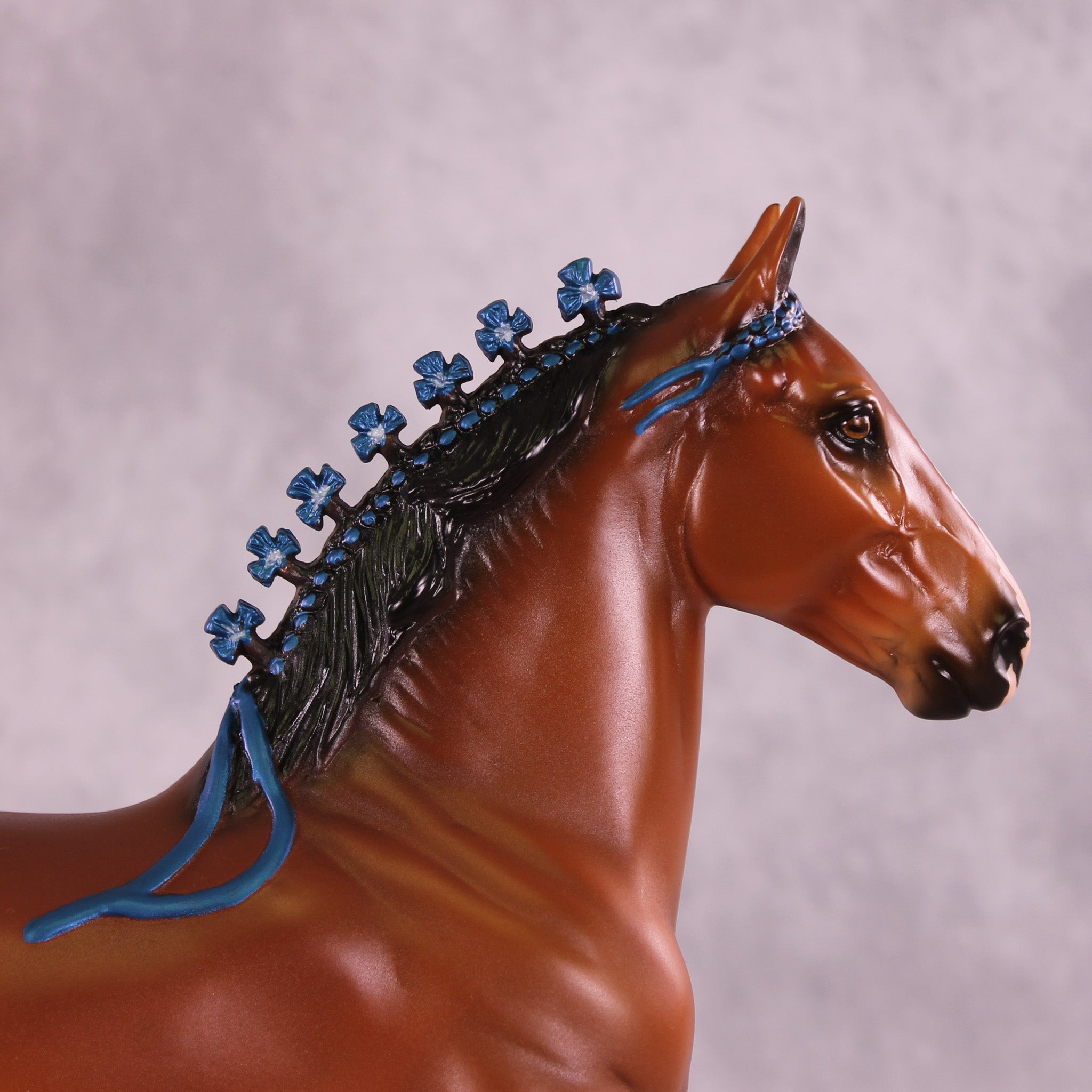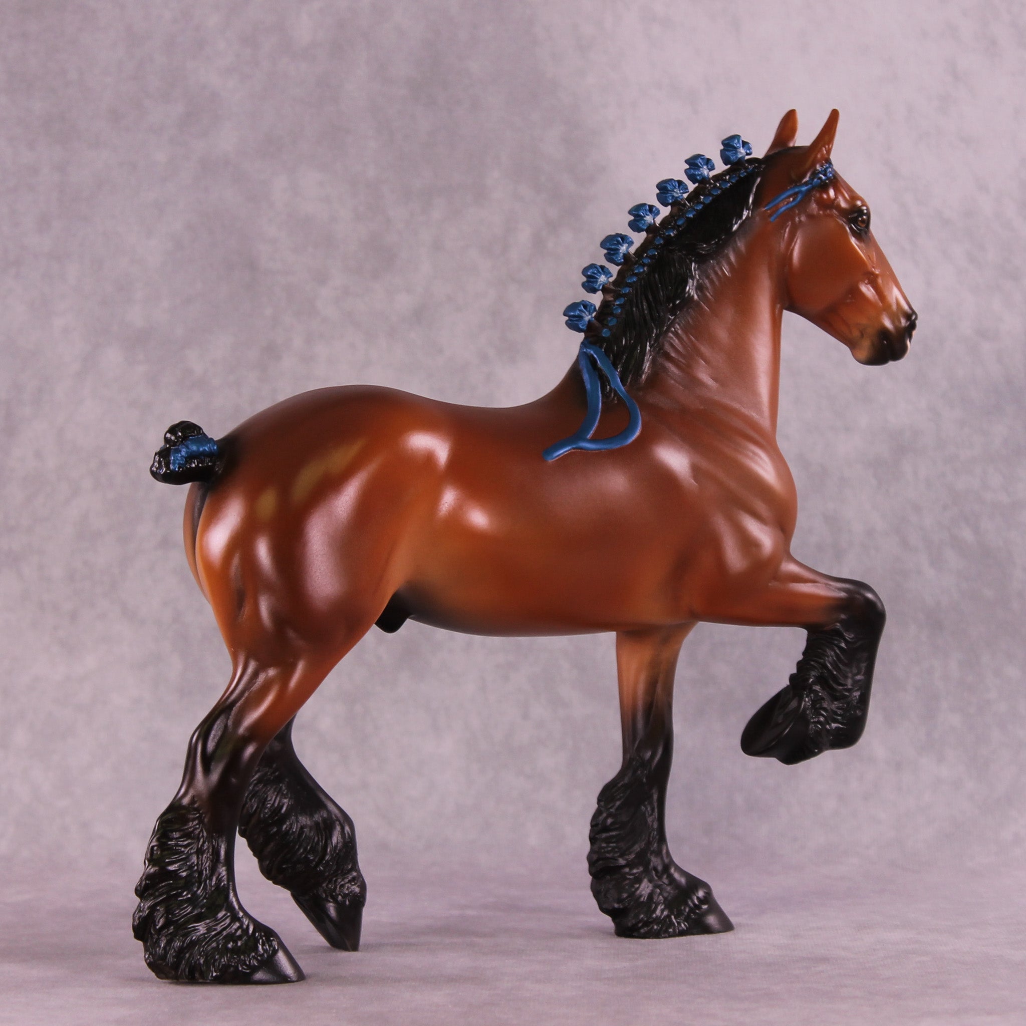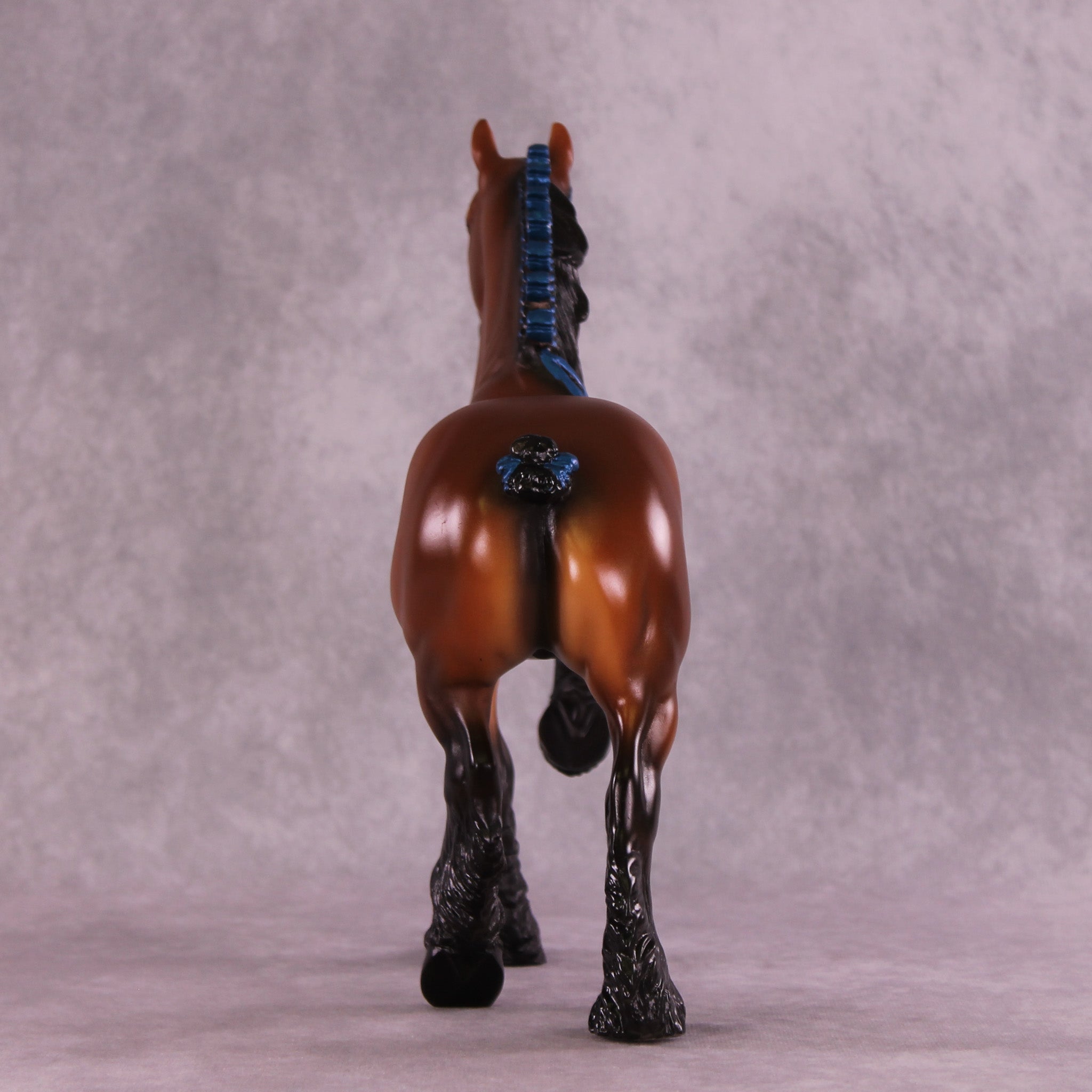Why is he named File Cabinet? We’re not sure, but we can tell you that this is the first time a Stone Horse has been named File Cabinet. A One of a Kind in every sense of the word! Erika worked with our favorite Trotting Draft sculpture and painted him to a luscious golden metallic bay with an intricate irregular blaze and extra detailed hand painted blue ribbons through his mane and bobs. Maybe his new spot is in your home office?