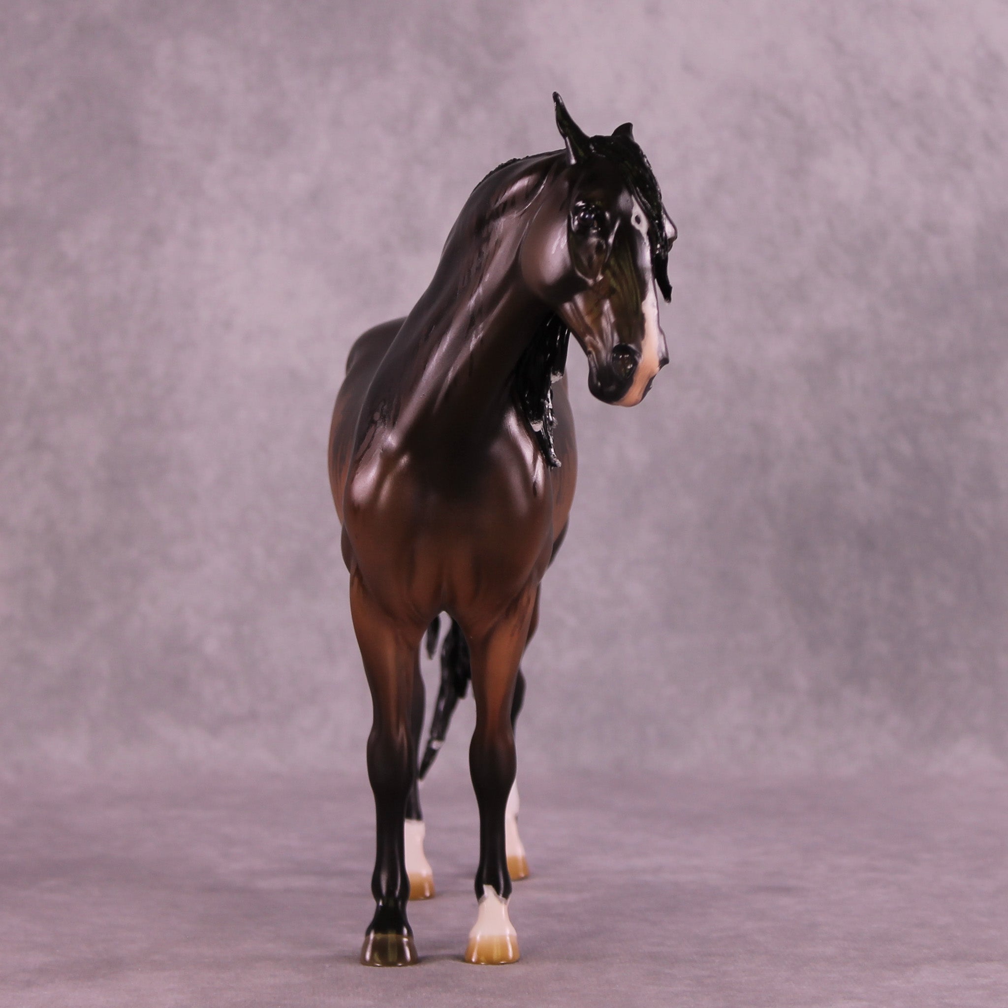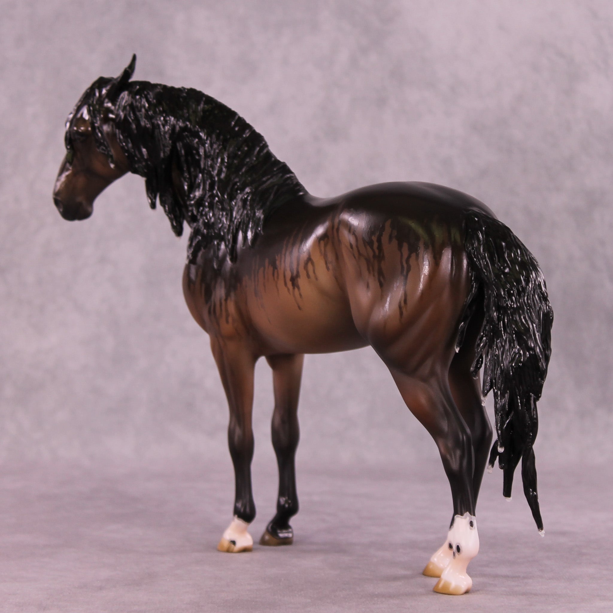 This guy is really something special. Borne of a lunch time ‘I wonder if we could…’ conversation, this horse declares that yes, we can make a horse look as though he’s being rained on, and none too happy about it. Carissa started off by giving our Andalusian an extreme makeover with a whole new pose and expression through his head and neck with nonplussed, slightly annoyed ears, a whole new mane, tail, and forelock. Jess then finished him in a gorgeously inventive bay, showing that he’s wet from being rained on! He has visible ‘water’ droplets falling through his mane, tail, and forelock tendrils, and rivulets of rainwater running down his coat just as they would if he were real. He is truly a masterpiece of innovation and there is nothing else like him in the original finish world.