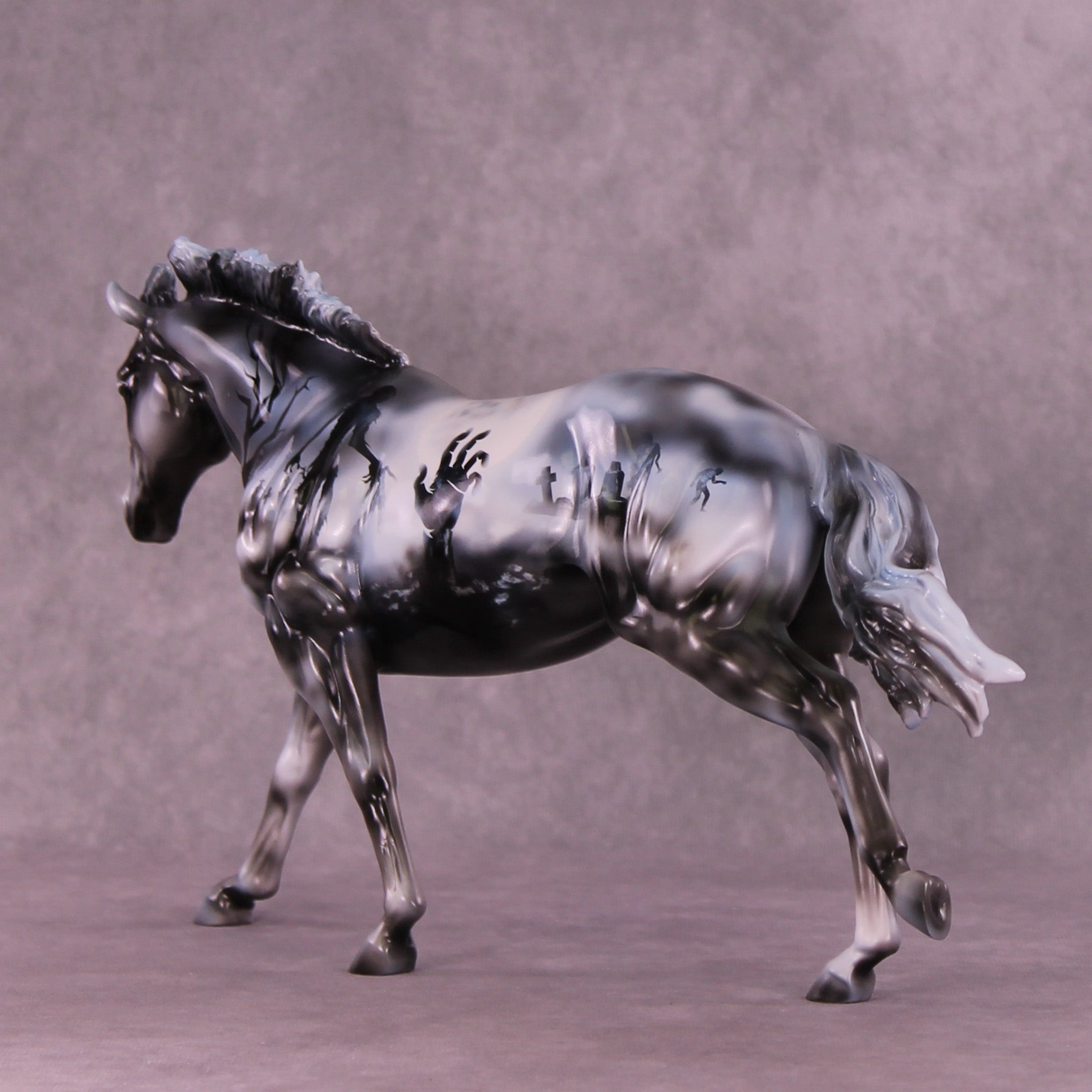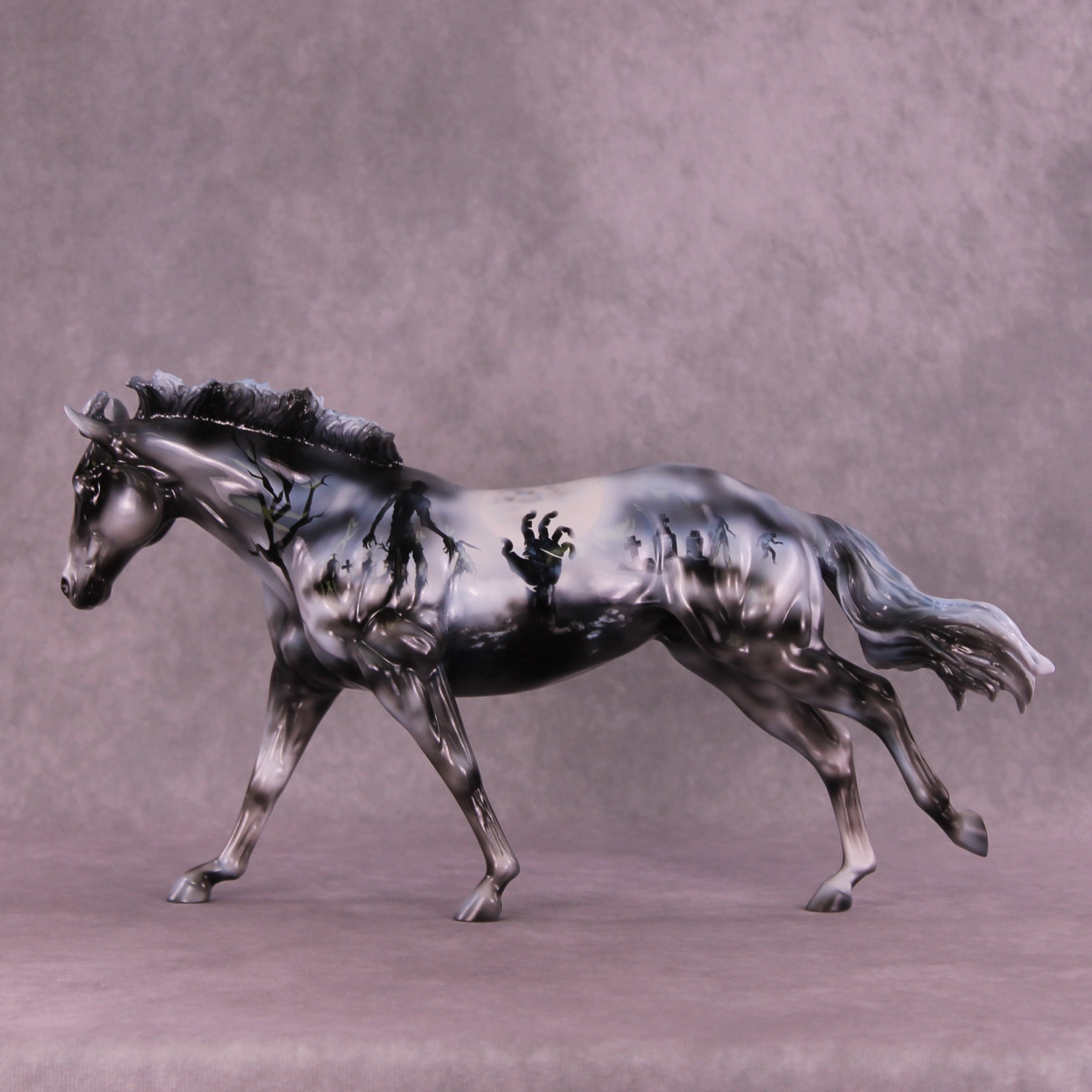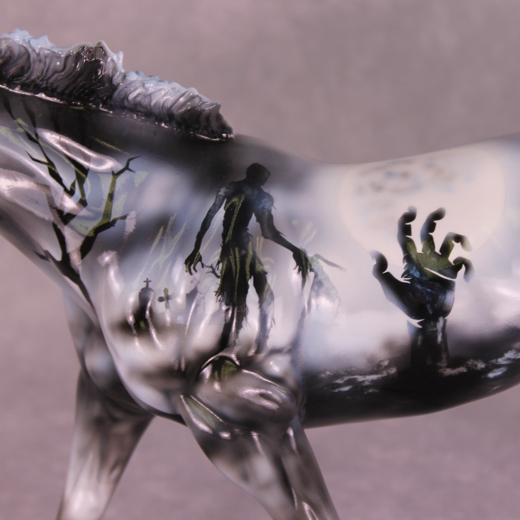 If this horse had a rating, he’d be PG-13. Kike has once again worked his magic – the depth of VERY SPOOKY field in this piece is nothing short of remarkable. You can practically hear the zombies trudging toward you through the mist, and some of them are FAR too close for comfort. Depicted on our Remington sculpture with his short mane, pattern flowing with the hair direction and finished in glossy, this piece is an October marvel.