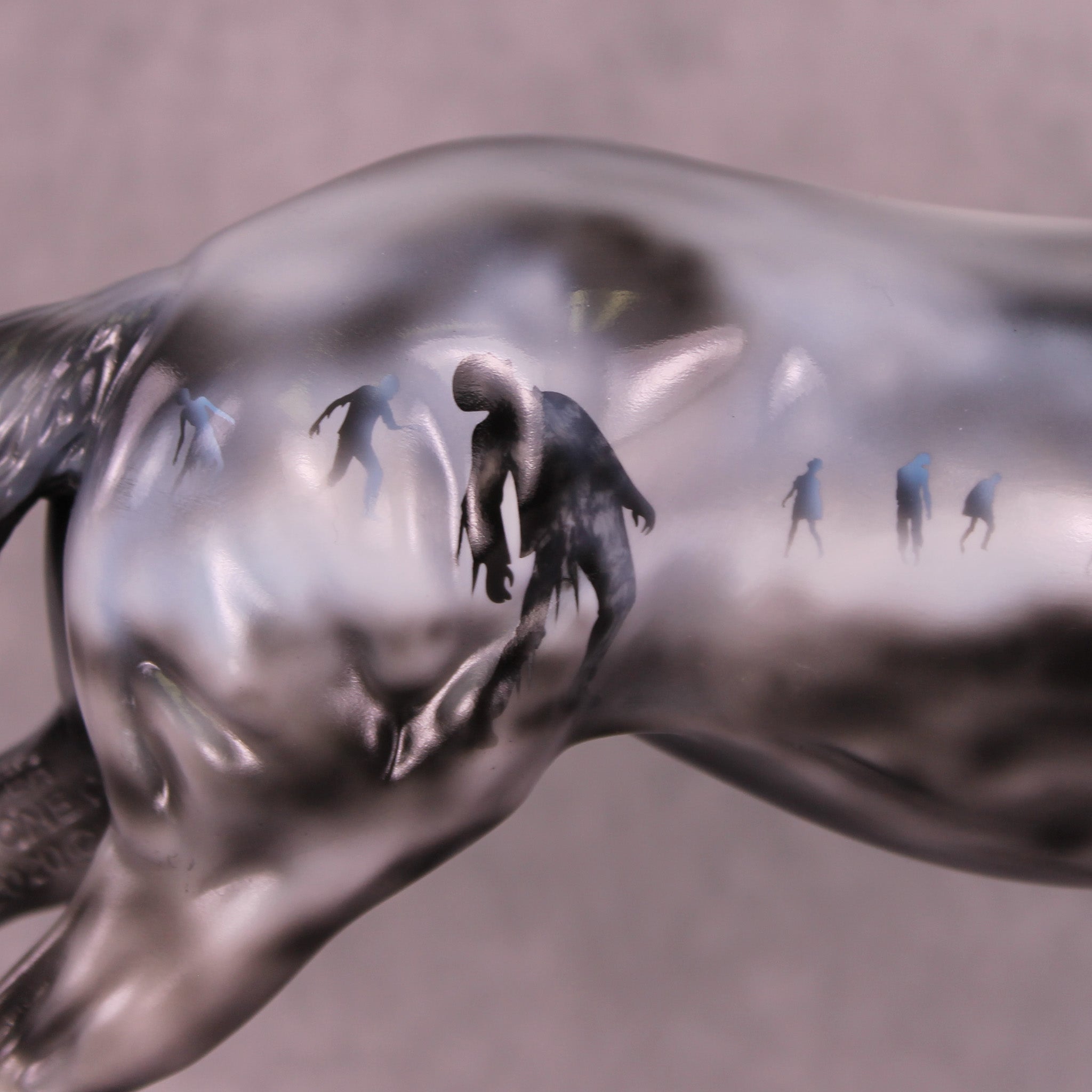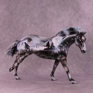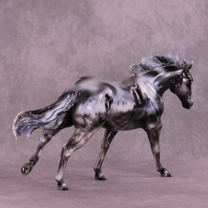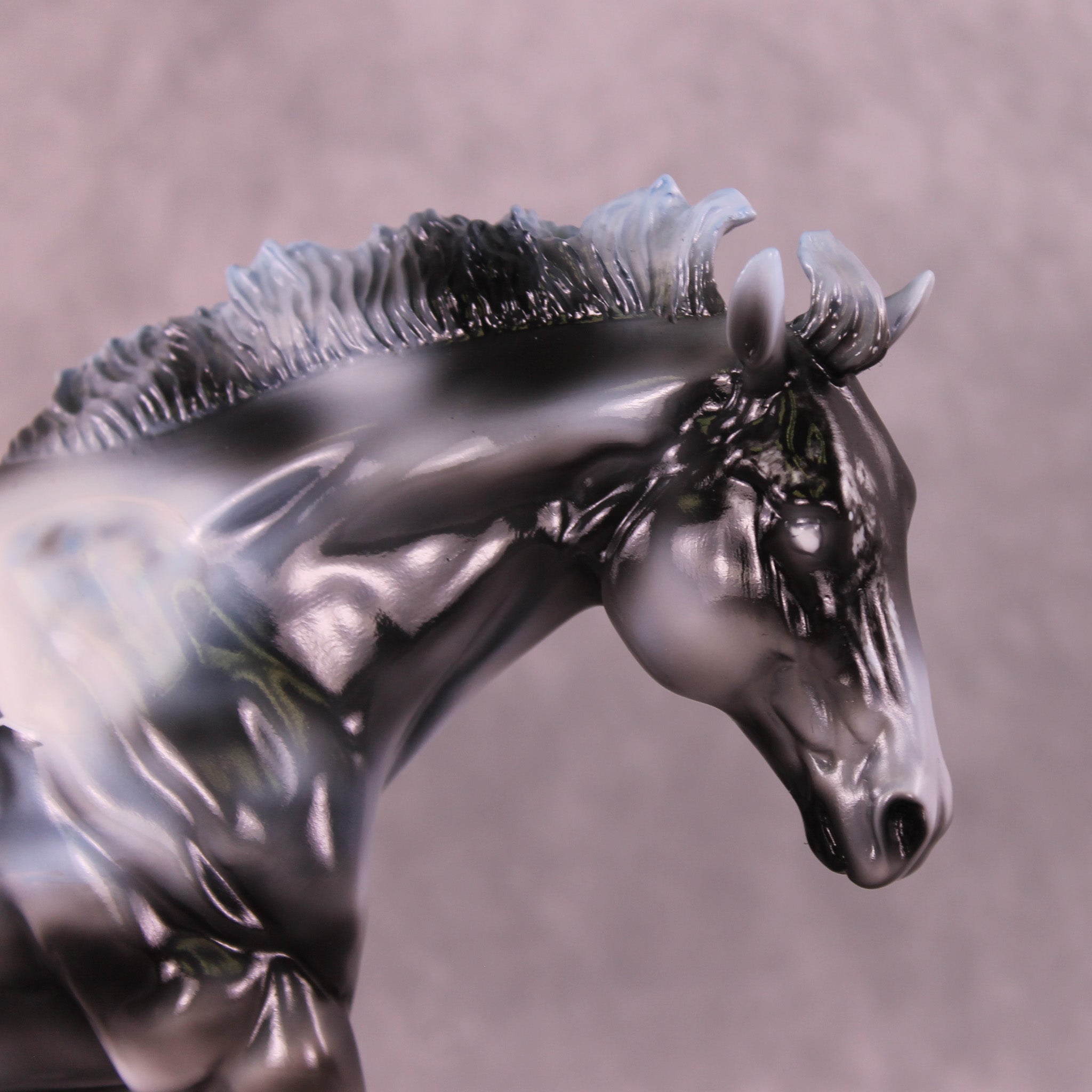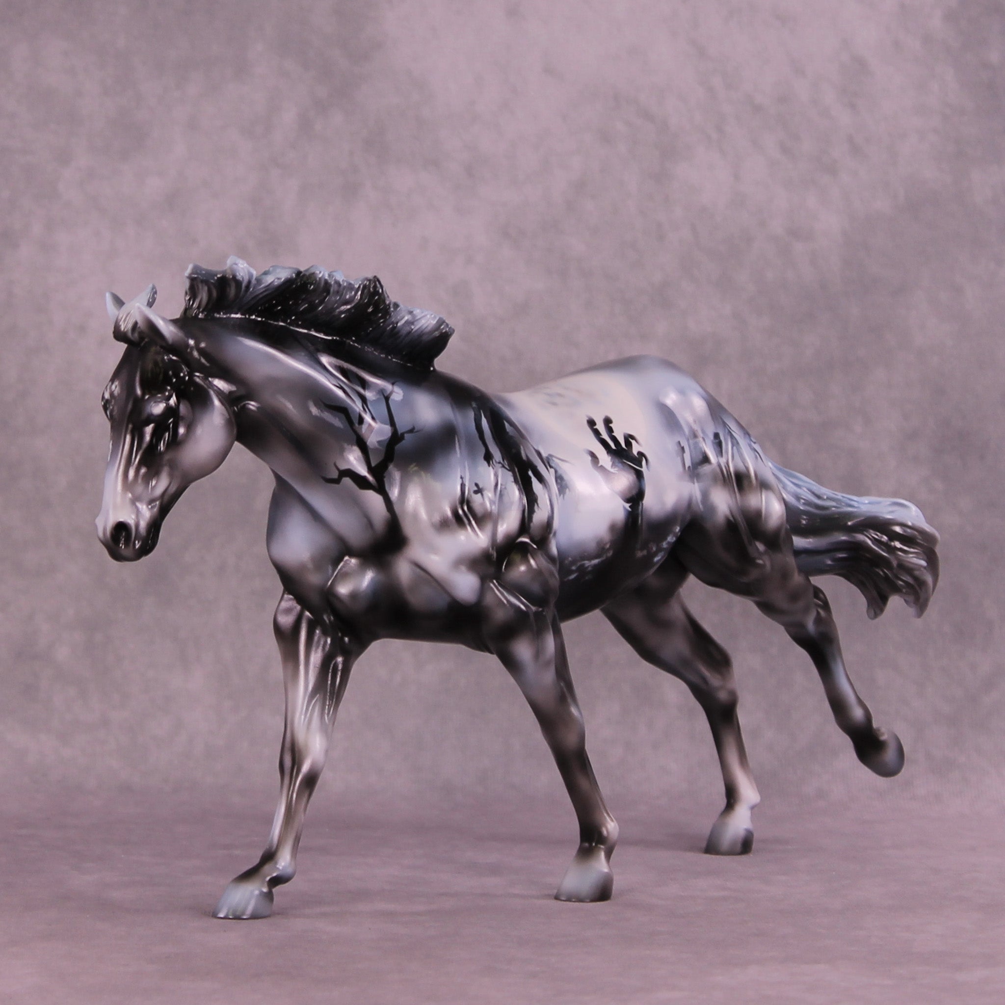 If this horse had a rating, he’d be PG-13. Kike has once again worked his magic – the depth of VERY SPOOKY field in this piece is nothing short of remarkable. You can practically hear the zombies trudging toward you through the mist, and some of them are FAR too close for comfort. Depicted on our Remington sculpture with his short mane, pattern flowing with the hair direction and finished in glossy, this piece is an October marvel.