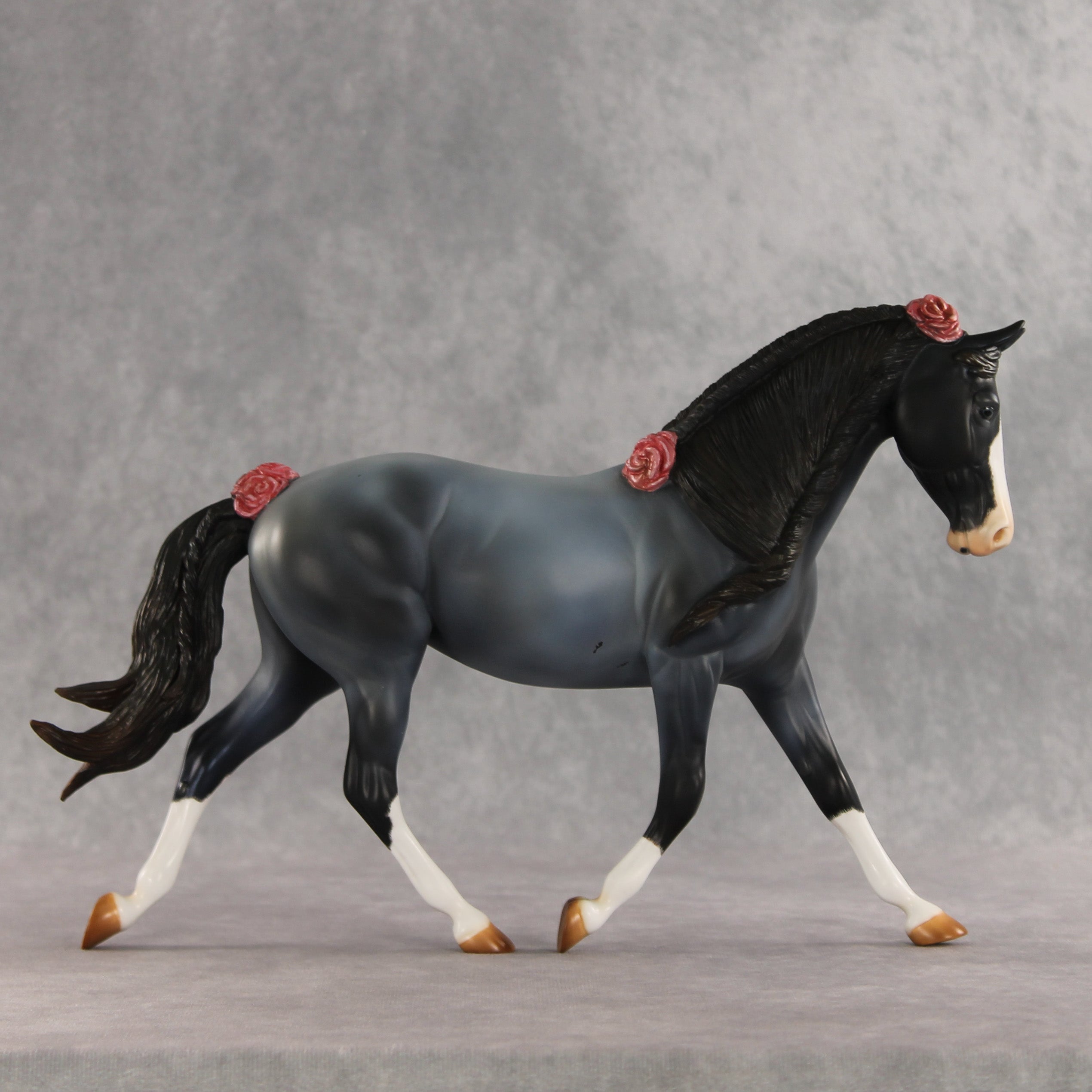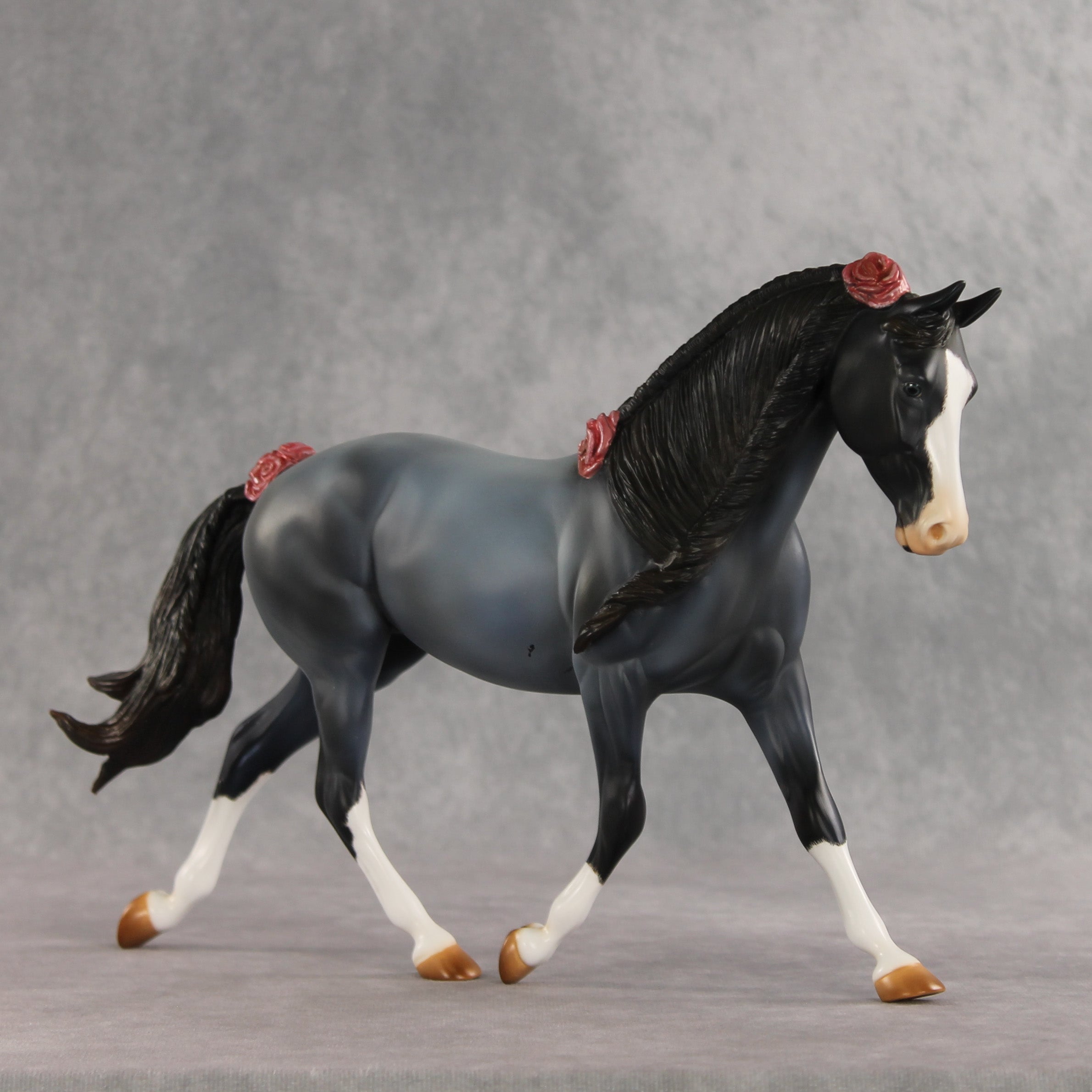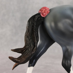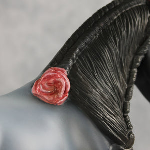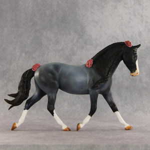 We can never have enough flowers! Arianna is a lovely Palouse her head and neck demurely tucked, with a custom braided mane and flowing tail with a small braid running through it, plus lovely roses added to the base of her tail, base of her mane, and top of her forelock. Kristen finished her in a soft blue roan complete with corn spots, blue eyes, etched white markings, and hand-painted mane details. Her roses are shaded with pinks and reds. She is finished in matte and additional finish options are not available. Customizing design credit on this piece belongs to Renee Justiss, who came up with her original elements!