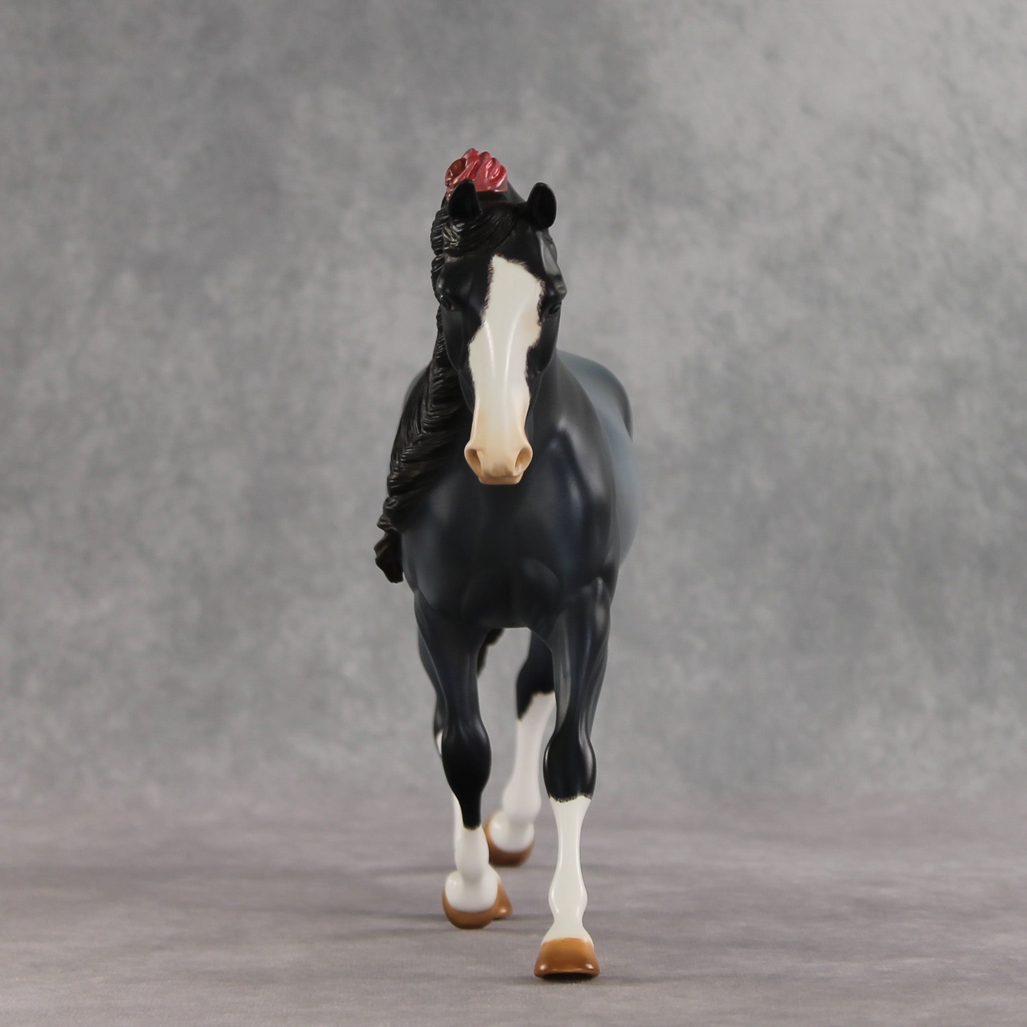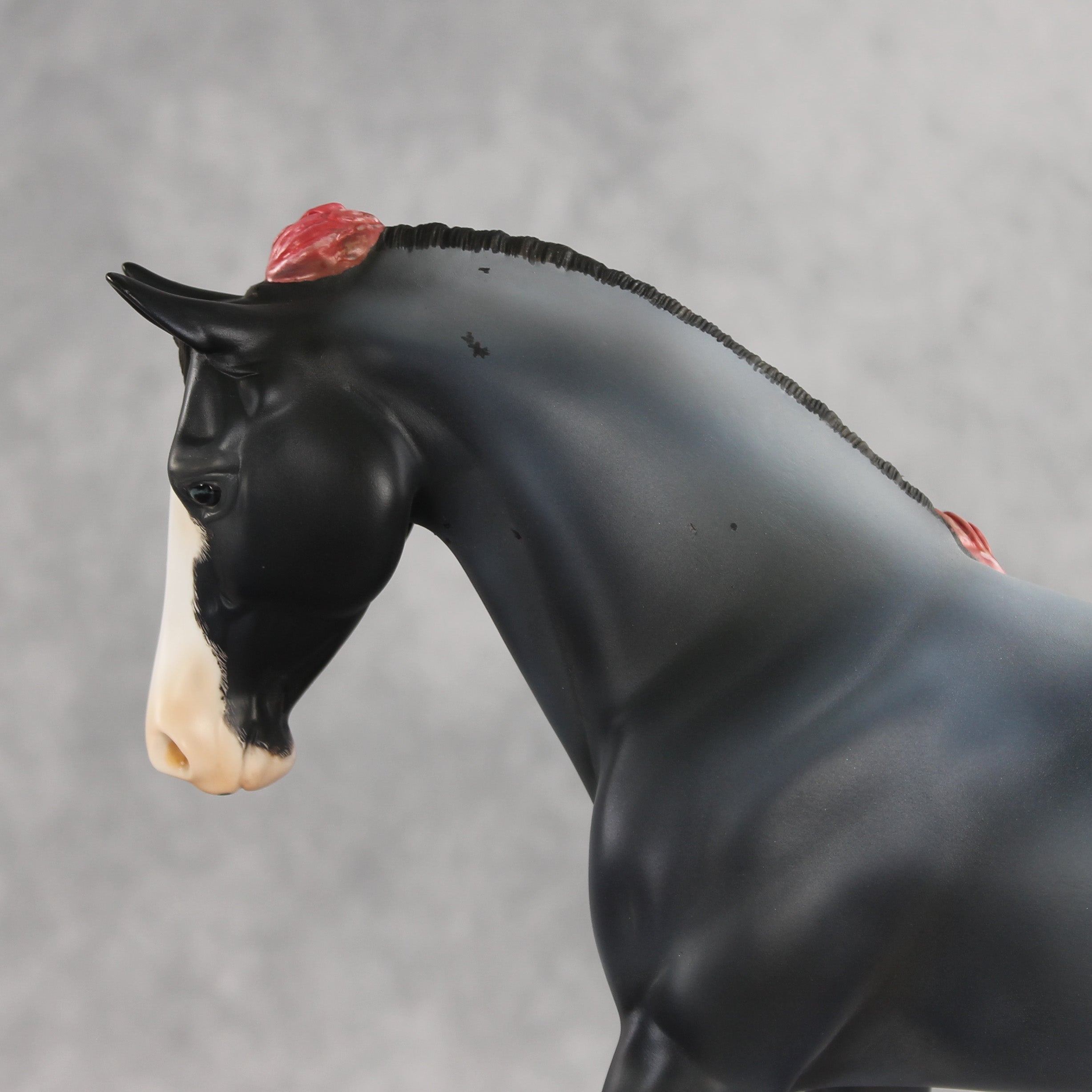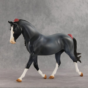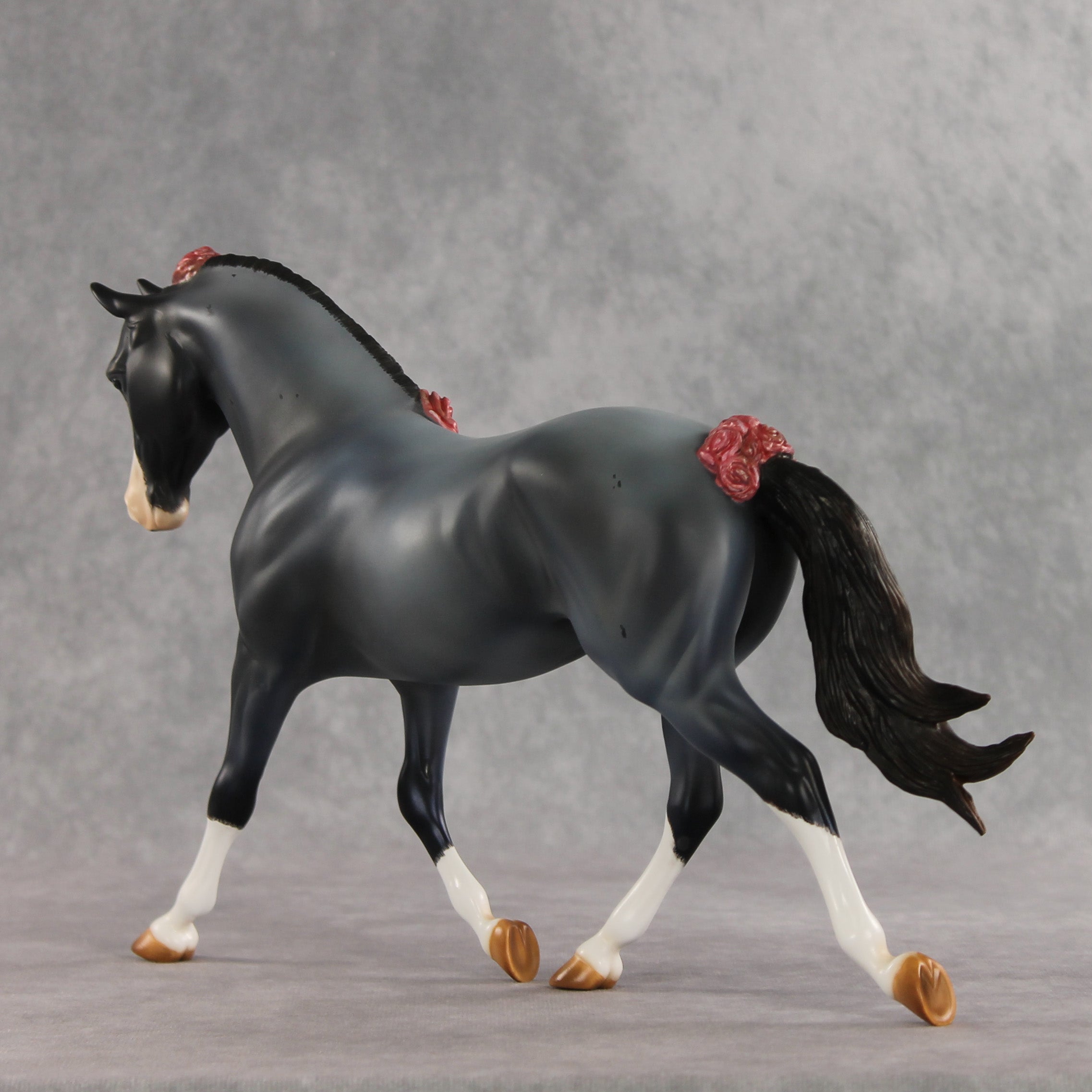 We can never have enough flowers! Arianna is a lovely Palouse her head and neck demurely tucked, with a custom braided mane and flowing tail with a small braid running through it, plus lovely roses added to the base of her tail, base of her mane, and top of her forelock. Kristen finished her in a soft blue roan complete with corn spots, blue eyes, etched white markings, and hand-painted mane details. Her roses are shaded with pinks and reds. She is finished in matte and additional finish options are not available. Customizing design credit on this piece belongs to Renee Justiss, who came up with her original elements!