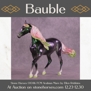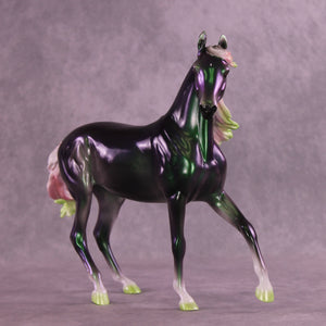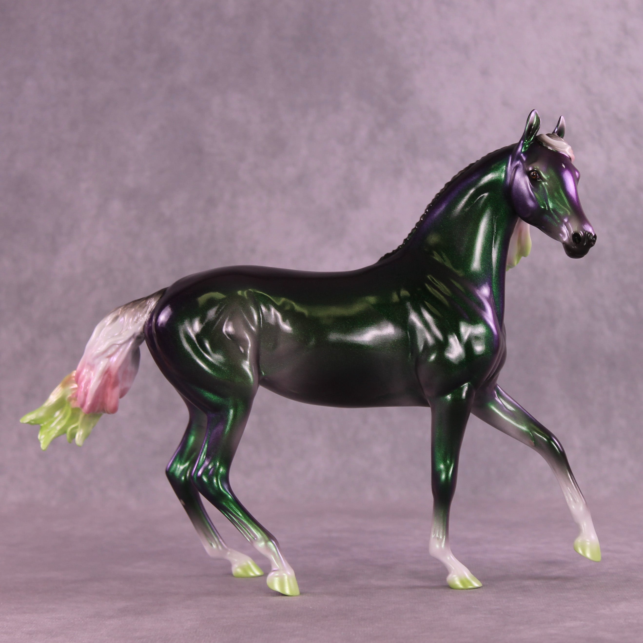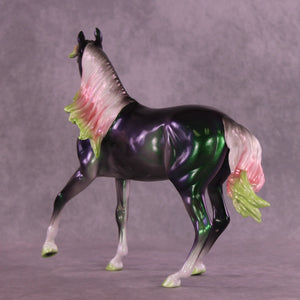 Holiday Cheer can take many forms, and we love Ellen’s interpretation here! On our lovely Arabian Mare mold customized with a long smooth mane and forelock and tail blowing in the breeze, Ellen painted her to a gorgeous color shift green/purple/gold, with softly shaded pearl white socks and green hooves, plus a festively shaded pearl red and green ombre mane and tail. She comes in a high gloss finish and no finish changes are available on this piece.