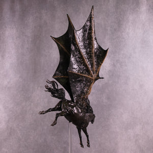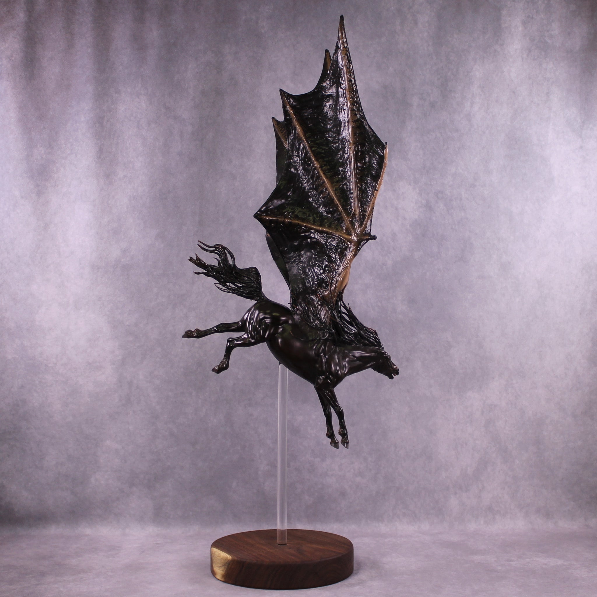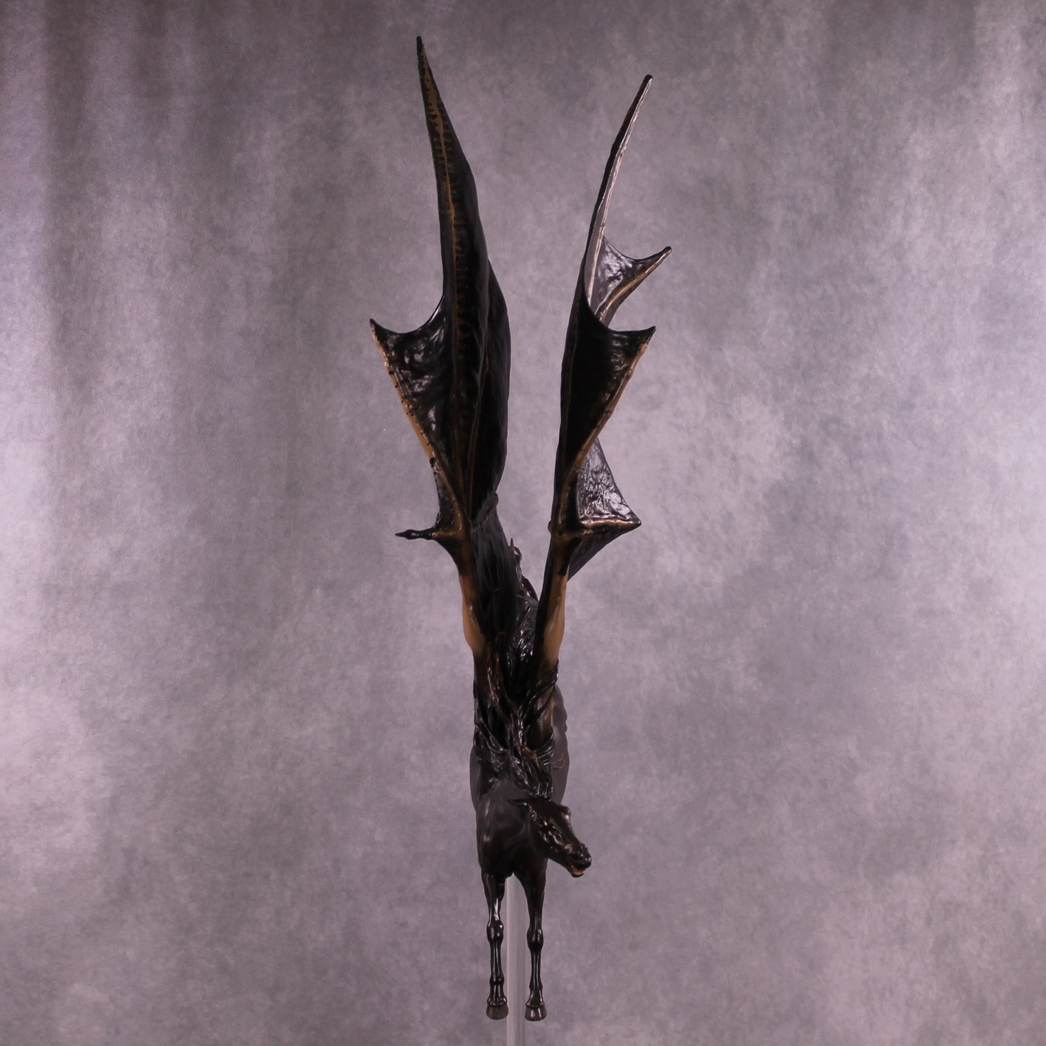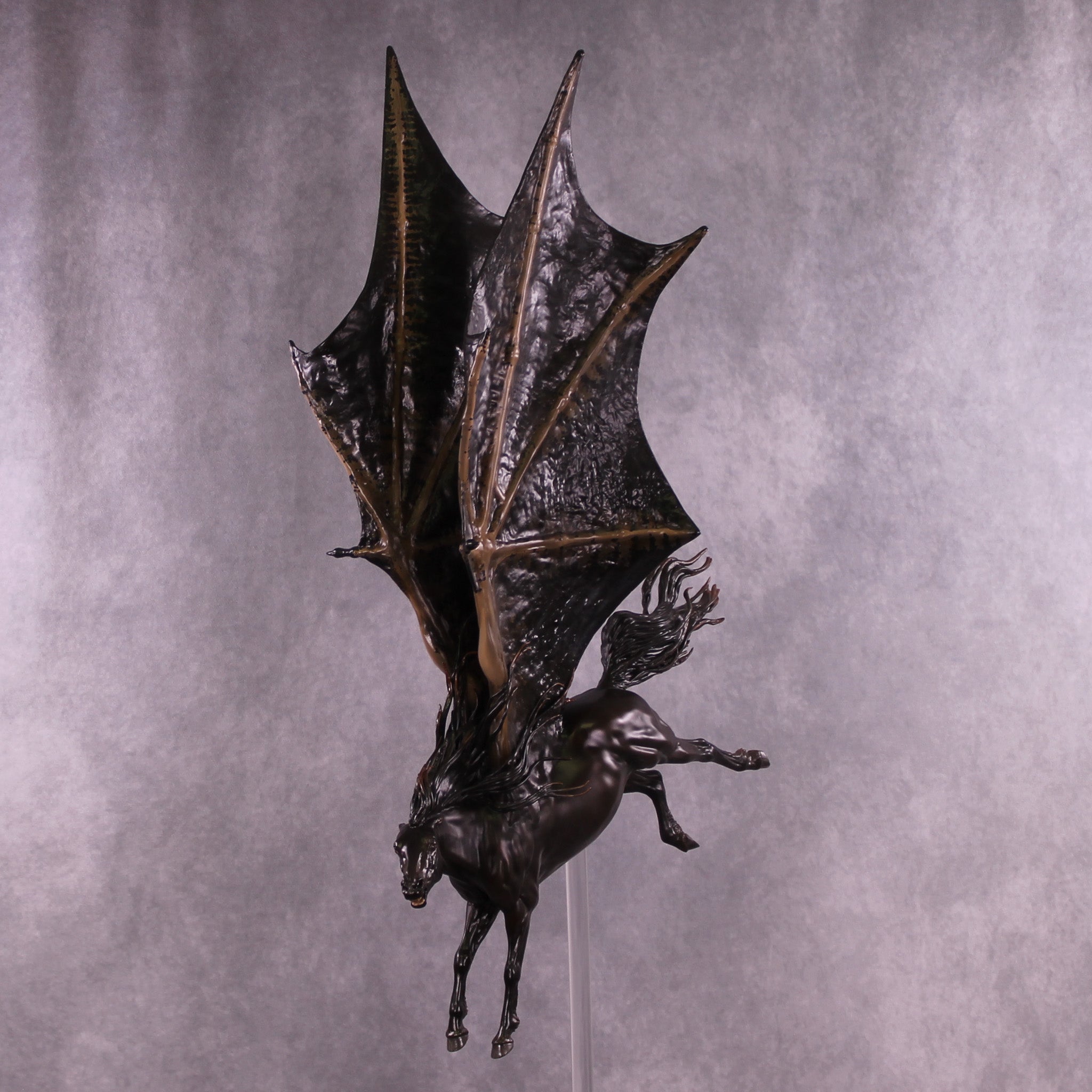 She is our Volo sculpture by Maggie, given an intensely complex new look. She has a whole newly remade angry biting head and neck, totally customized new mane and tail with extreme tendril detailing flowing between and around her enormous, to-scale bat wings. Her legs, hips, and shoulders have all been adjusted to be accurately in flight, and her wings are billowing back as she uses them to brake her flight through the air for an attack.