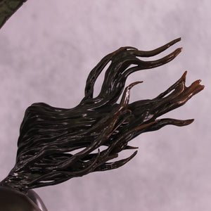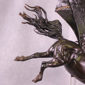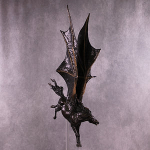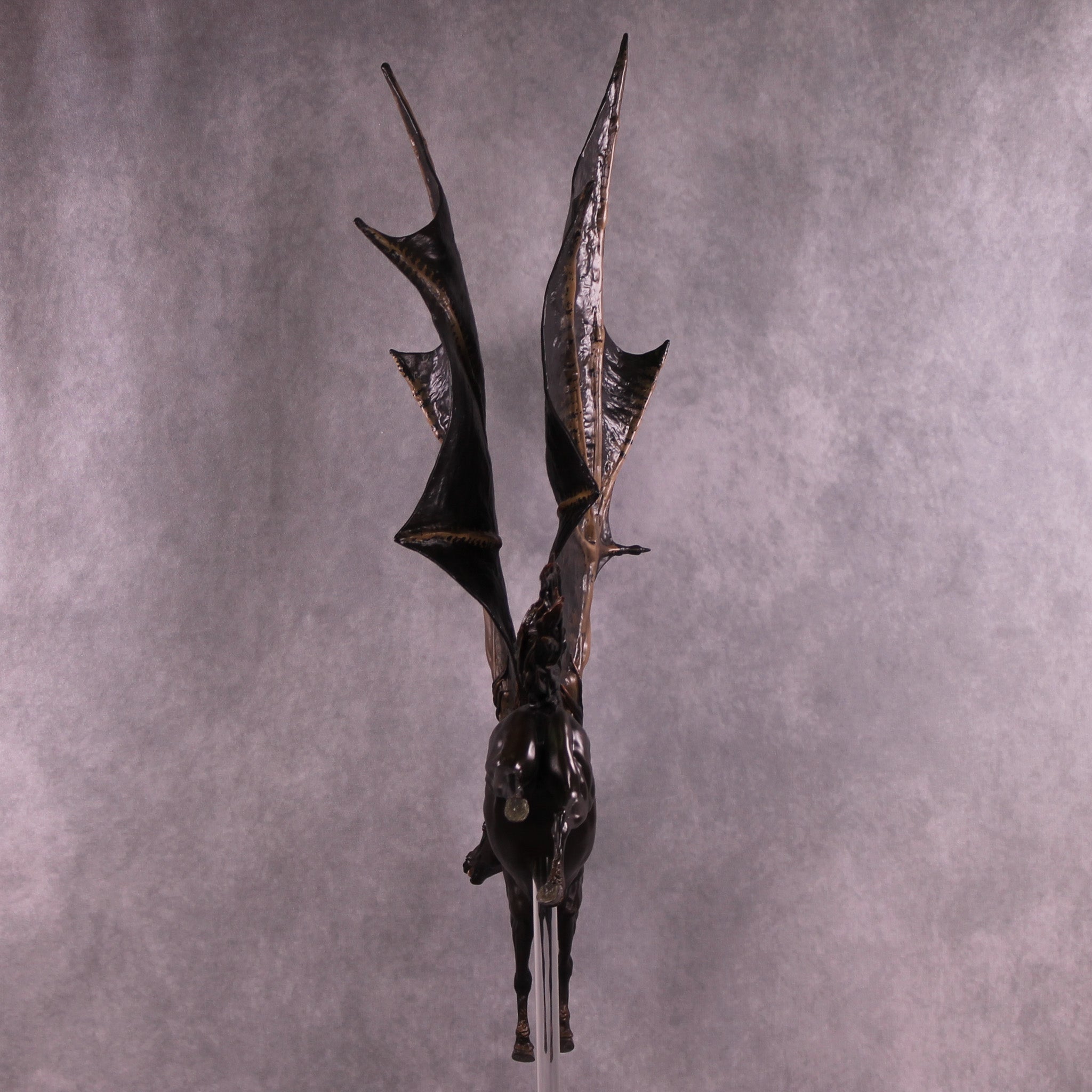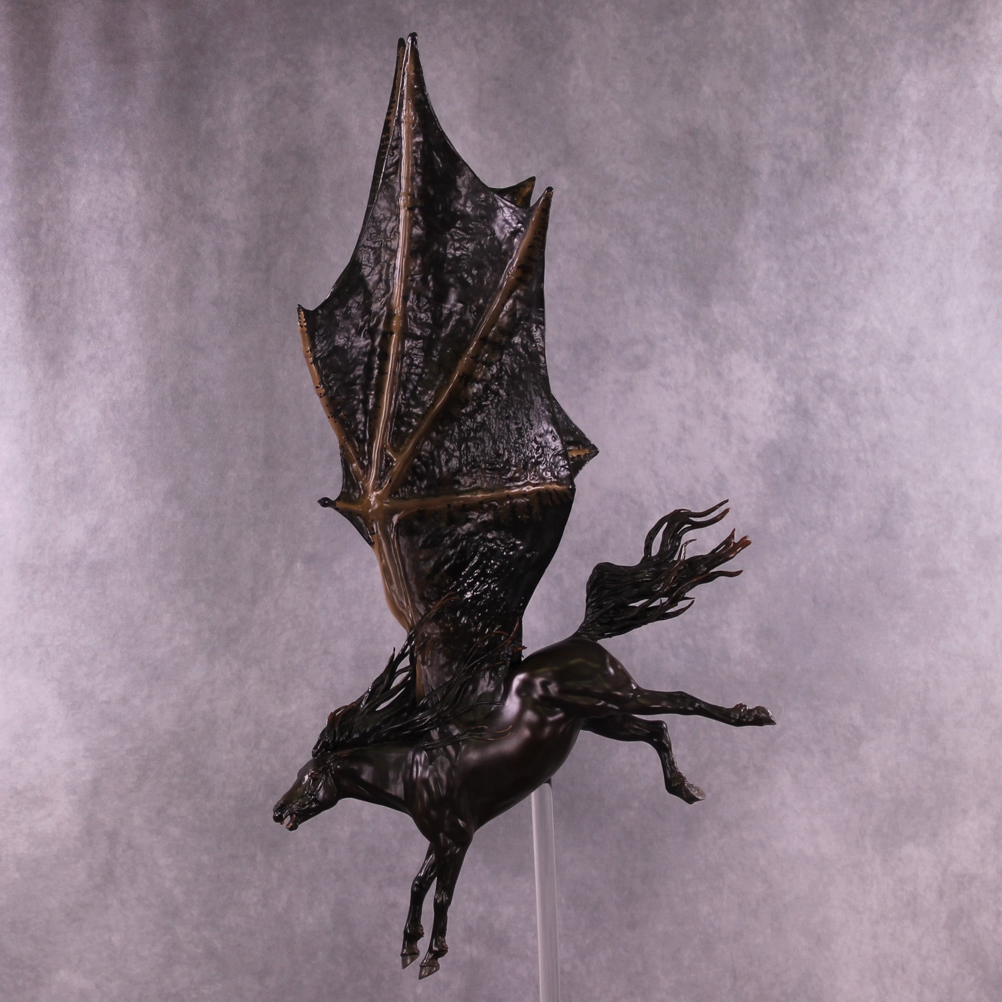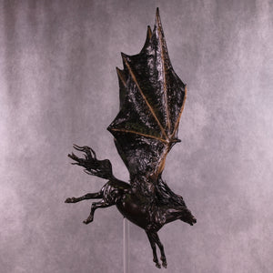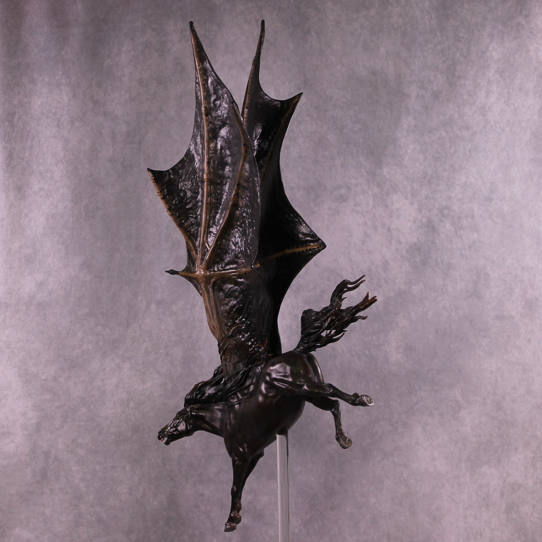 She is our Volo sculpture by Maggie, given an intensely complex new look. She has a whole newly remade angry biting head and neck, totally customized new mane and tail with extreme tendril detailing flowing between and around her enormous, to-scale bat wings. Her legs, hips, and shoulders have all been adjusted to be accurately in flight, and her wings are billowing back as she uses them to brake her flight through the air for an attack.