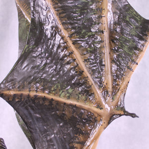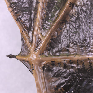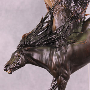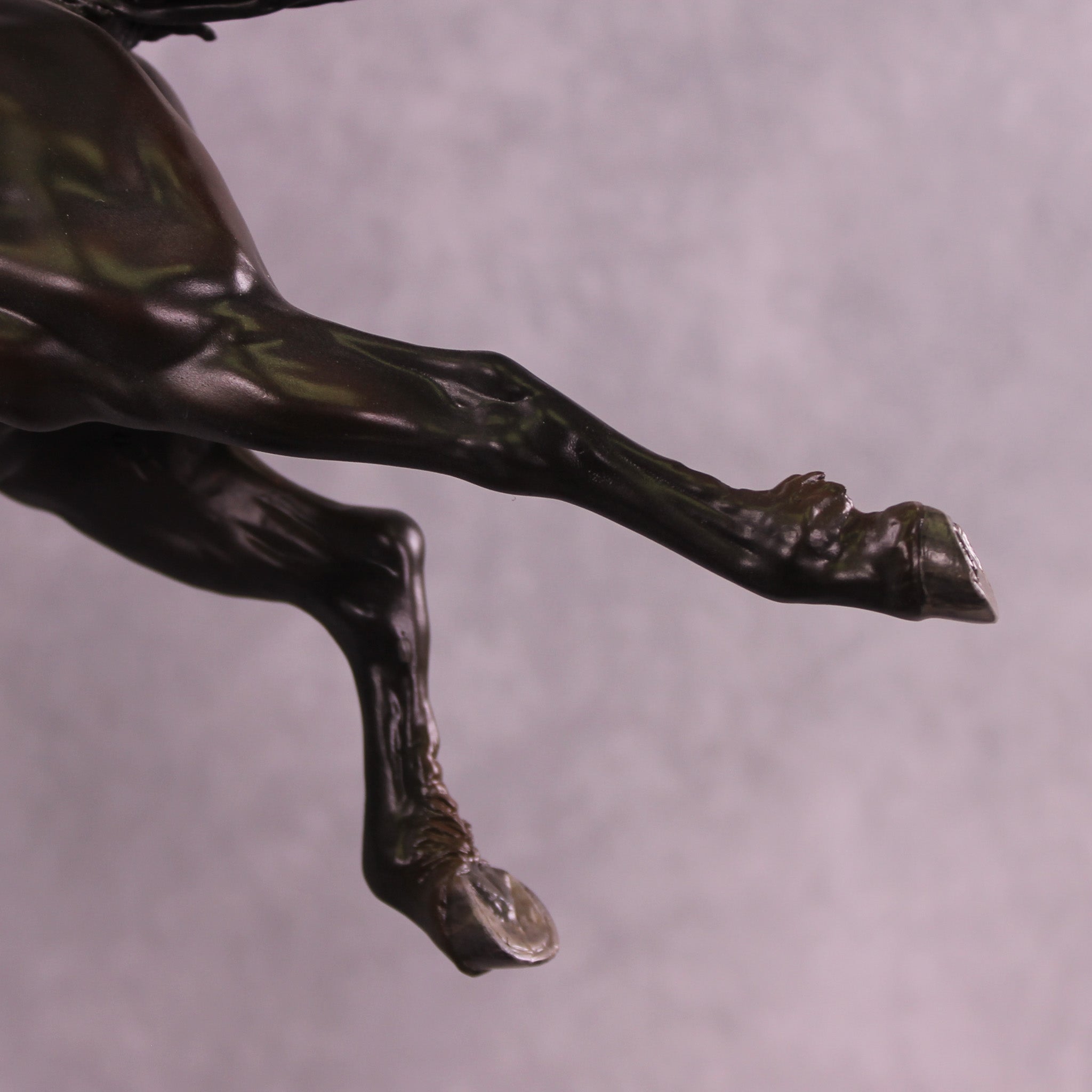 She is painted in an extremely complex black/bay, with mottled speckled striping through her wings to bring contrast into their dimension. Her wings are made from our plastic, reinforced with steel boning through her wings into her body to keep her wings standing tall for years to come. Her wing tips are actually coated in our plastic in black, to ensure that even if she does bump into a wall or the top of your door frame – she’s tall – there won’t be a visible rub to white plastic. Her wings alone are 21” long, and the whole piece from base to wing tip is just over three feet tall.