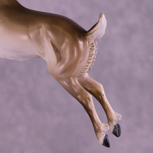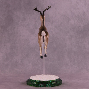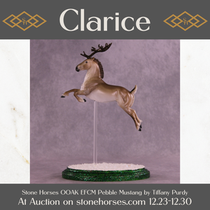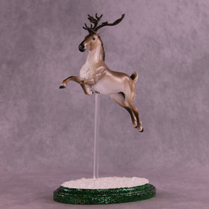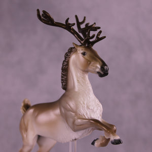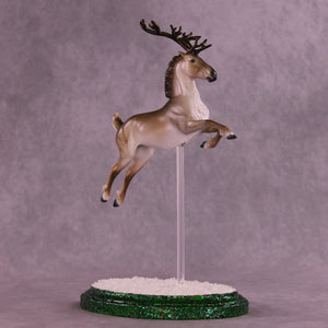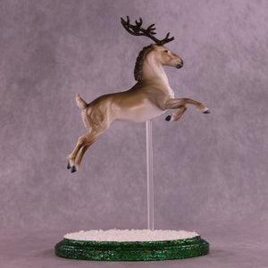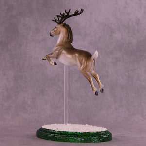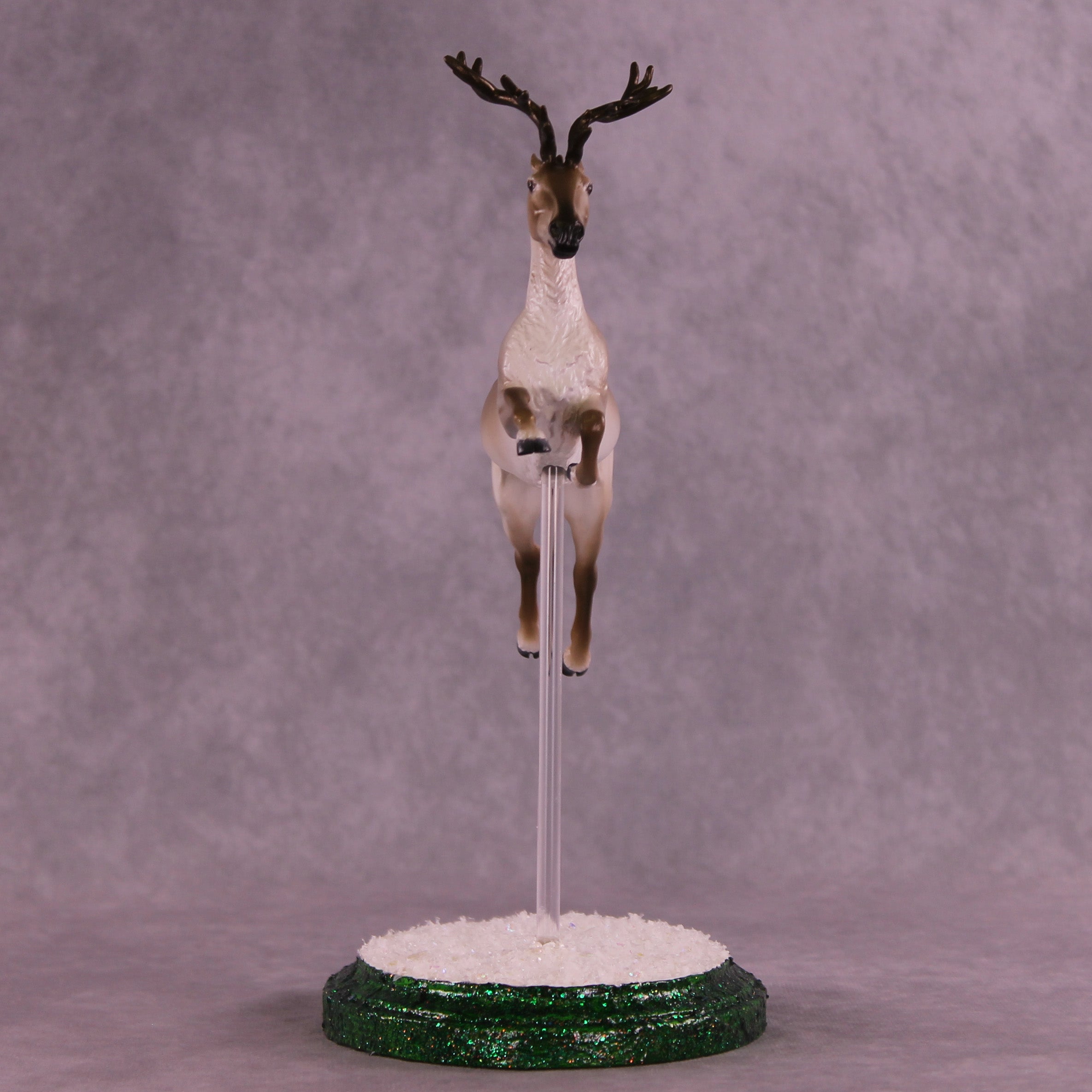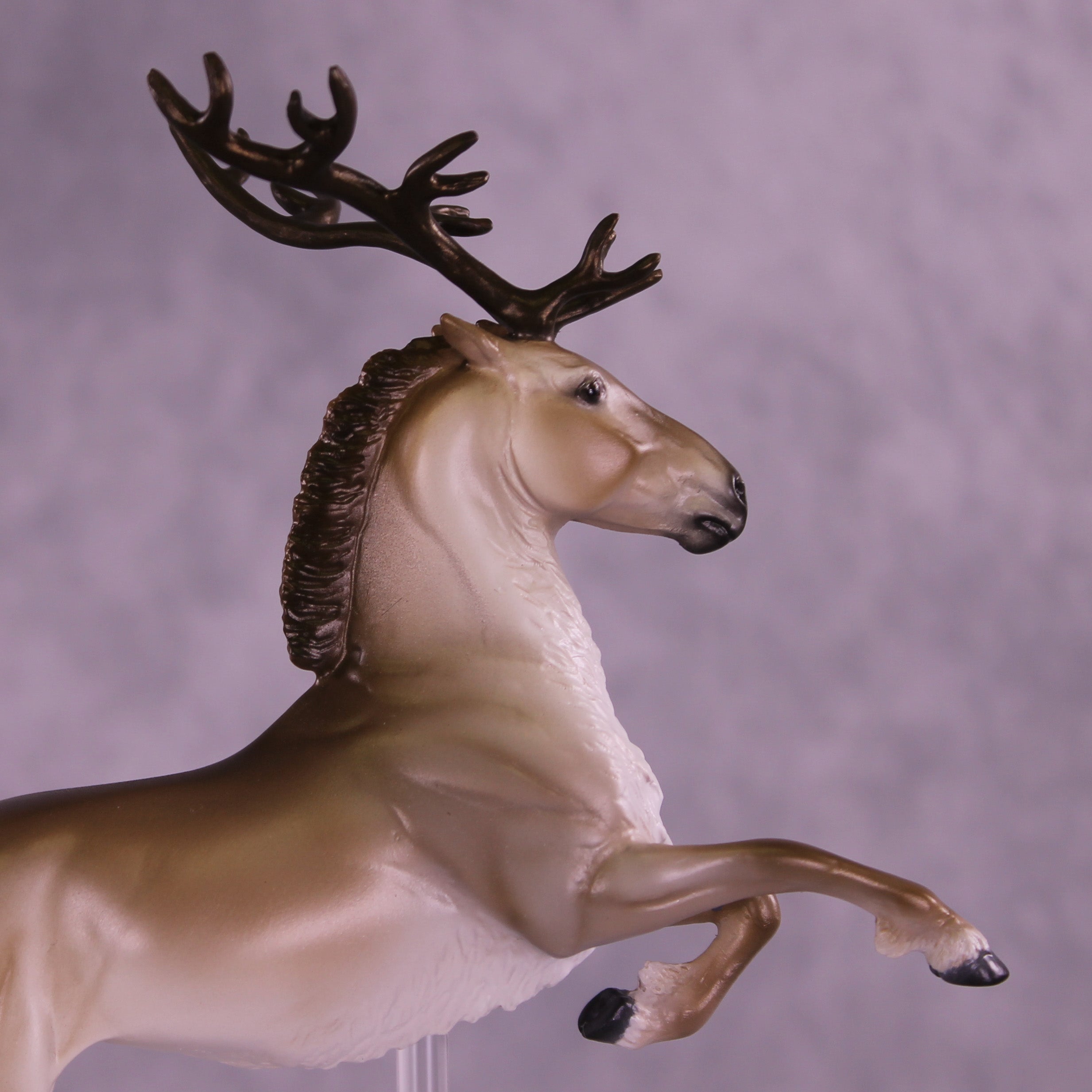 It would not be the Holiday Sale without some reindeer! Female reindeer don’t shed their antlers in the winter, so all of our reindeer are ladies – including this beauty by Tiffany Purdy! Tiffany took our Pebble Mustang and gave him – her – an extreme makeover from nose to tail. She has an all new reindeer style mane and tail, repositioned head and neck, new hand built antlers, feathering on all four legs, fuzzies down the backs of her hind legs, and more! Tiffany painted her to a gorgeously soft warm grulla brown with loads of shading and dimension, and then finished her off with a glittering removable base and acrylic stand. She comes in a gorgeous satin matte with no finish changes available.