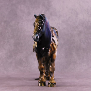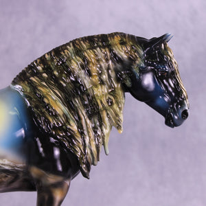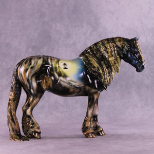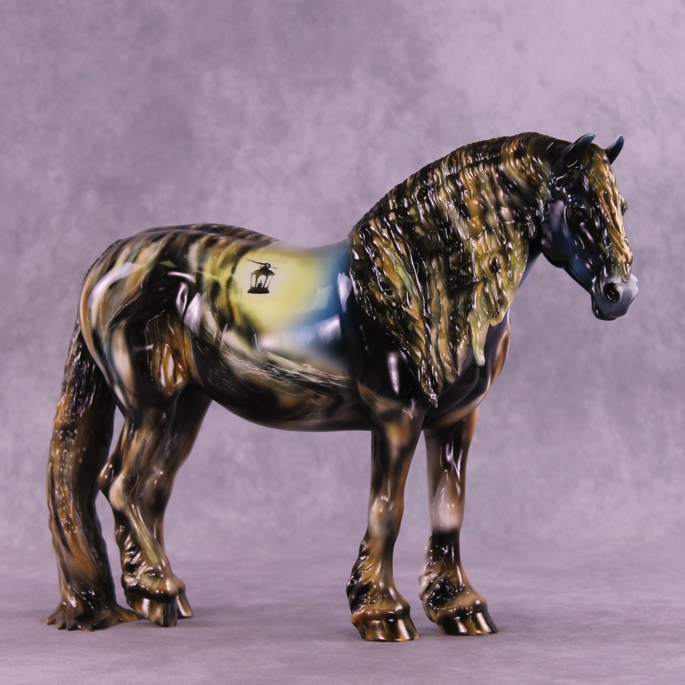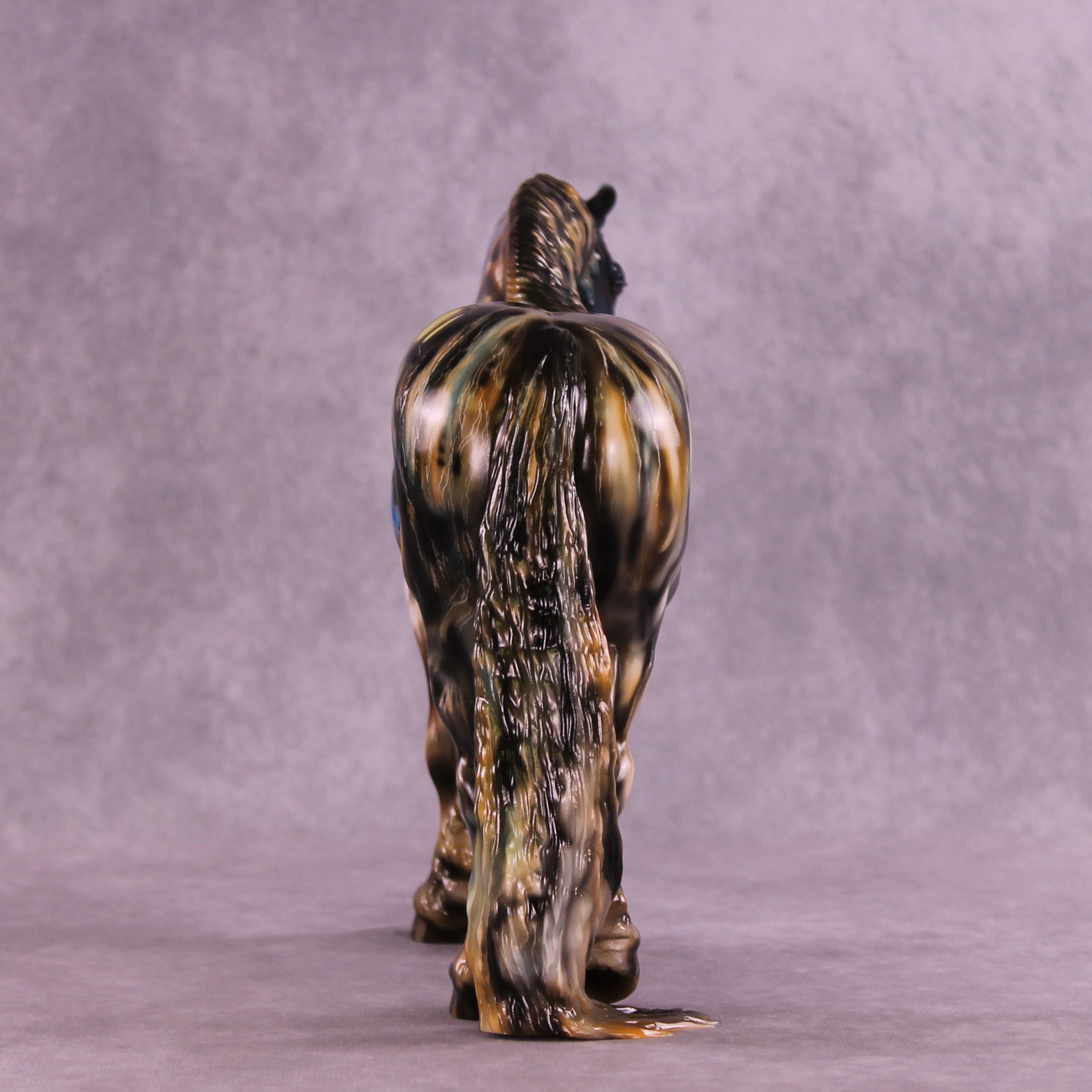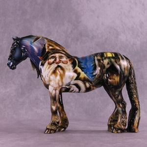 This piece is another that only Enrique could pull off. He chose a whimsical forest gnome design, mapping out the details of the gnome and then building in incredible detail in his tree trunk home, evergreen tree background, and more. The depth of field Enrique achieves in his pieces is incredible every time, and this piece is a shining example of that artistic skill. Depicted on our Bunny sculpture with her extra long wavy mane, tail, and forelock, this piece comes glossed and does not have finish changes offered.