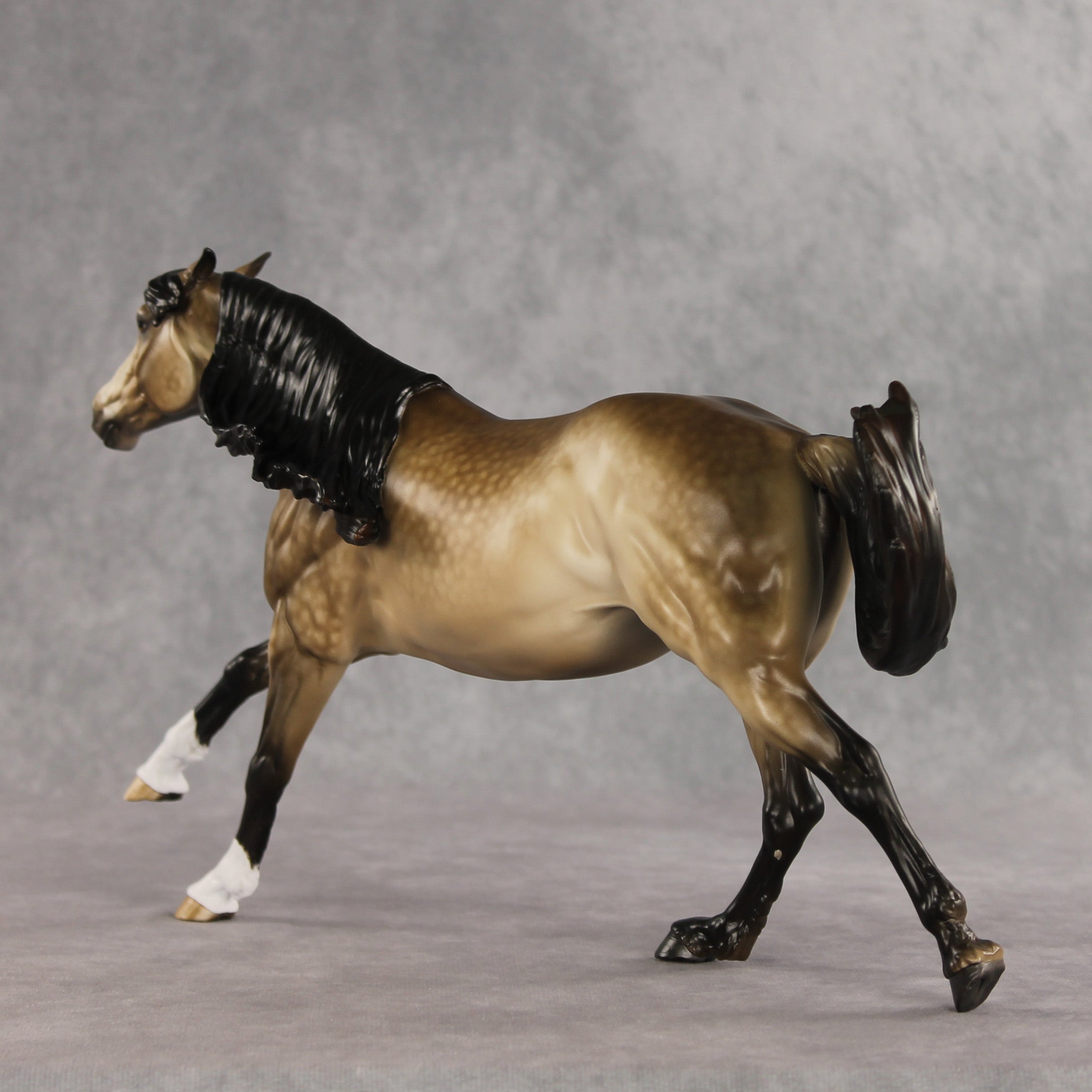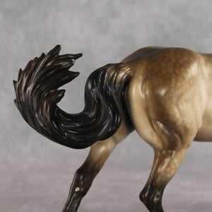 Eurwen is going for the gold! With a Welsh name meaning white gold, this gorgeous mare by Sheryl Leisure is a standout piece. The volo sculpture customized with grumpy pinned ears and a windswept mane and tail give this girl dynamic flair. Sheryl’s incredible handiwork is on display in her shaded buckskin coat loaded with dapples. Etched white markings and hoof stripe details bring her to life. She is finished in satin with additional finish options available.