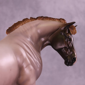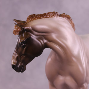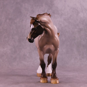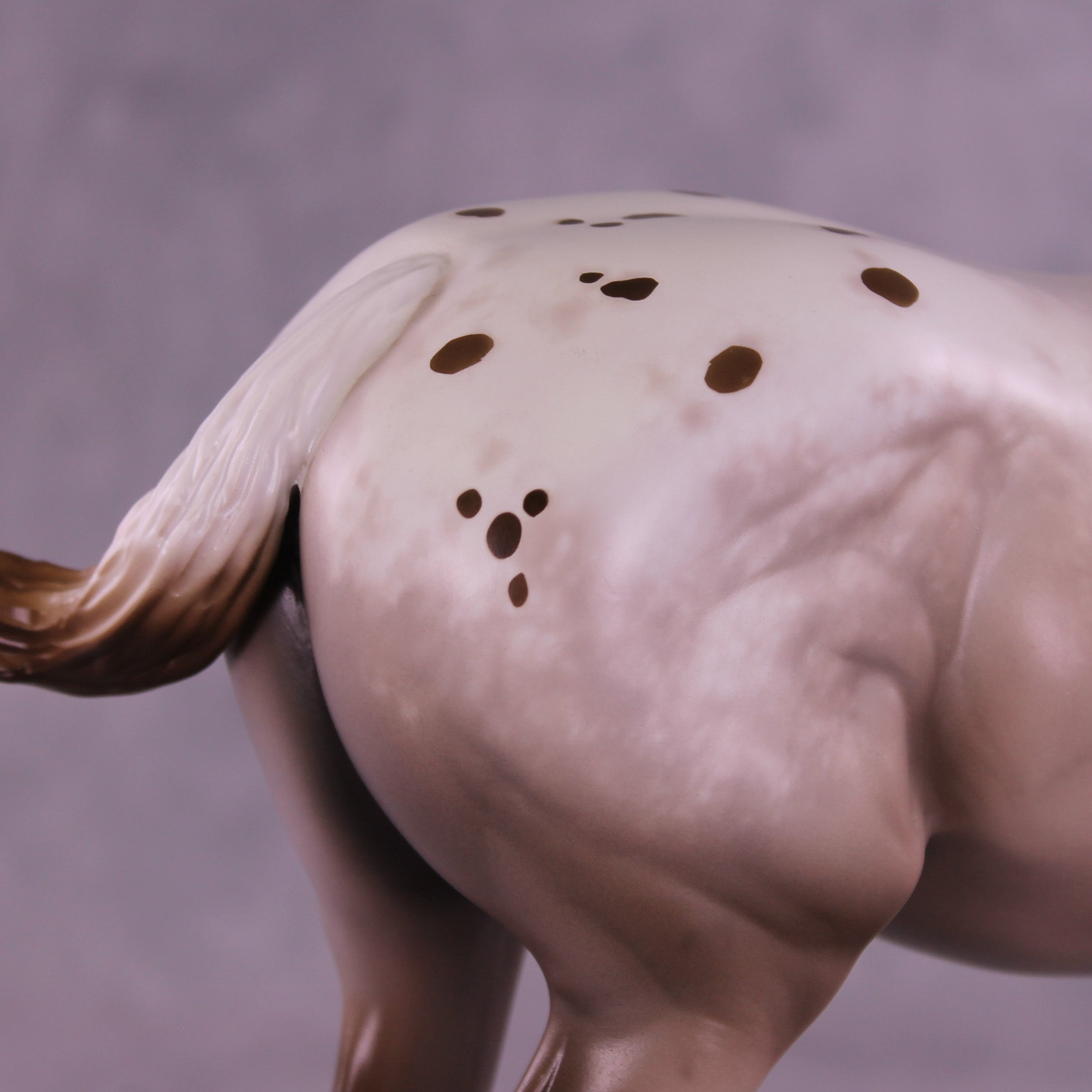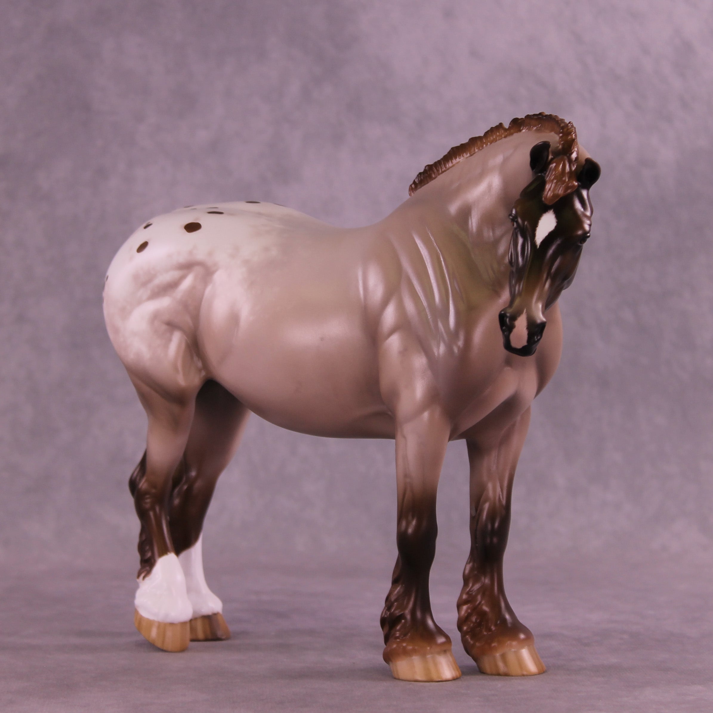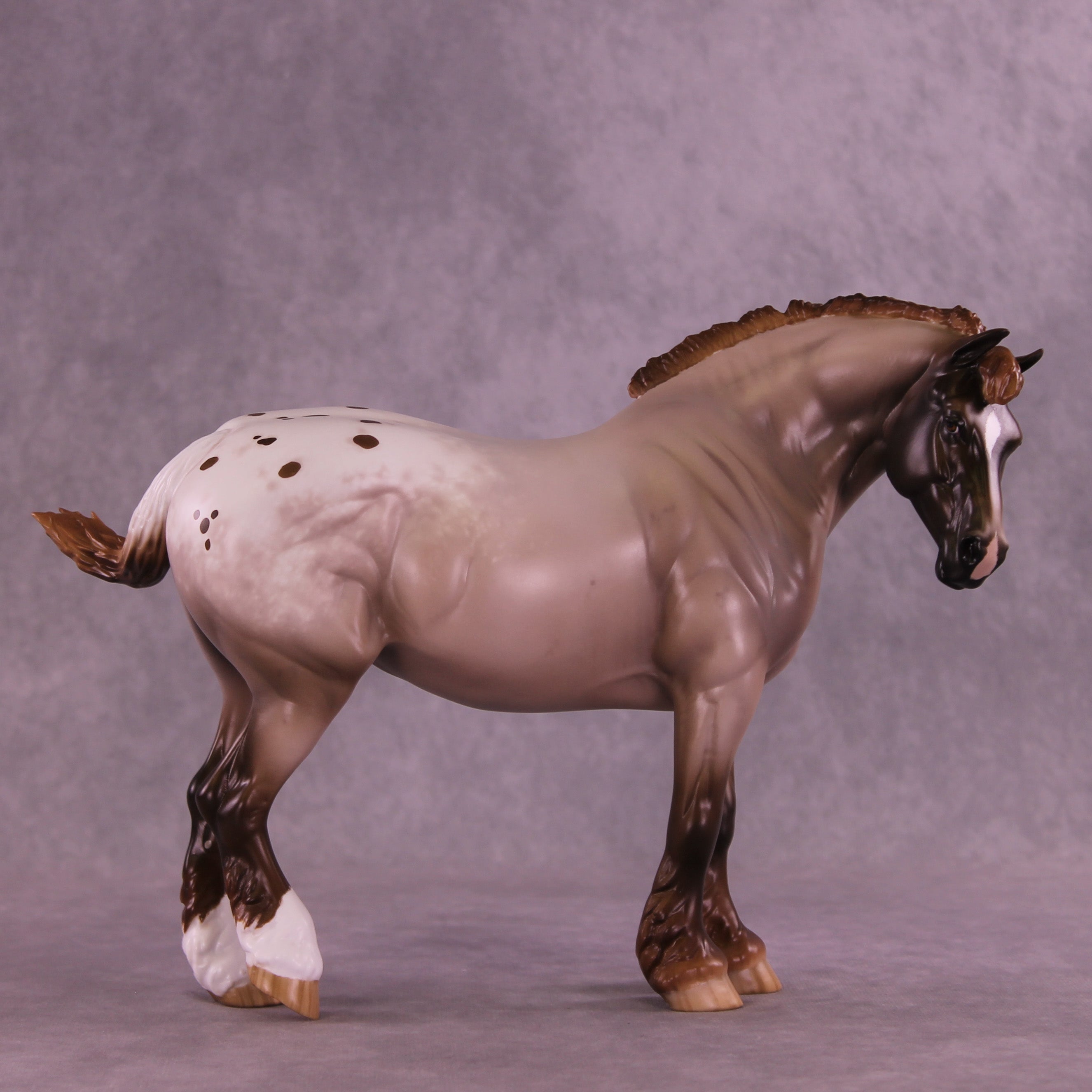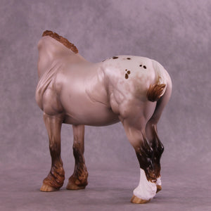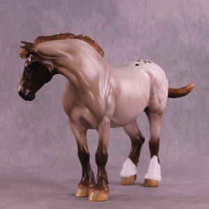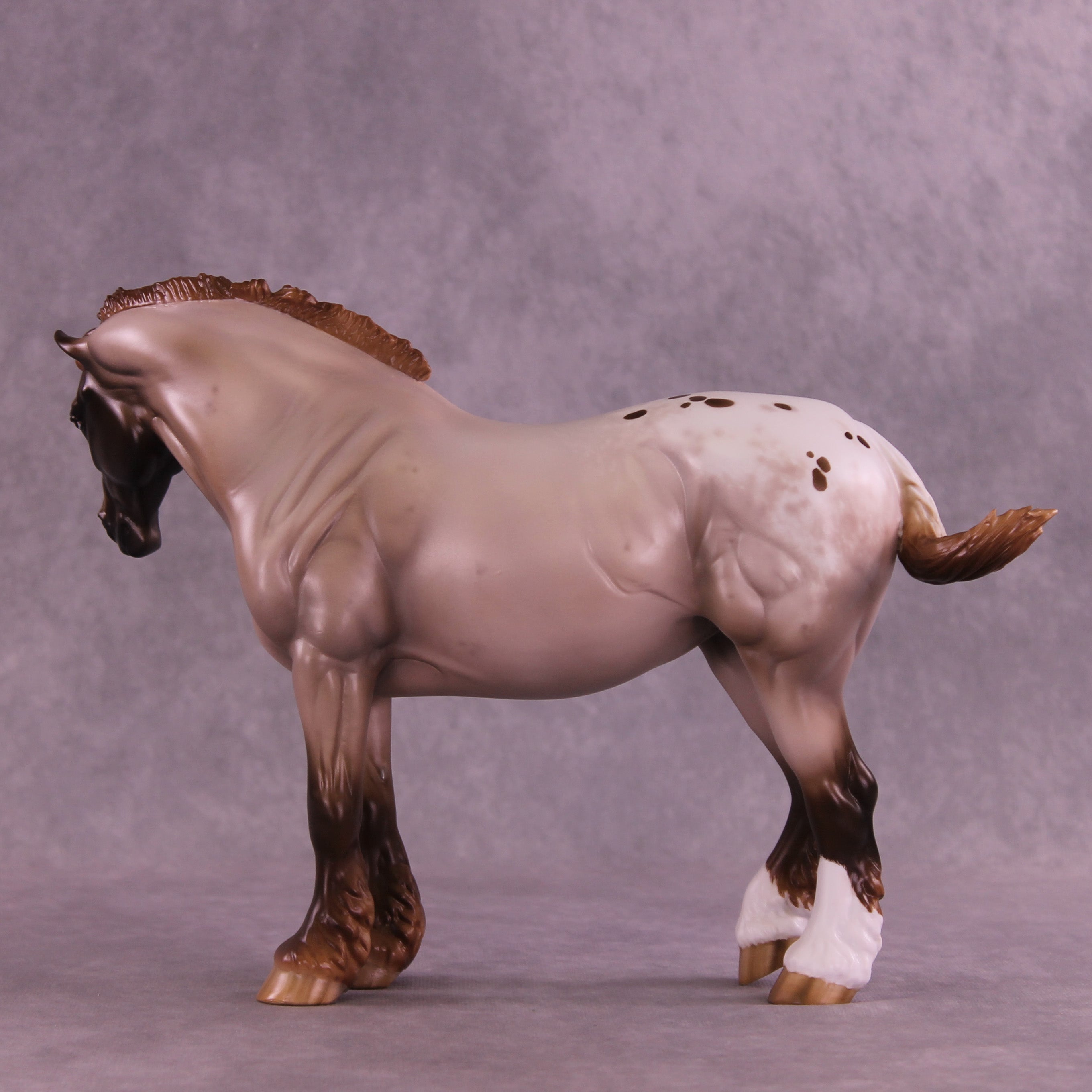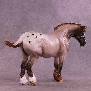 What a lady! Mel Miller gave our Bunny drafter a new look with a turned and lowered head and neck position, plus a short scrubby mane and tail, and a thinner appy style tail that is swishing in, what, annoyance? Impatience? Simply getting rid of a fly? You can decide! Sheryl painted her to a gorgeous chestnut appaloosa roan design with all the details she is known for – lacy spot edging, pinked nose snip, striped hooves, added facial detailing, and more! She is available in all finish options.