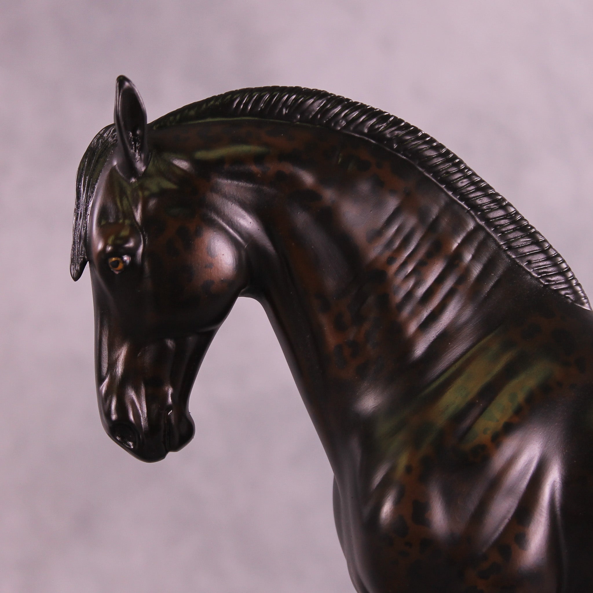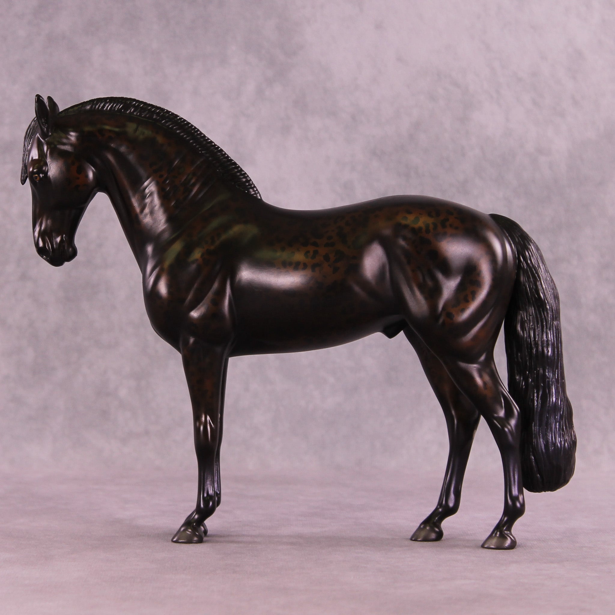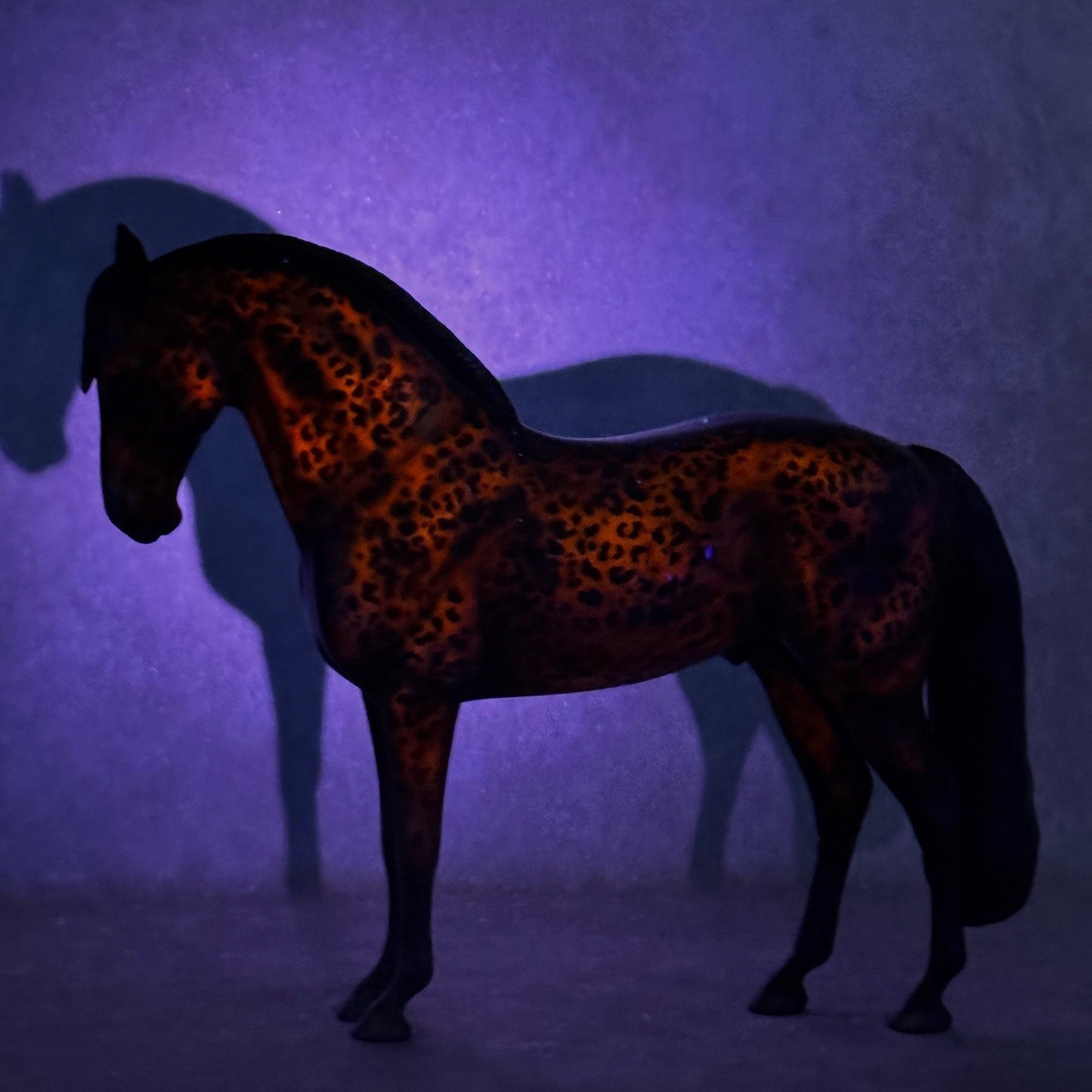 Our models often have more characteristics to them than meets the eye, and this guy is an ideal example of this depth of design. Jess worked with our Andalusian sculpture, customized with a roached mane and his long tail and straight forelock. She painted him to a deep shaded black bay with leopard spots, but there’s more … shine a UV light on this piece and he comes alive with fluorescent orange popping out from under his leopard design! All finish options are available on this piece.