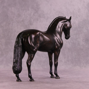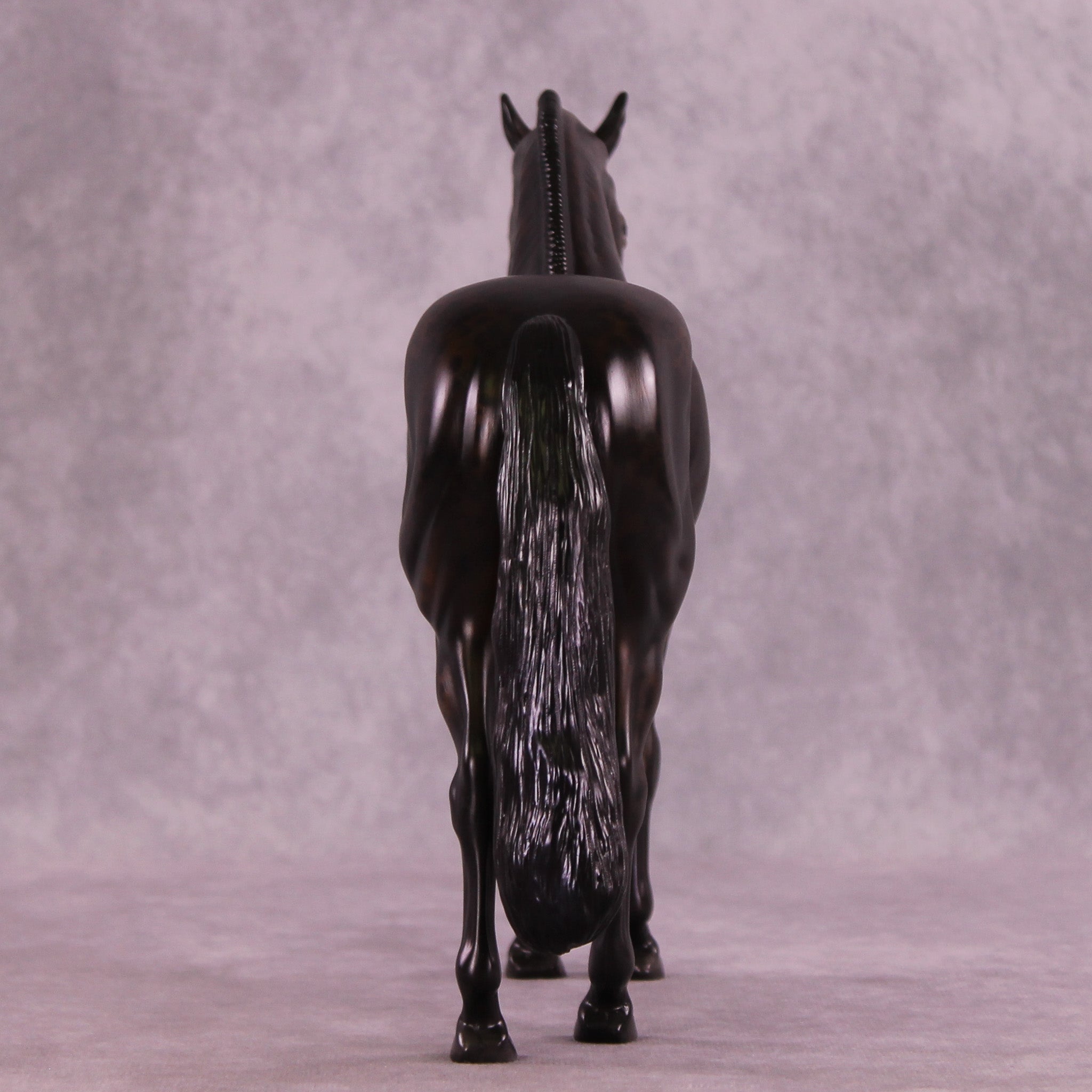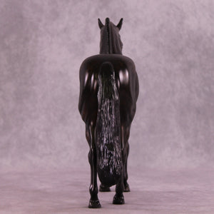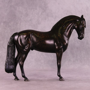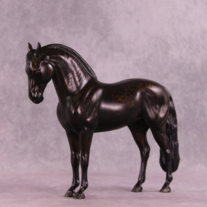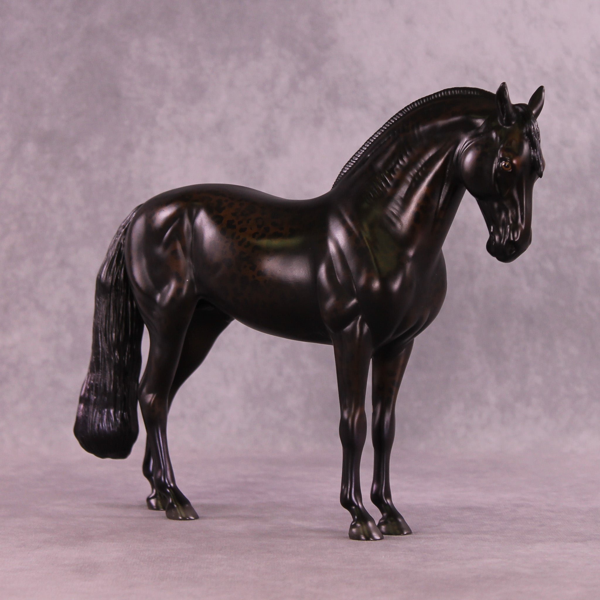 Our models often have more characteristics to them than meets the eye, and this guy is an ideal example of this depth of design. Jess worked with our Andalusian sculpture, customized with a roached mane and his long tail and straight forelock. She painted him to a deep shaded black bay with leopard spots, but there’s more … shine a UV light on this piece and he comes alive with fluorescent orange popping out from under his leopard design! All finish options are available on this piece.