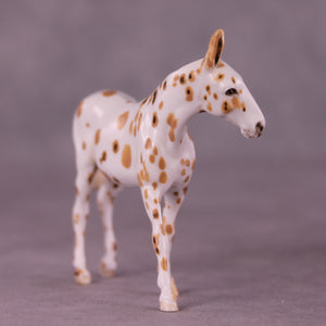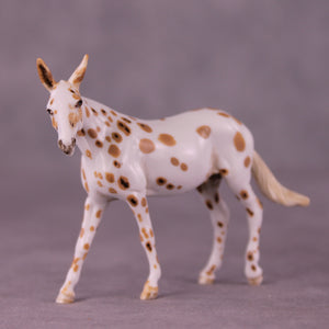 Andrea has created a wonderful collection of mules with various plays on famous Jacks! This one features a turned head, twitched listening ear, and a swishing tail. He is then painted to a gorgeously detailed leopard appaloosa with loads of hand painting and hair detailing! All finish options are available on this piece.