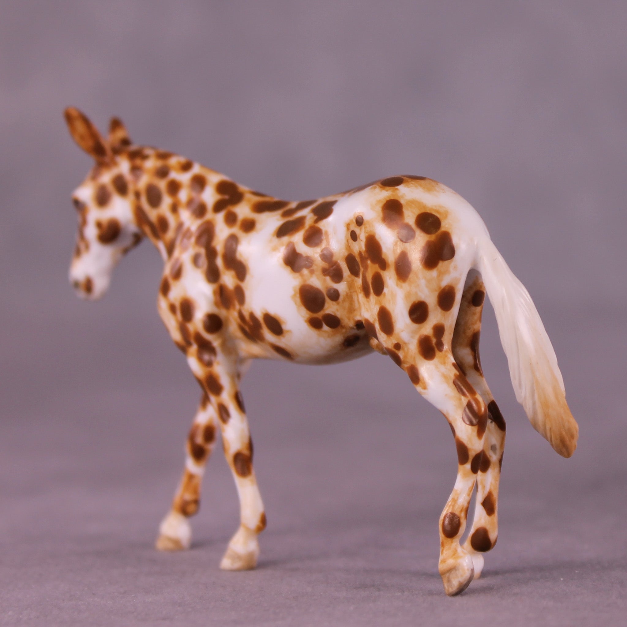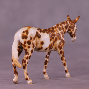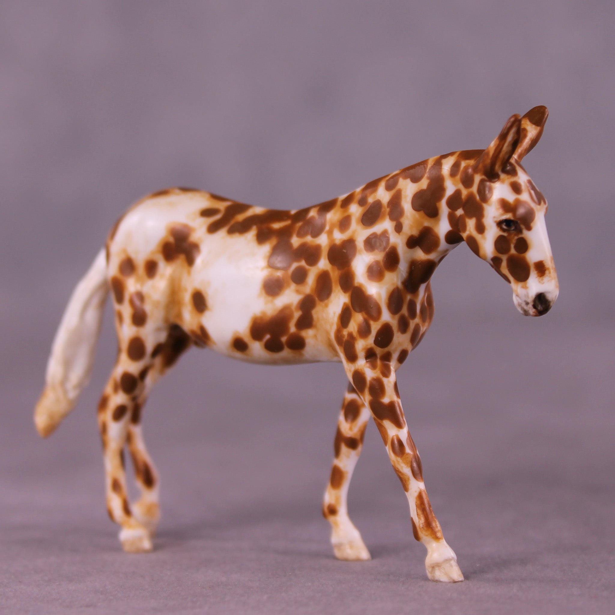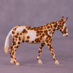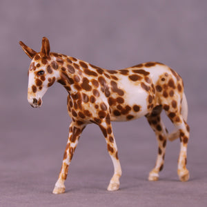 Andrea has created a wonderful collection of mules with various plays on famous Jacks! This one features a straightened and lowered neck and head, twitched listening ear, and a gently swishing tail. He is then painted to a gorgeously detailed leopard appaloosa with loads of hand painting and hair detailing! All finish options are available on this piece.