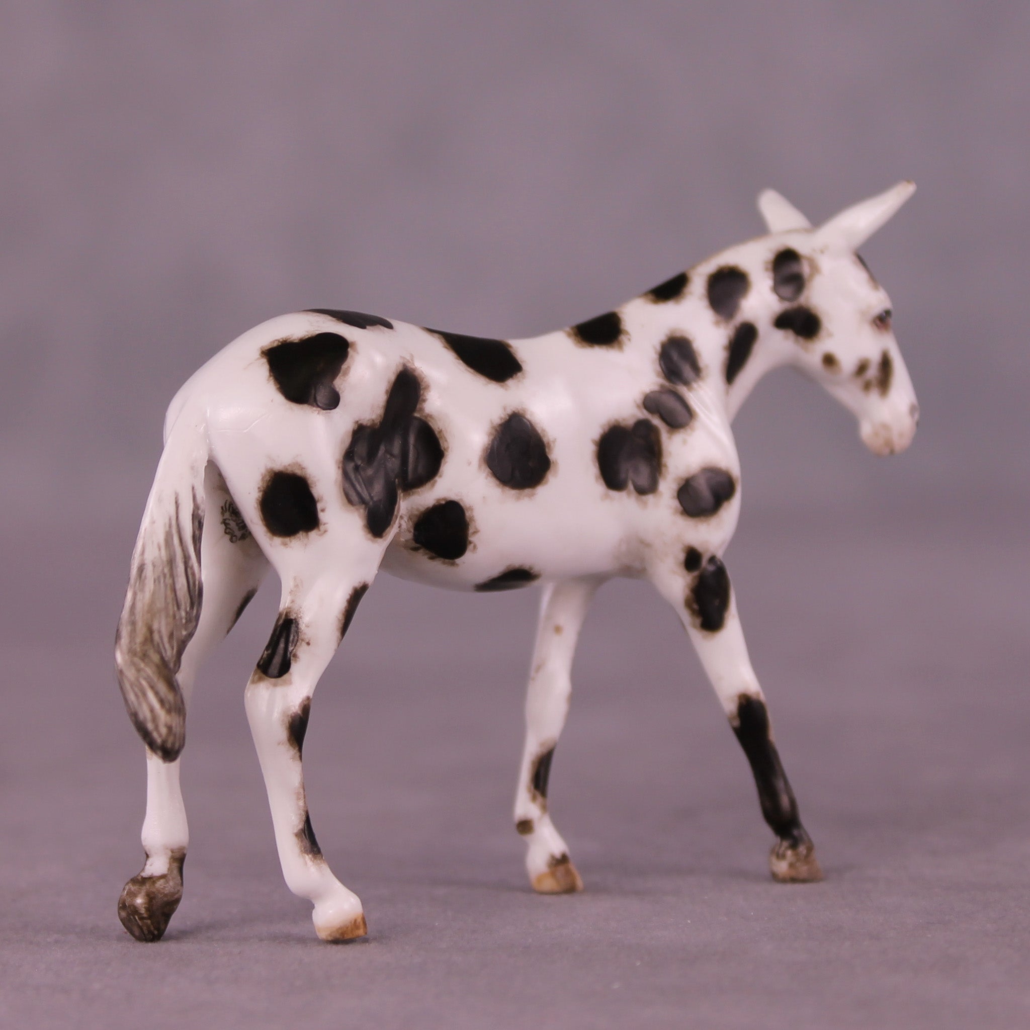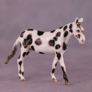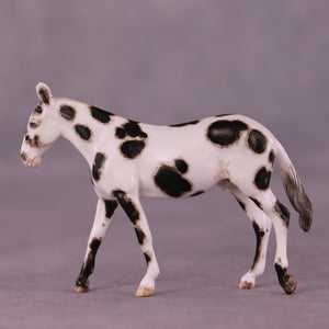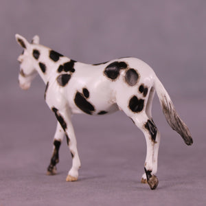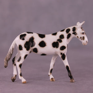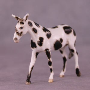 Andrea has created a wonderful collection of mules with various plays on famous Jacks! This one features a straightened and lowered neck and head, twitched listening ear, and a gently swishing tail. He is then painted to a gorgeously detailed leopard appaloosa with loads of hand painting and hair detailing! All finish options are available on this piece.