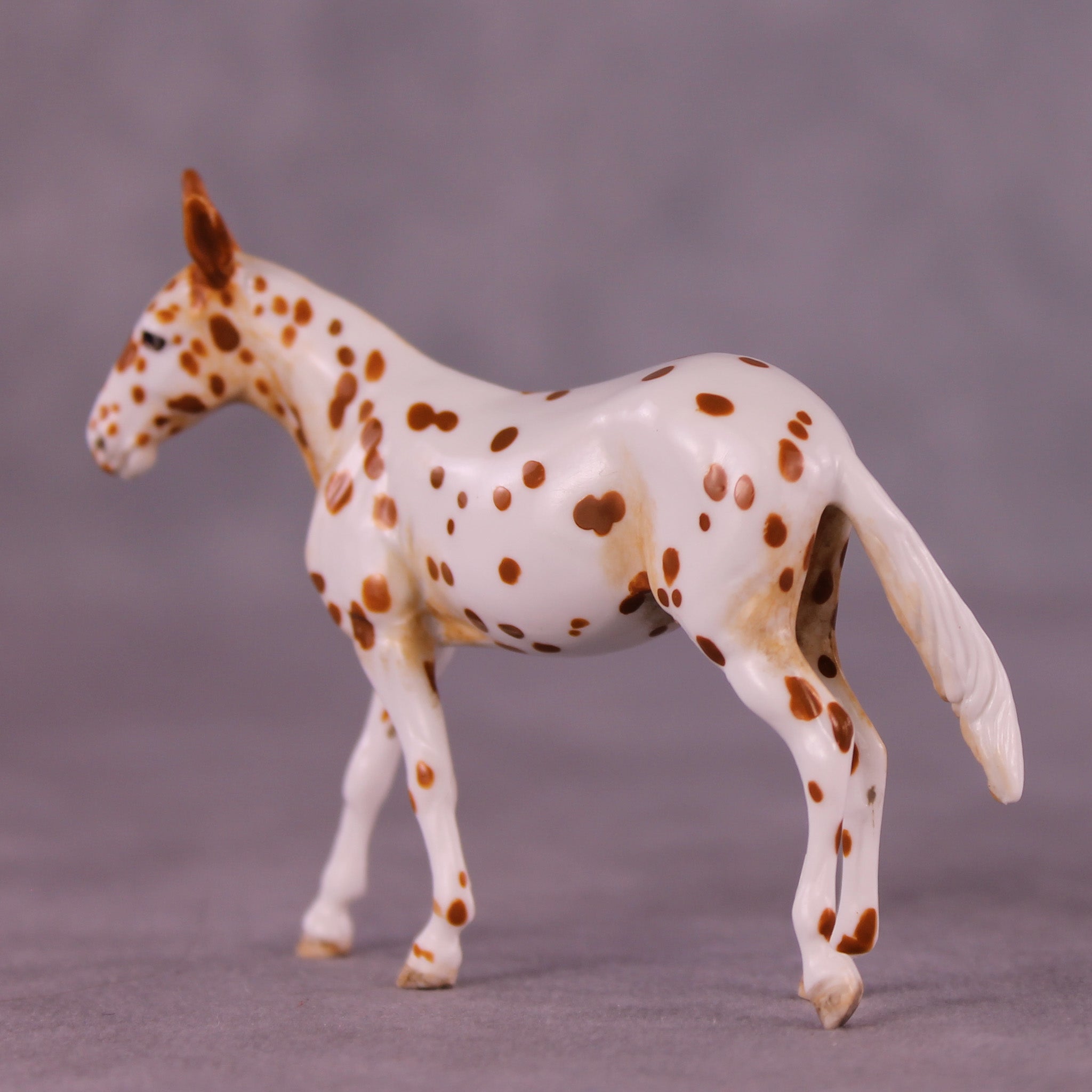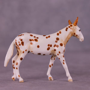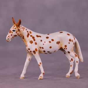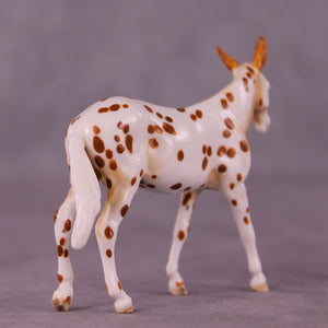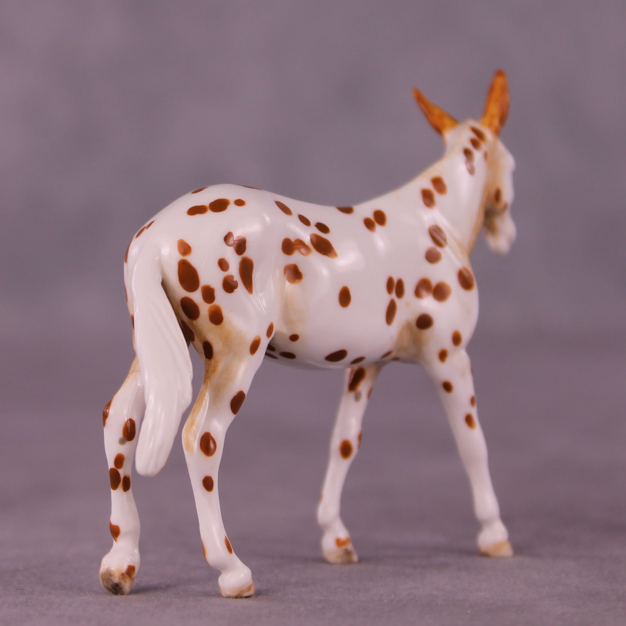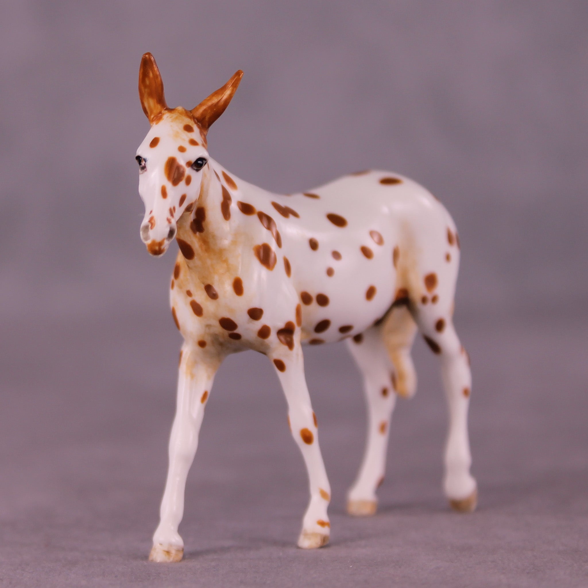 Andrea has created a wonderful collection of mules with various plays on famous Jacks! This one features a turned head, twitched listening ear, and a swishing tail. He is then painted to a gorgeously detailed leopard appaloosa with loads of hand painting and hair detailing! No finish changes are offered on this piece.