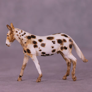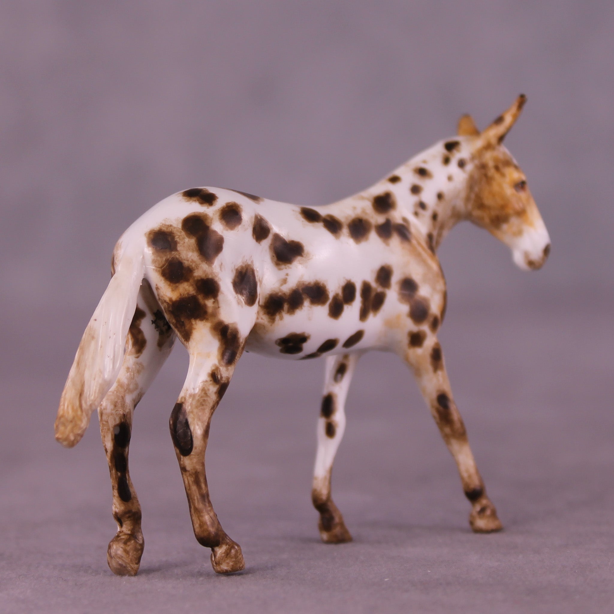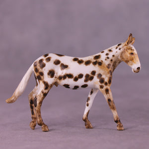 Andrea has created a wonderful collection of mules with various plays on famous Jacks! This one features a turned head, twitched listening ears, and a swishing tail. He is then painted to a gorgeously detailed leopard appaloosa with loads of hand painting and hair detailing! All finish options are available on this piece.