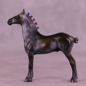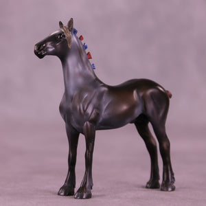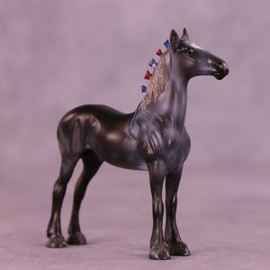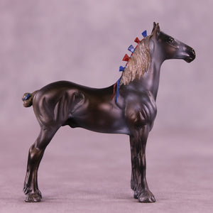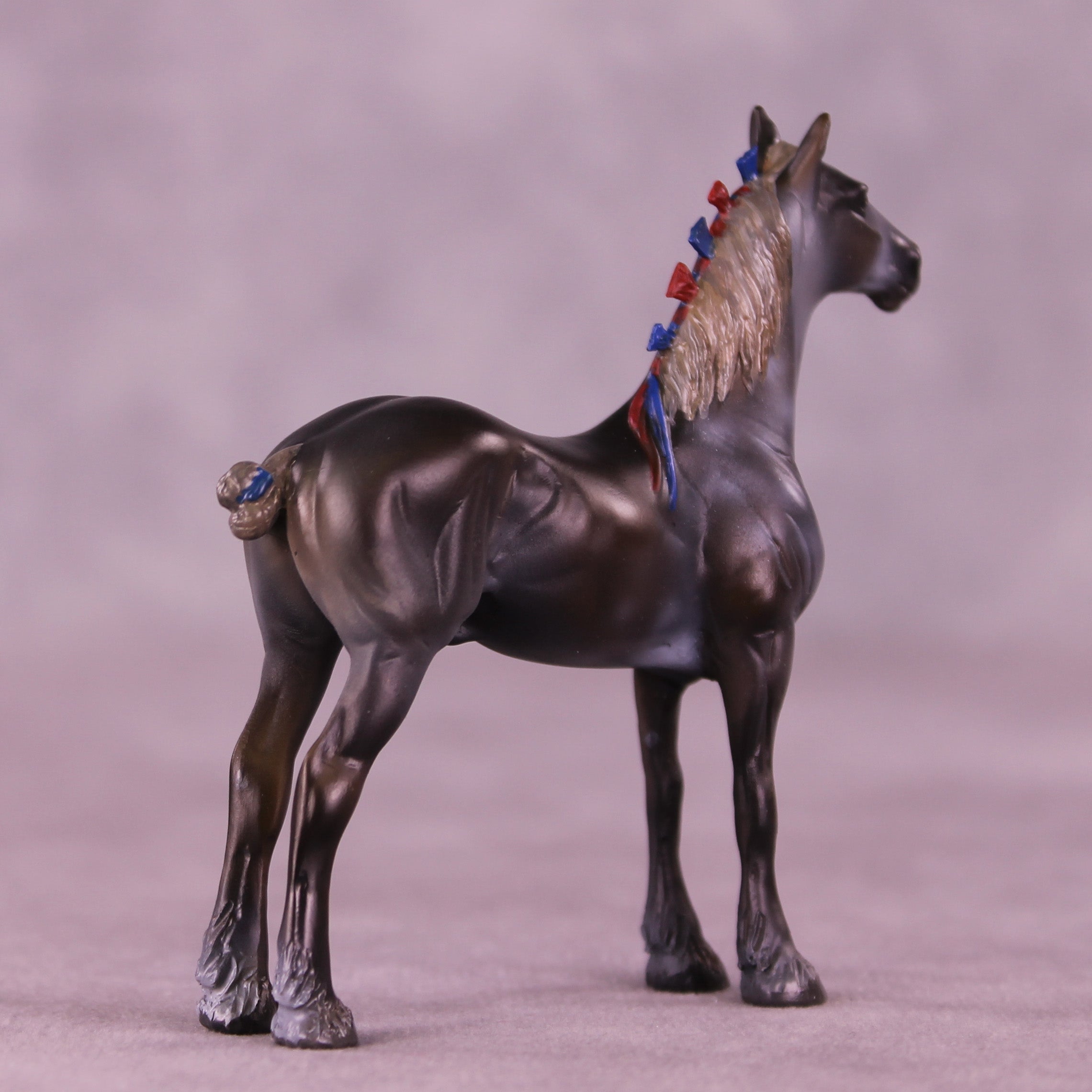 This young man has something to prove. Kristen worked with our Chip Drafter and gave him a proudly straightened and lifted head, facial details added, clipped feather for a Percheron show look, and new customized mane flights. She then painted him to a gorgeous young stallion in steel grey with a hand painted shaded mane and tail, etched face marking, hand painted red and blue flights, and tons more detail. He is offered in a lovely satin matte finish with no finish changes available.