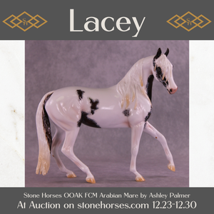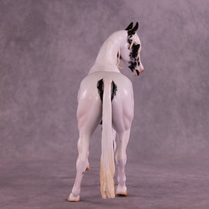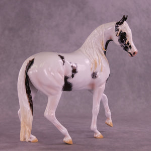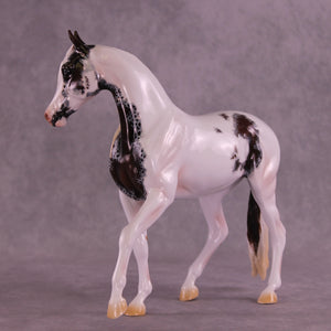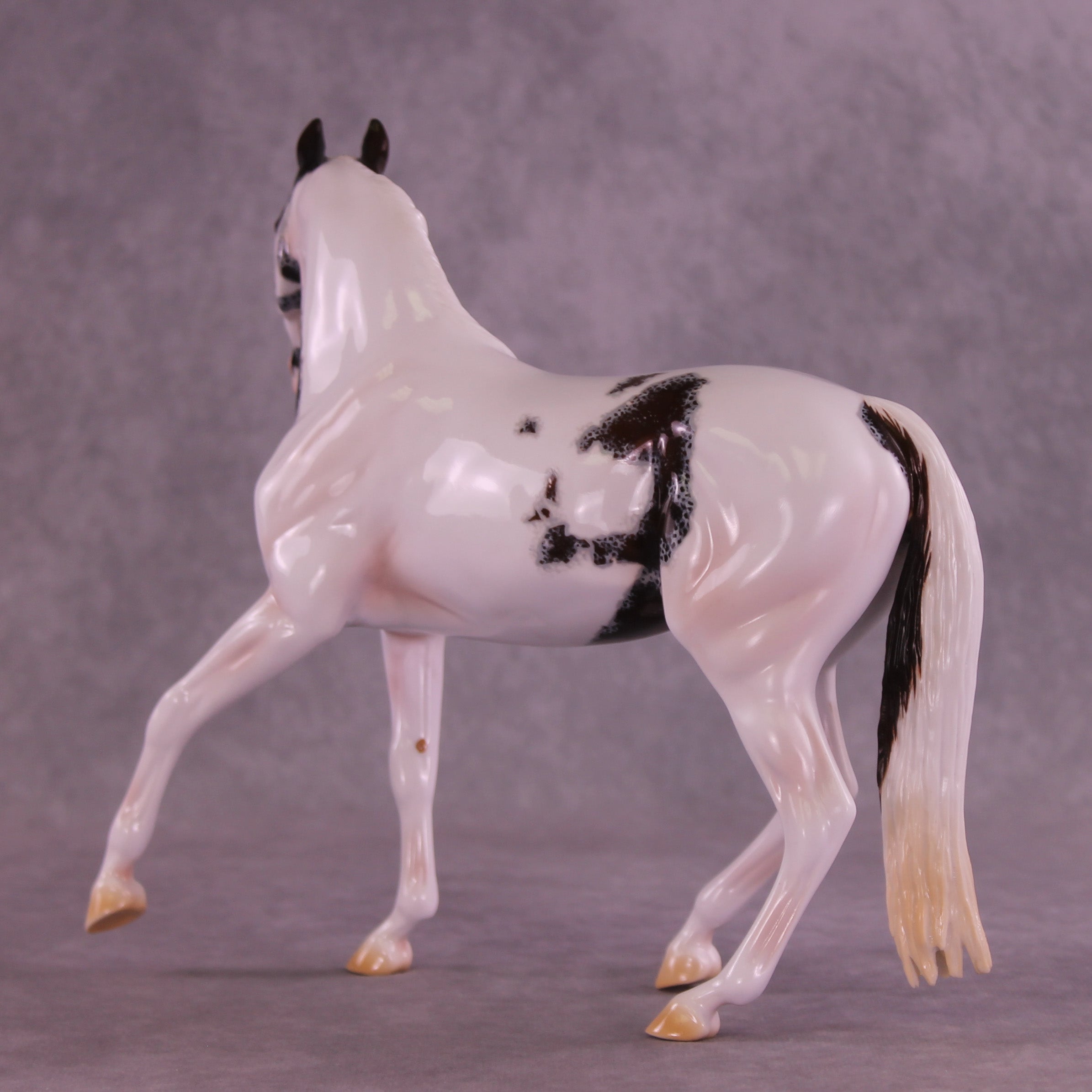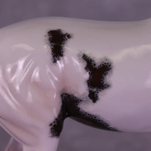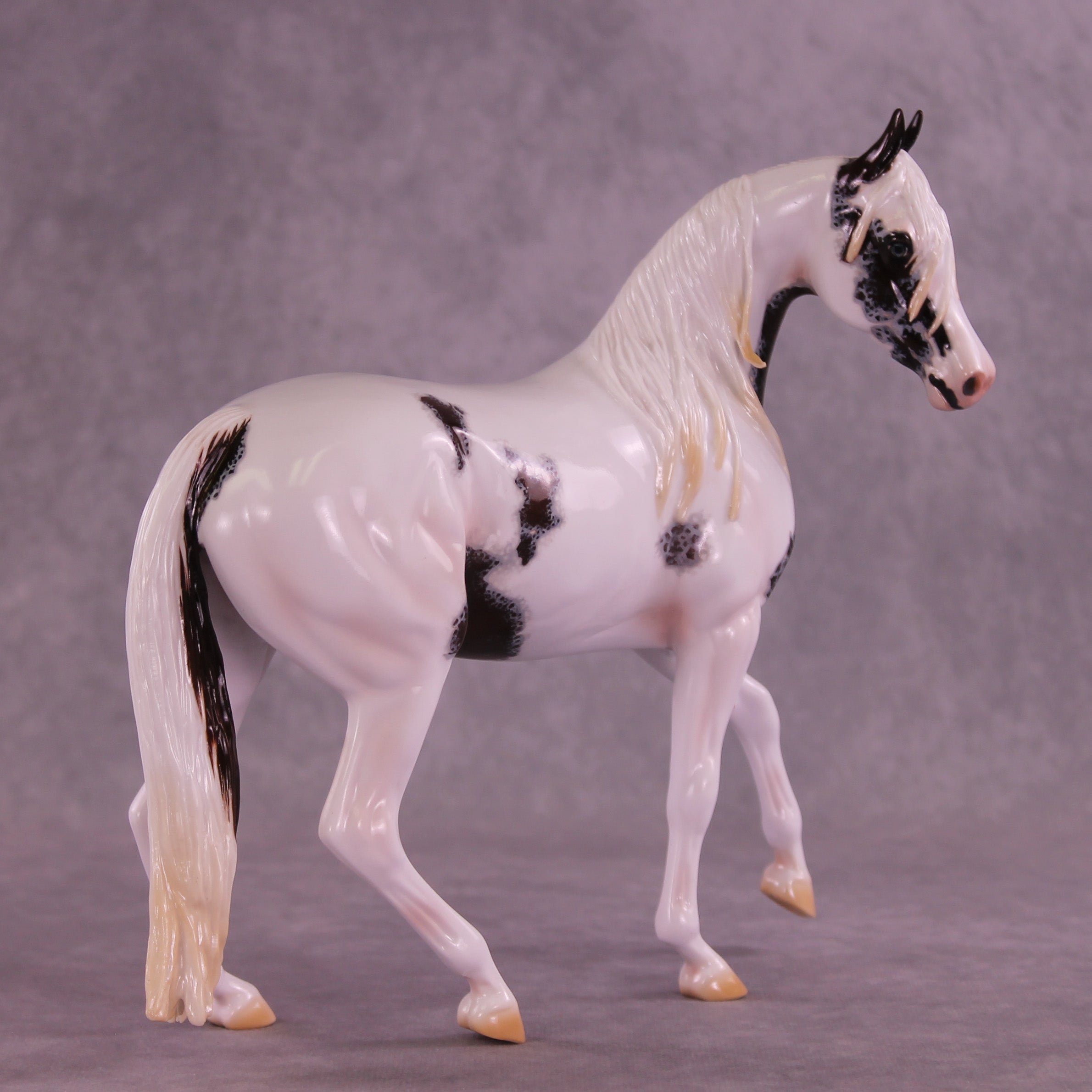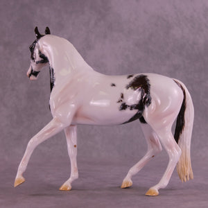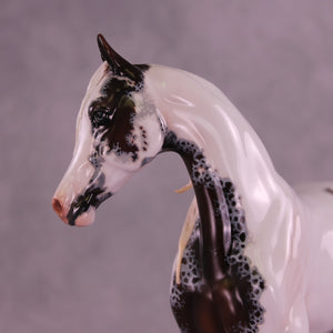 This piece was sold earlier this year and glossed, and – because we value transparency in all things, she was returned with some little smudges in her gloss. We have fixed those and are pleased to re-offer her to you here. Ashley spent HOURS doing final detailing on this piece, and boy does it show. Mona created a lovely canvas to start, taking our Arabian Mare mold and giving her a demure straight flowing tail and long delicate mane and forelock, plus a head turn and tuck to give her a nice rounded aesthetic. Ashley painted her to a jaw dropping dark chestnut maximum sabino with full lace edging all around her spots, in addition to delicately shaded whites and her usual level of depth in the chestnut color. Ashley says "It'll be a while before I do something like this again", so don't miss out! She comes in glossy, with no finish changes offered.