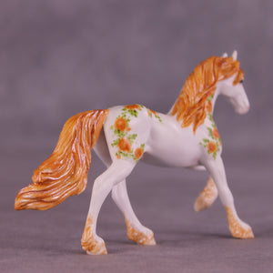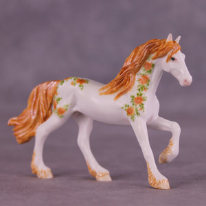 This piece is another addition to Andrea Thomason’s lovely monthly Friesian Flowers collection! She took our Chip Friesian mold and gave him subtle customization changs in his mane and tail, and then gave him a lovely hand-painted floral rose design with leaves and blooms flowing in orange and green through the sculptural features of this beautiful little piece. All finish options are available.