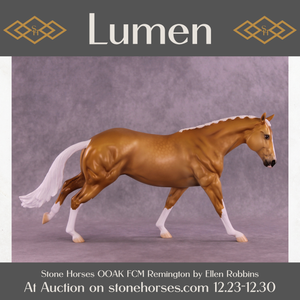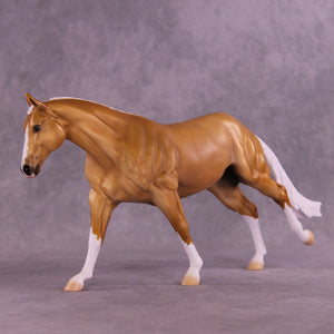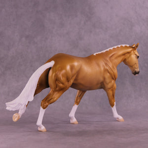 This distinguished gelding is ready to take his new owner into the winner’s circle. Remington shines brightly here with our newest button braided mane, and neatly trimmed show tail carried elegantly behind. Ellen painted him to an intricately detailed shining dappled palomino with four tall white socks, all featuring unique designs, plus of course detailed shaded blaze. He is offered in all finish options.
