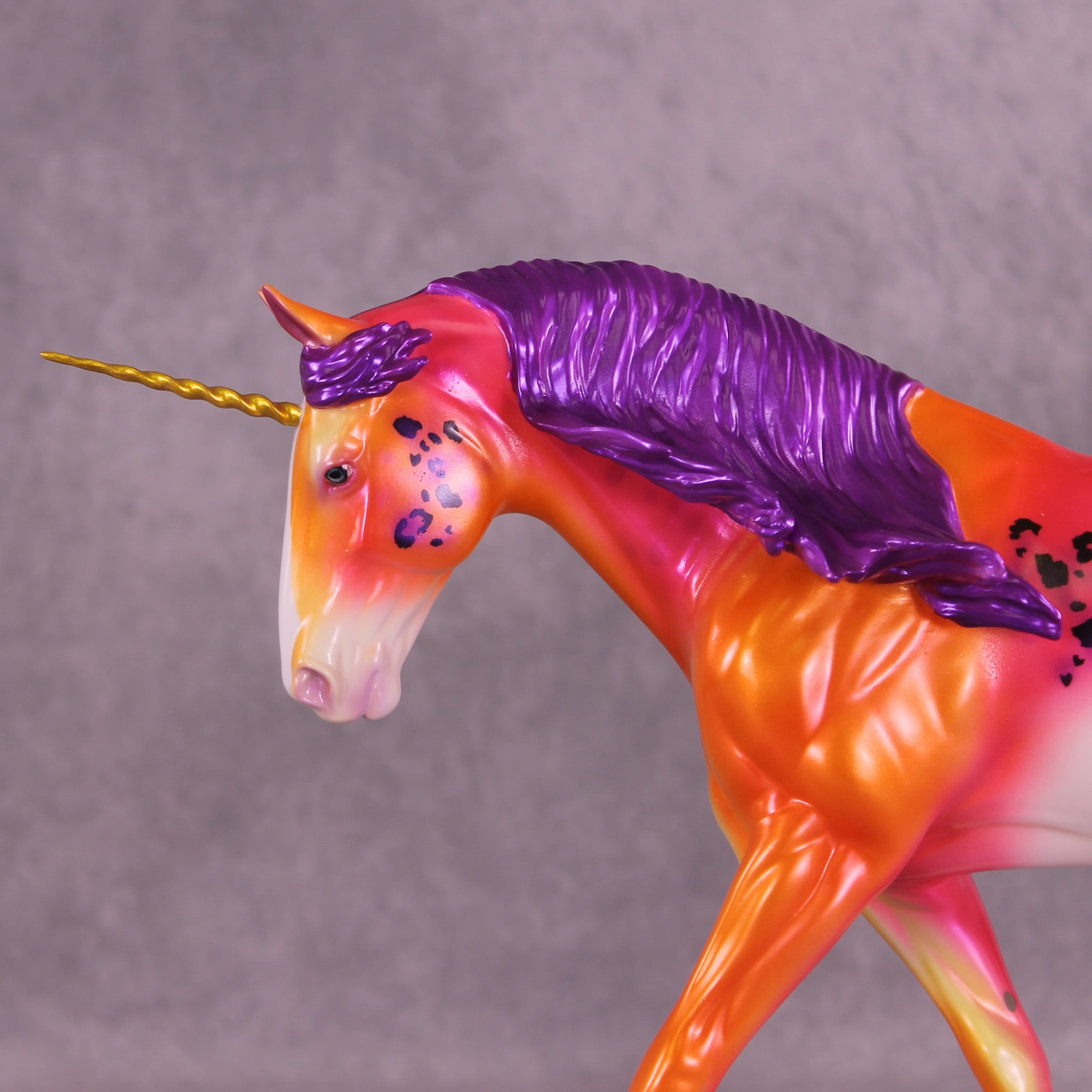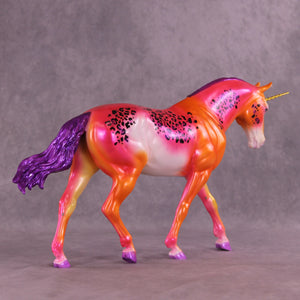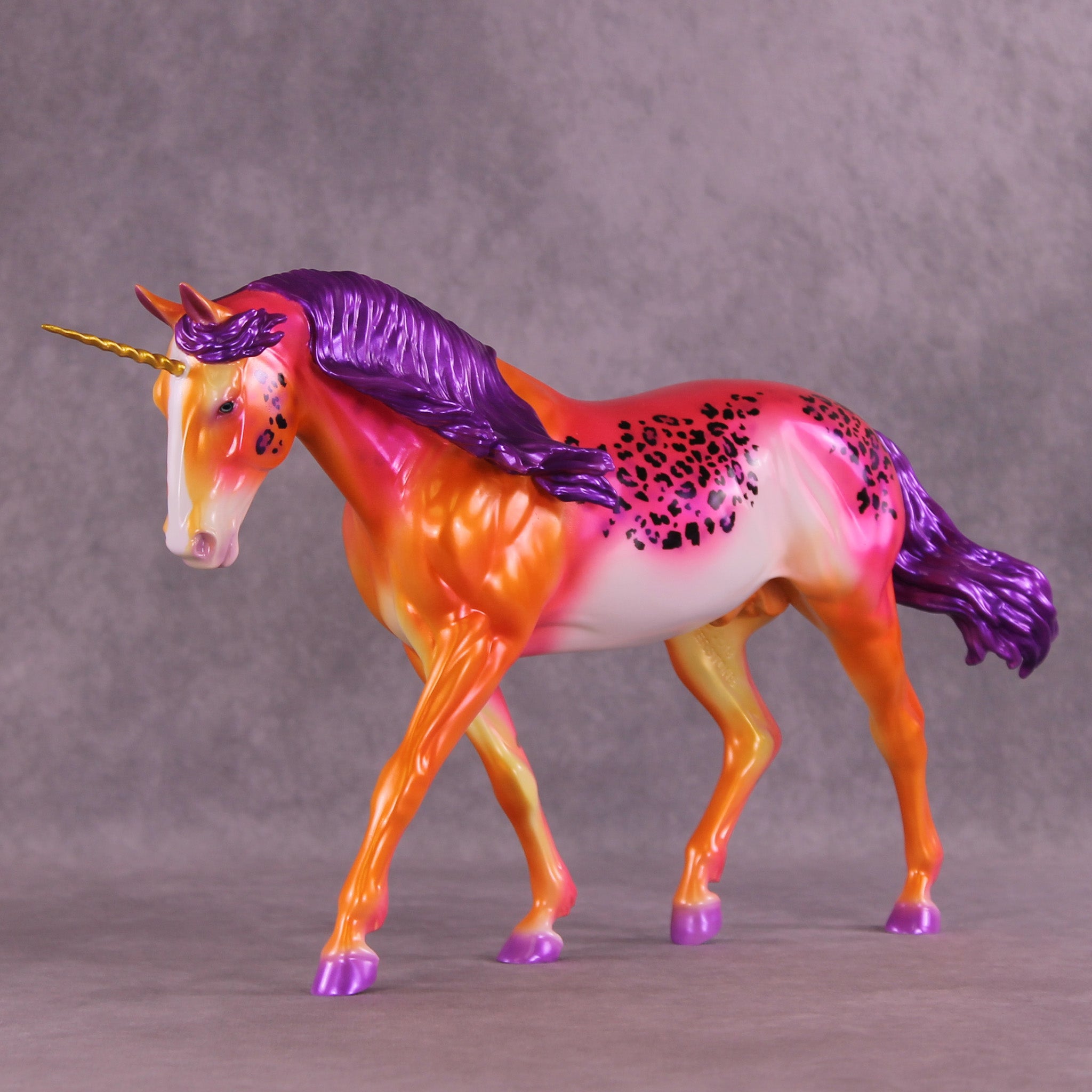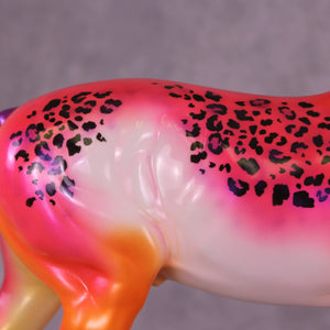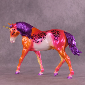 You can see this guy from space! Erin worked with our Irish Draught mold customized with a long mane, flying tail, and customized added delicate unicorn horn to create this design that is straight out of a Velcro notebook from 1999. He features a shaded neon orange, pink, and purple body color with overlaid shaded black and purple big cat leopard print detailing. All of his colors are UV reactive fluorescent so he comes alive in blacklight, and he is finished in gloss with no finish changes offered.