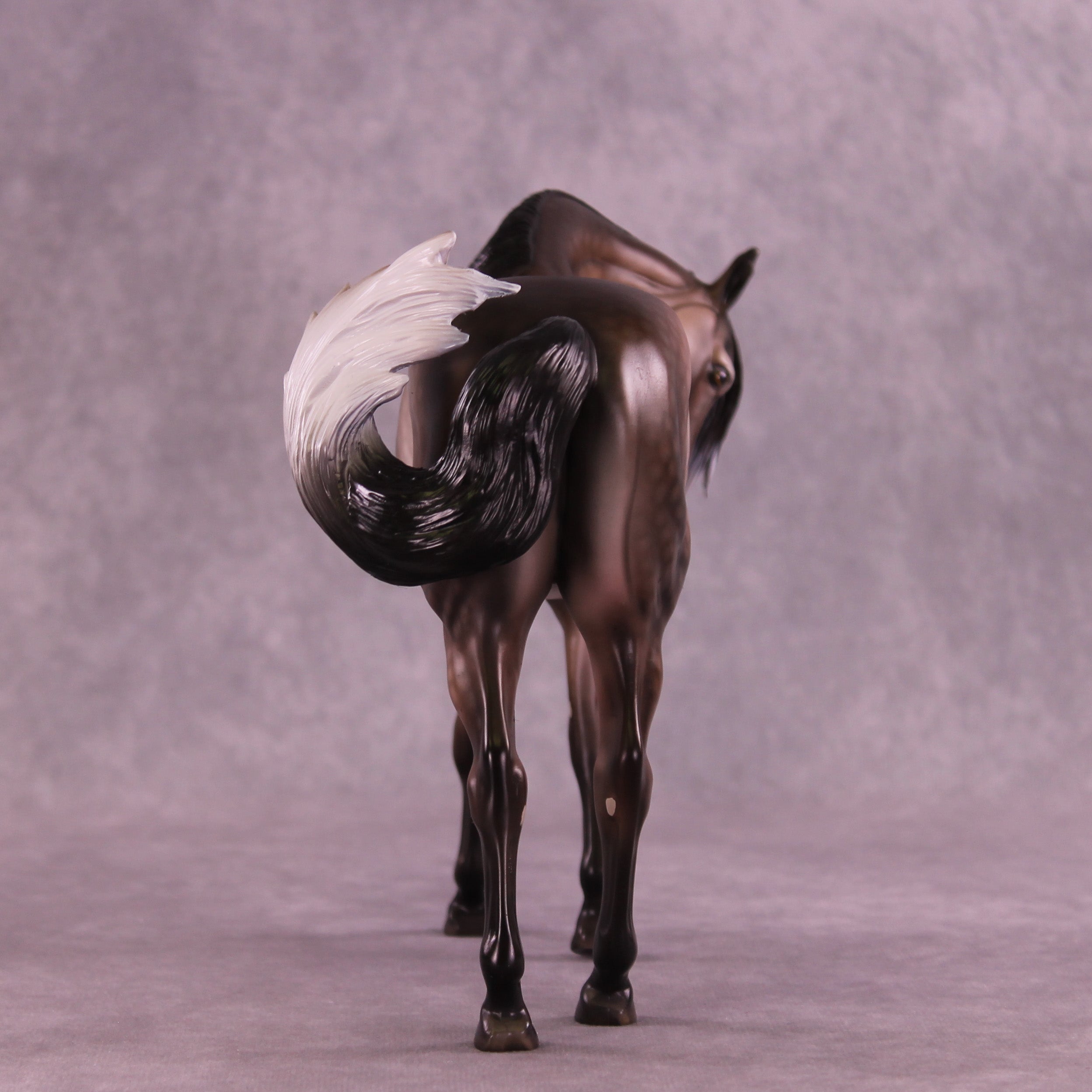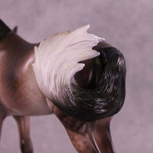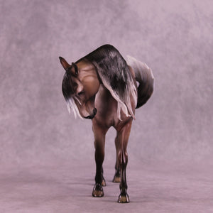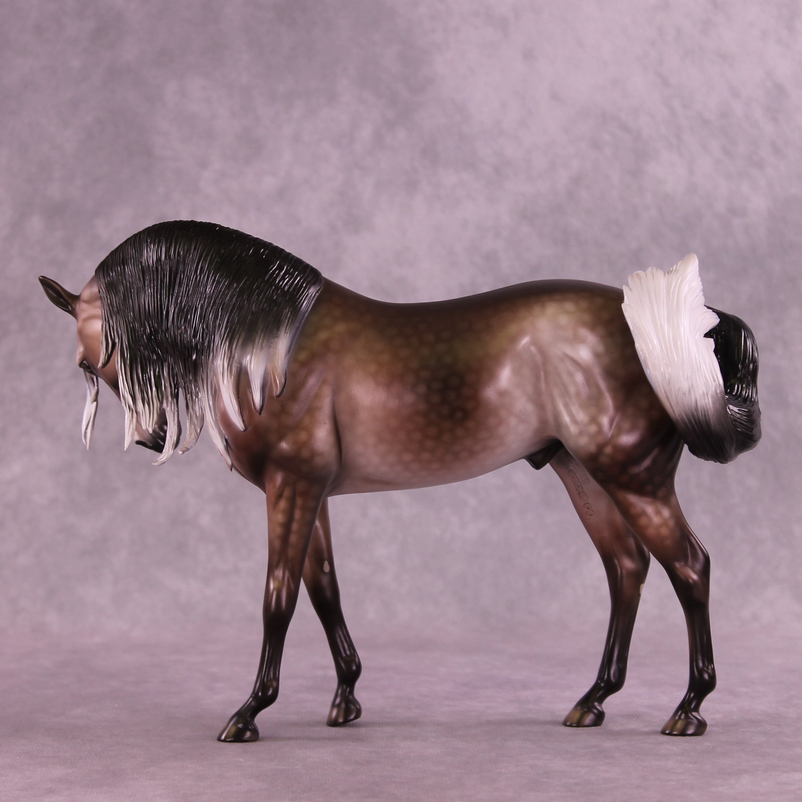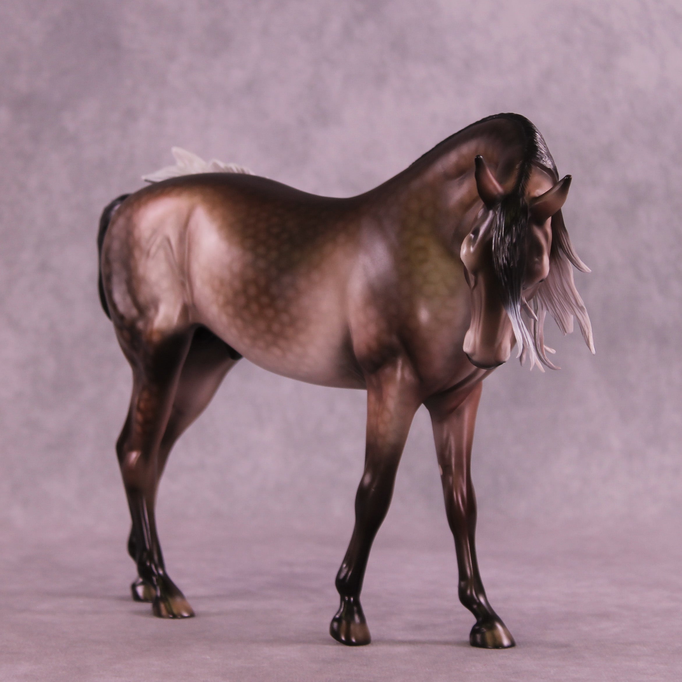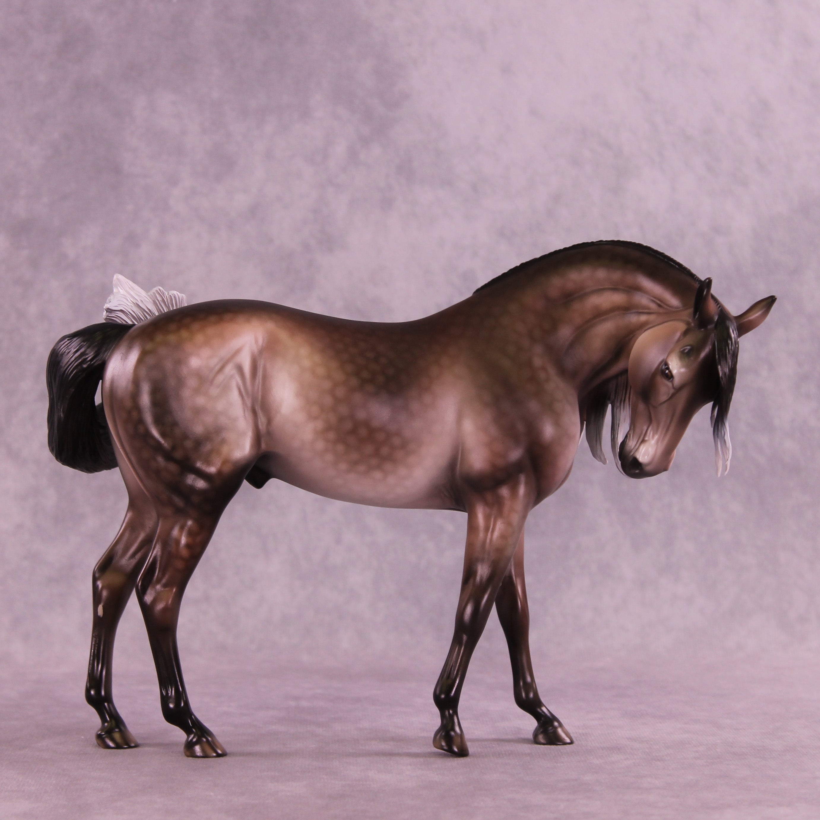 Matt gave our Andalusian sculpture a dramatic makeover in this piece, with a dramatically tucked and turned head and neck, all new sculpted mane with extra tendril detailing, an adjusted gait with moved front legs into the start of a walk, and our new curling tail with extra detailing and definition added. Dawn then took this piece to the next level with a stunning rose dapple grey design, with beautiful shading transitions from dark to light through his mane and tail. He is a cornerstone collection piece, and he is available in all finish options.